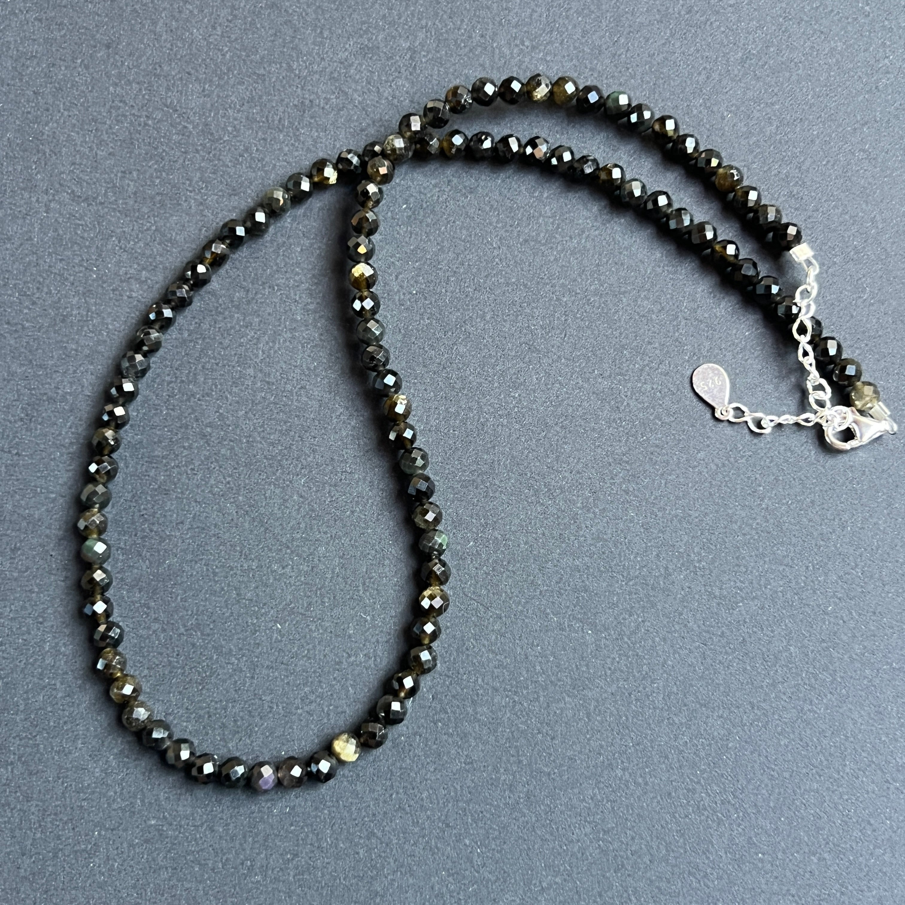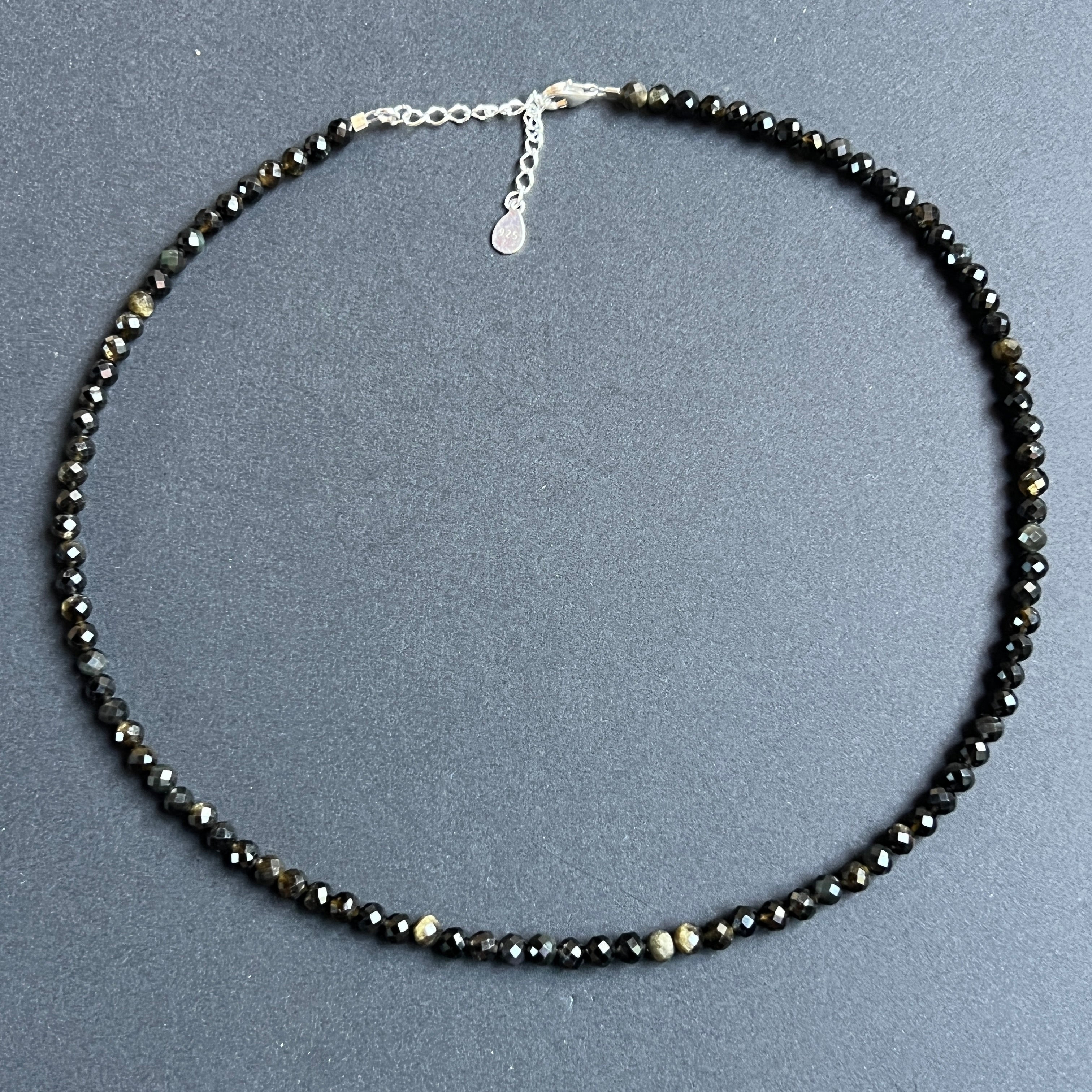 Firul este compus integral din sfere fațetate de obsidian auriu natural de 4 mm, pietre închise, aproape negre, care în anumite unghiuri reflectă o lumină caldă, aurie, ca o sclipire ascunsă în întuneric. Fațetele fine prind lumina în licăriri subtile, iar jocul de umbre și străluciri creează un efect hipnotic și misterios.
