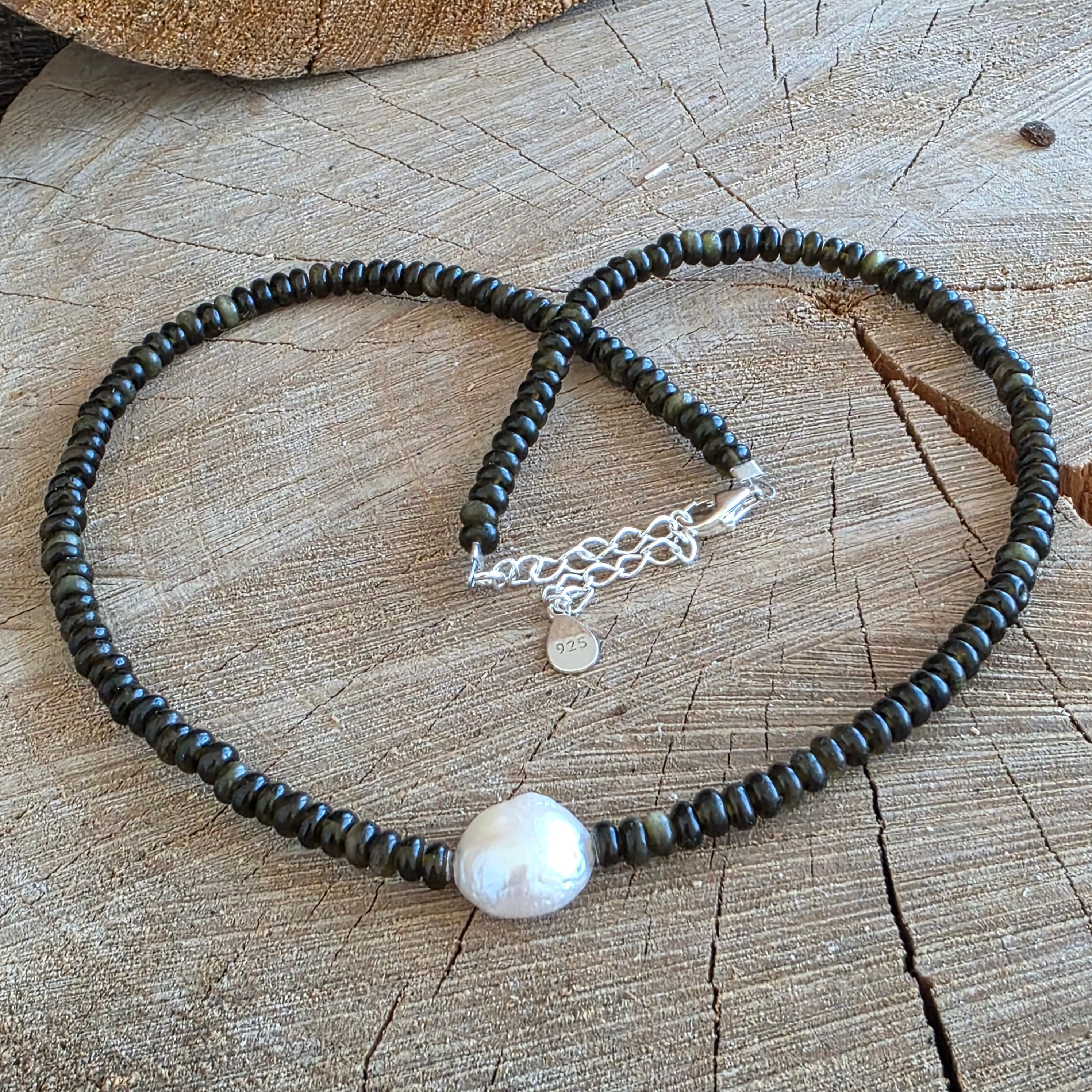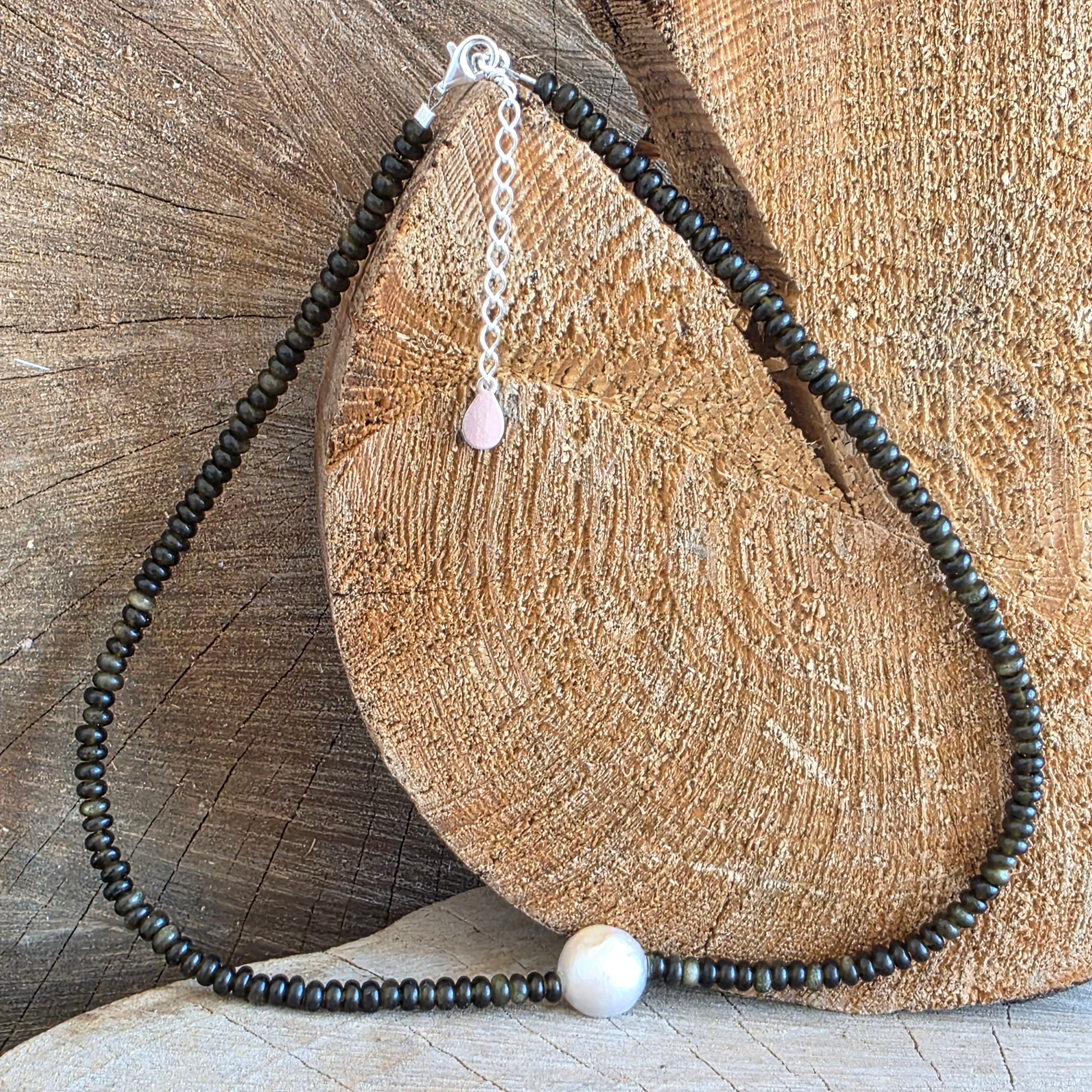 Un colier cu design rafinat și contrast echilibrat, realizat din discuri fine de obsidian auriu de 4 × 2 mm, așezate într-o succesiune fluidă care conturează delicat linia gâtului. Suprafața neagră, străbătută de reflexii aurii subtile, creează un joc elegant de lumină și profunzime, în timp ce perla centrală, cu dimensiunea de aproximativ 1 cm, aduce un accent luminos și organic, care echilibrează vizual compoziția.