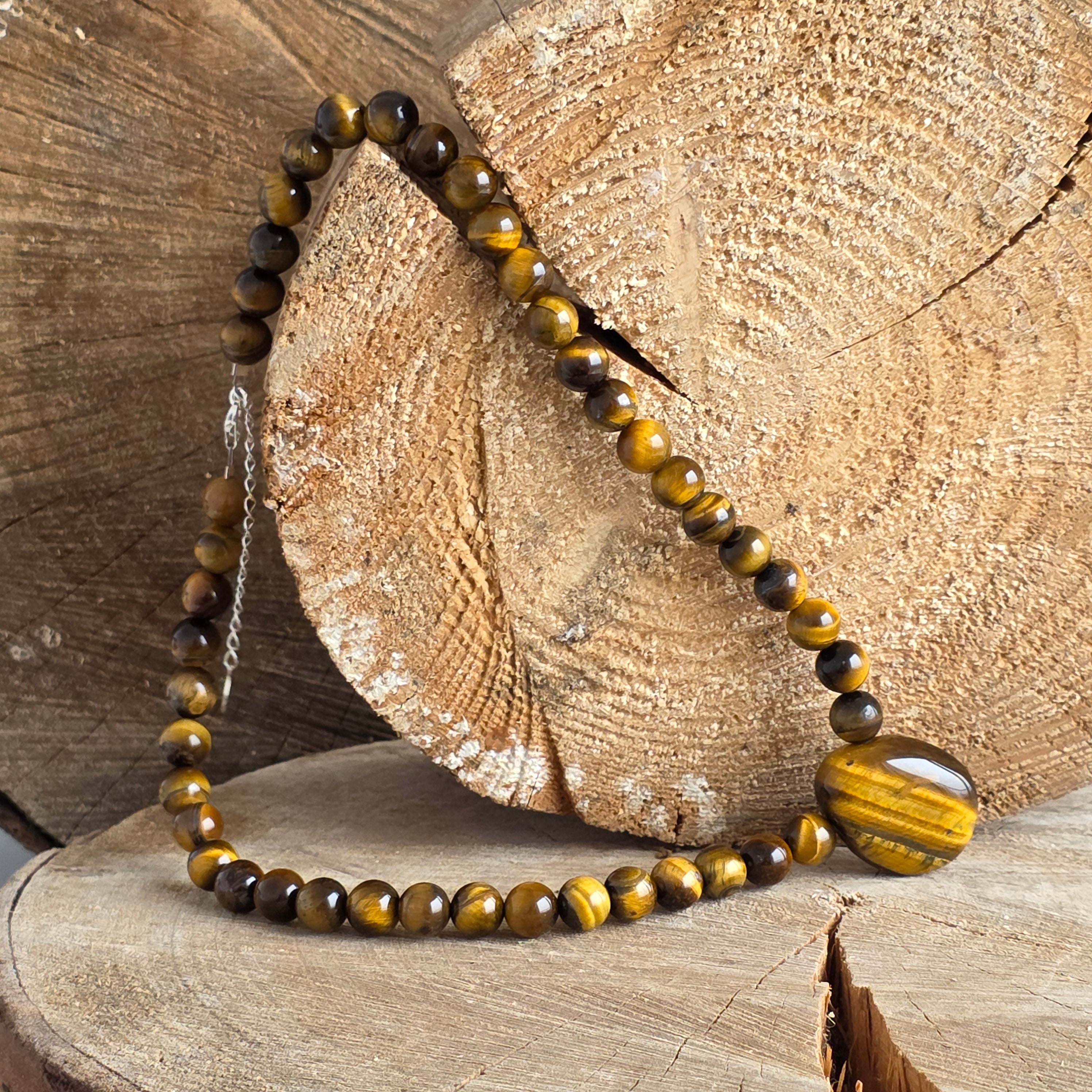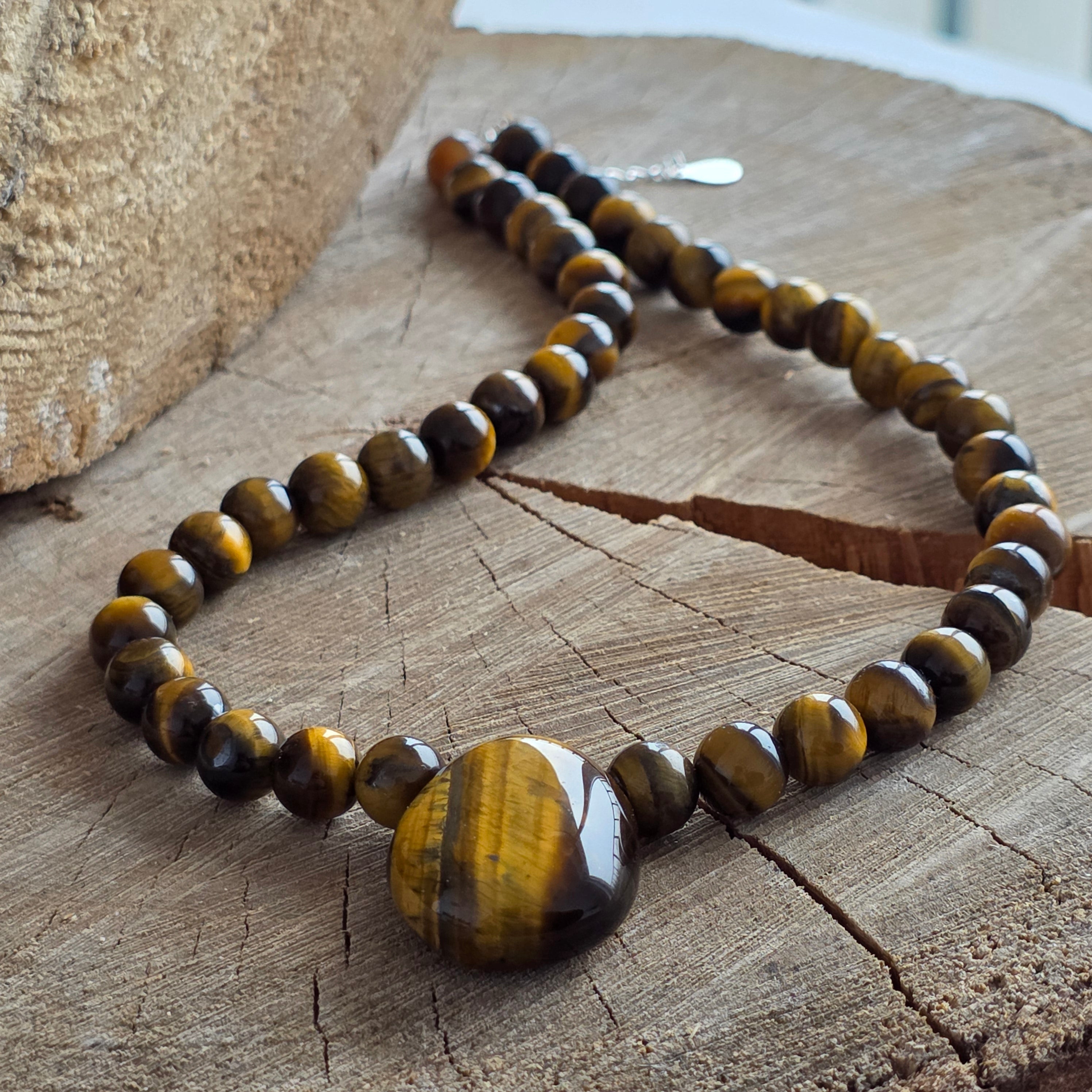 Un colier cu străluciri calde și protecție ancestrală – creat din sfere de ochi de tigru de 8 mm, cu nuanțe aurii și maronii ce dansează la lumină ca razele soarelui prin pădure. Fiecare piatră pare să respire putere tăcută, stabilitate și instinct treaz.