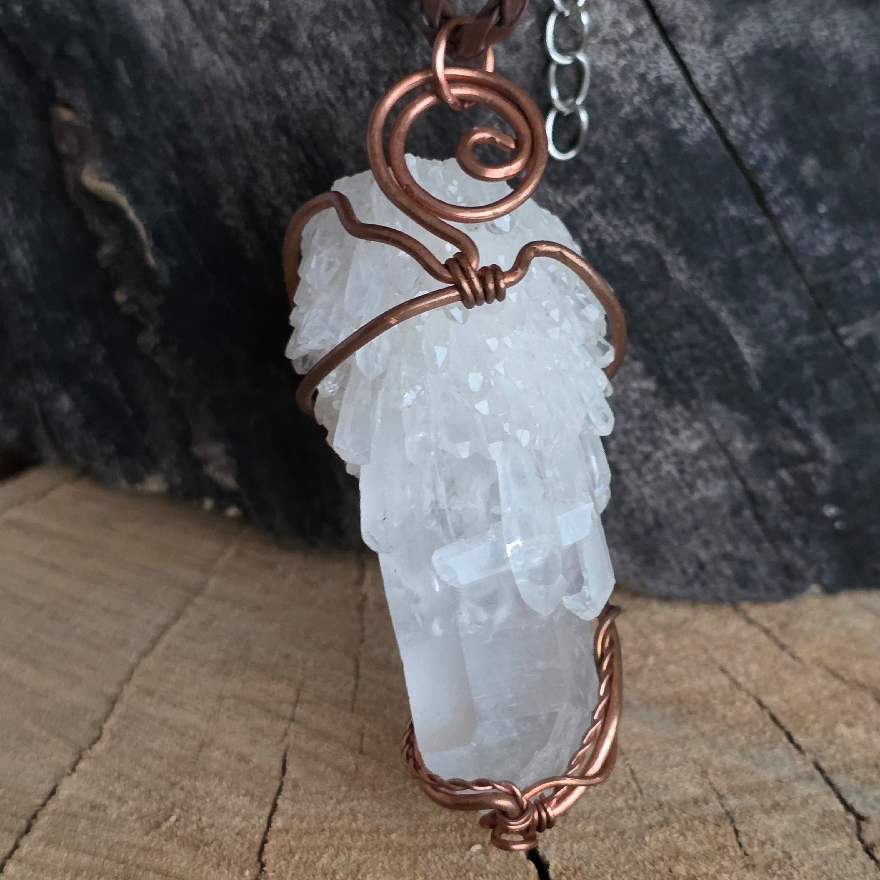 Descriere - Colier pandantiv cluster cuart incolor in cupru/artistic wire m6