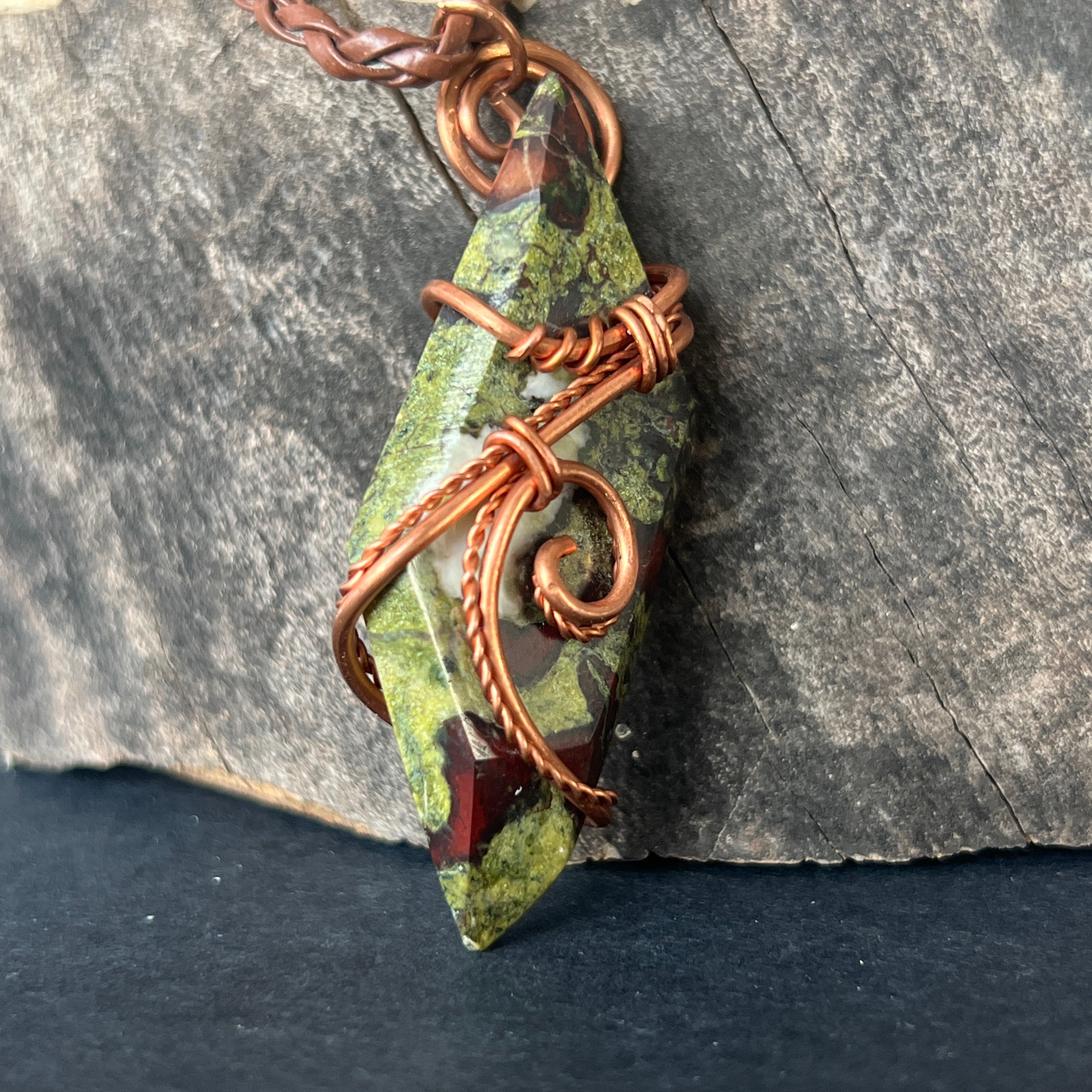 Acest colier unicat îmbină forța cu frumusețea brută a Africii printr-un pandantiv spectaculos din Sângele Dragonului, o piatră rară și fascinantă din Africa de Sud. Piatra polisată, prinsă într-o montură de cupru artistic răsucit manual, dezvăluie contraste puternice de verde pământiu și roșu intens, asemenea unei legende sculptate în mineral.