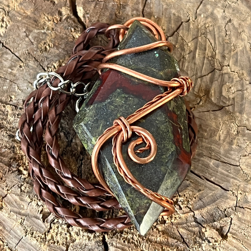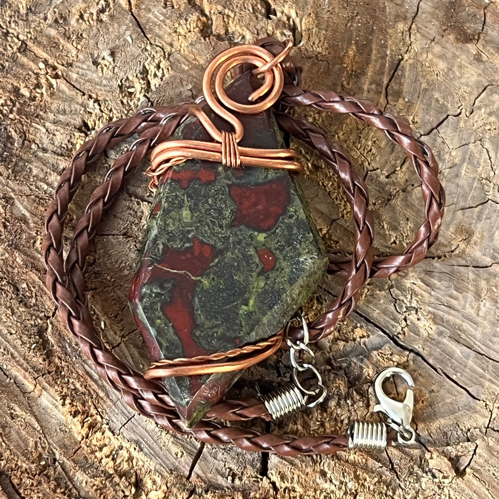 Acest colier unicat îmbină forța cu frumusețea brută a Africii printr-un pandantiv spectaculos din Sângele Dragonului, o piatră rară și fascinantă din Africa de Sud. Piatra polisată, prinsă într-o montură de cupru artistic răsucit manual, dezvăluie contraste puternice de verde pământiu și roșu intens, asemenea unei legende sculptate în mineral.