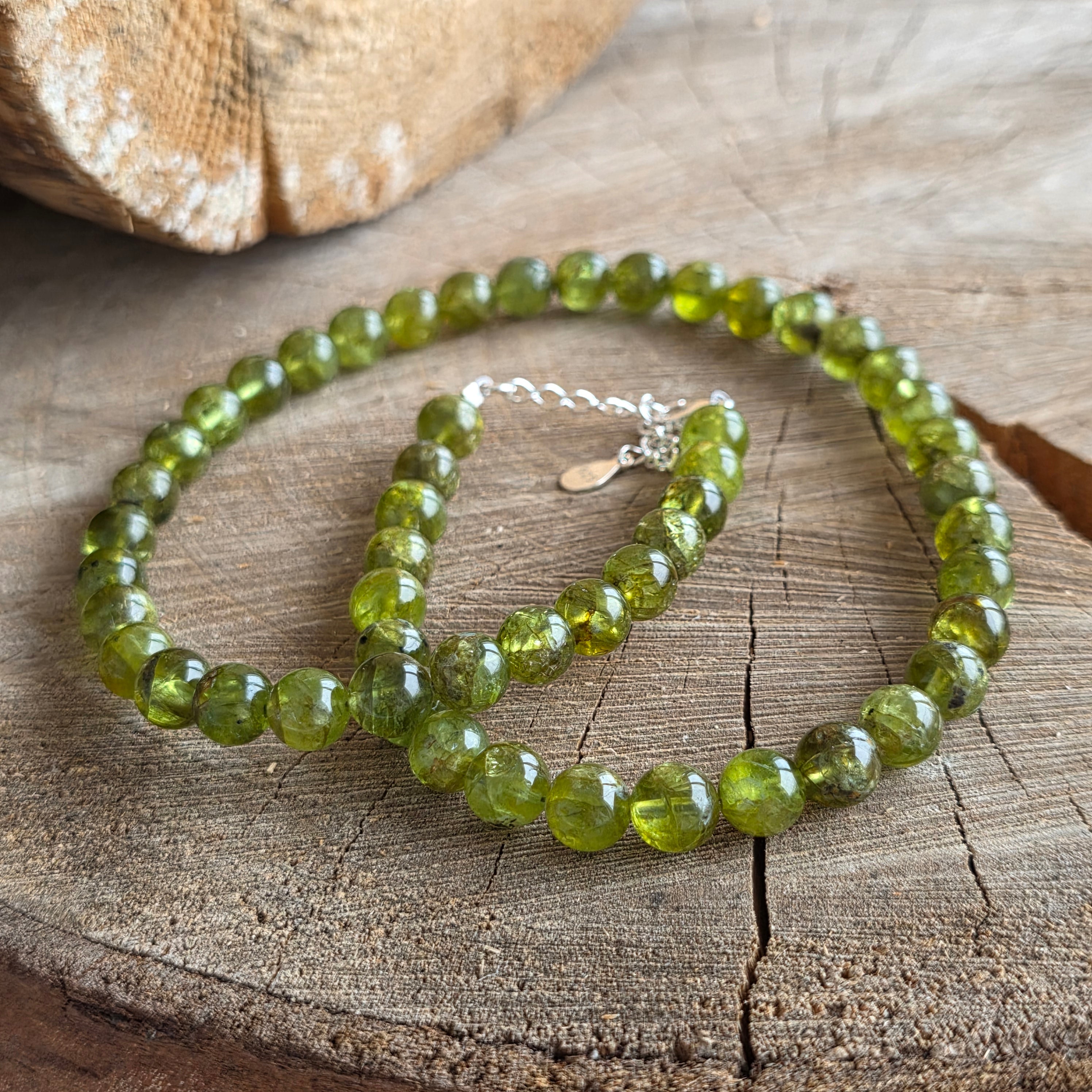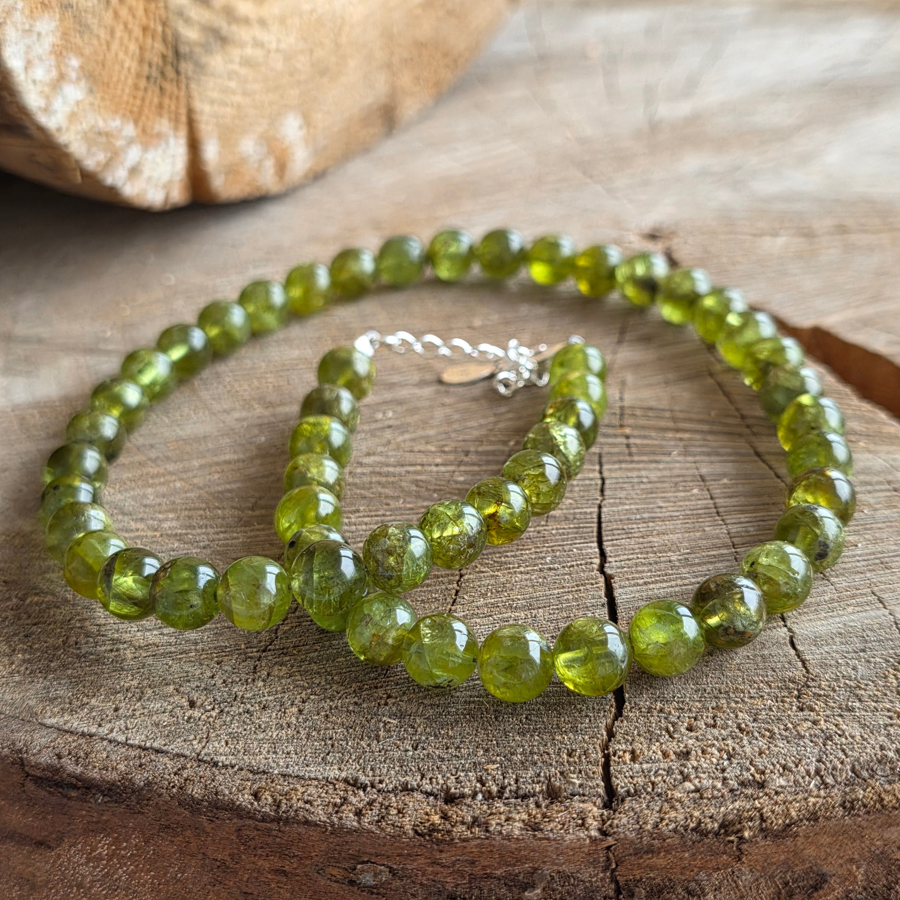 Un colier luminos și proaspăt, realizat din sfere de peridot de 8 mm, atent selecționate pentru calitatea lor AAA, cu o culoare verde intensă și clară, care pare să pulseze de viață. Fiecare sferă reflectă lumina cu o transparență caldă, evocând ideea de început nou, de respirație adâncă după o etapă încheiată. Designul este curat și echilibrat, lăsând piatra să fie centrul expresiei.