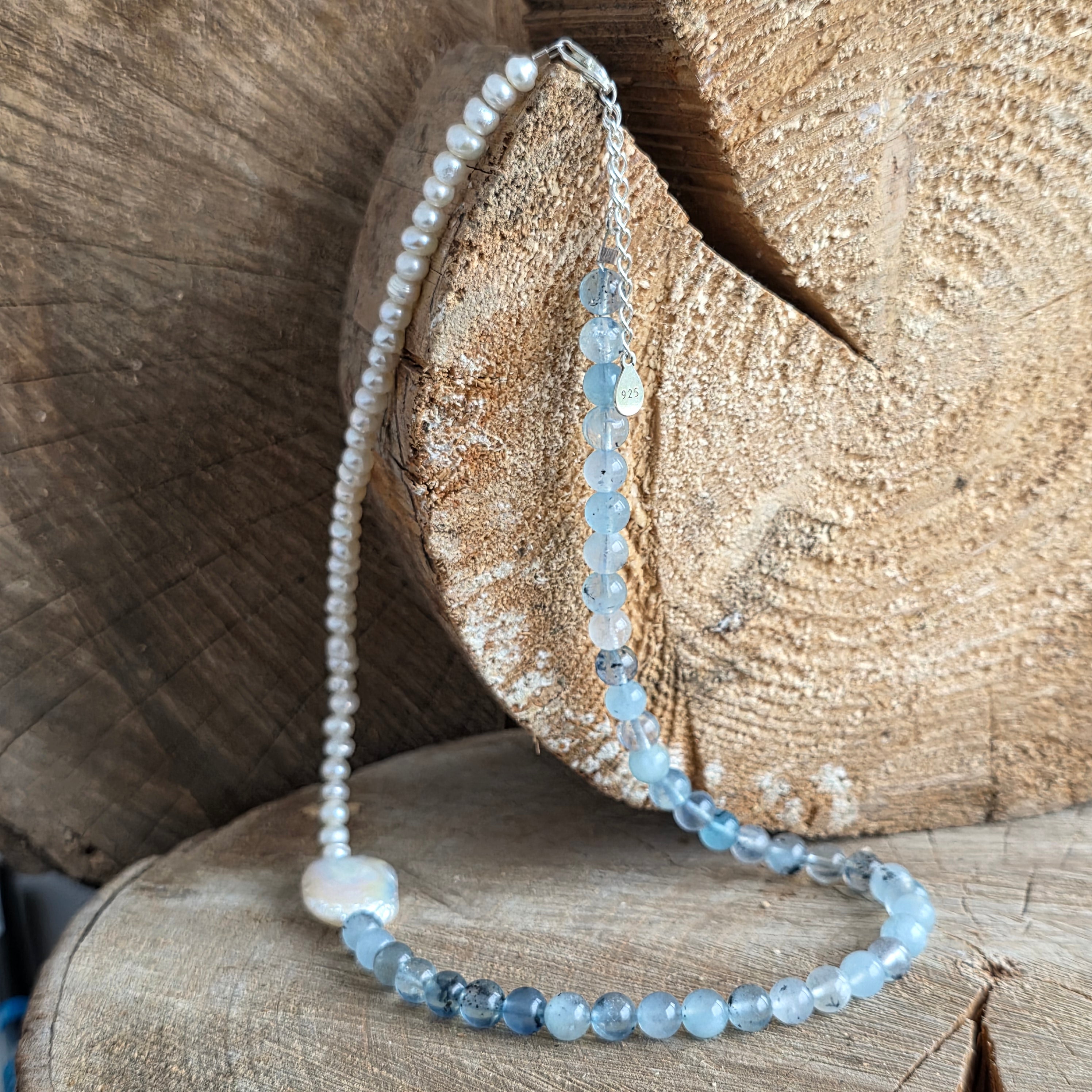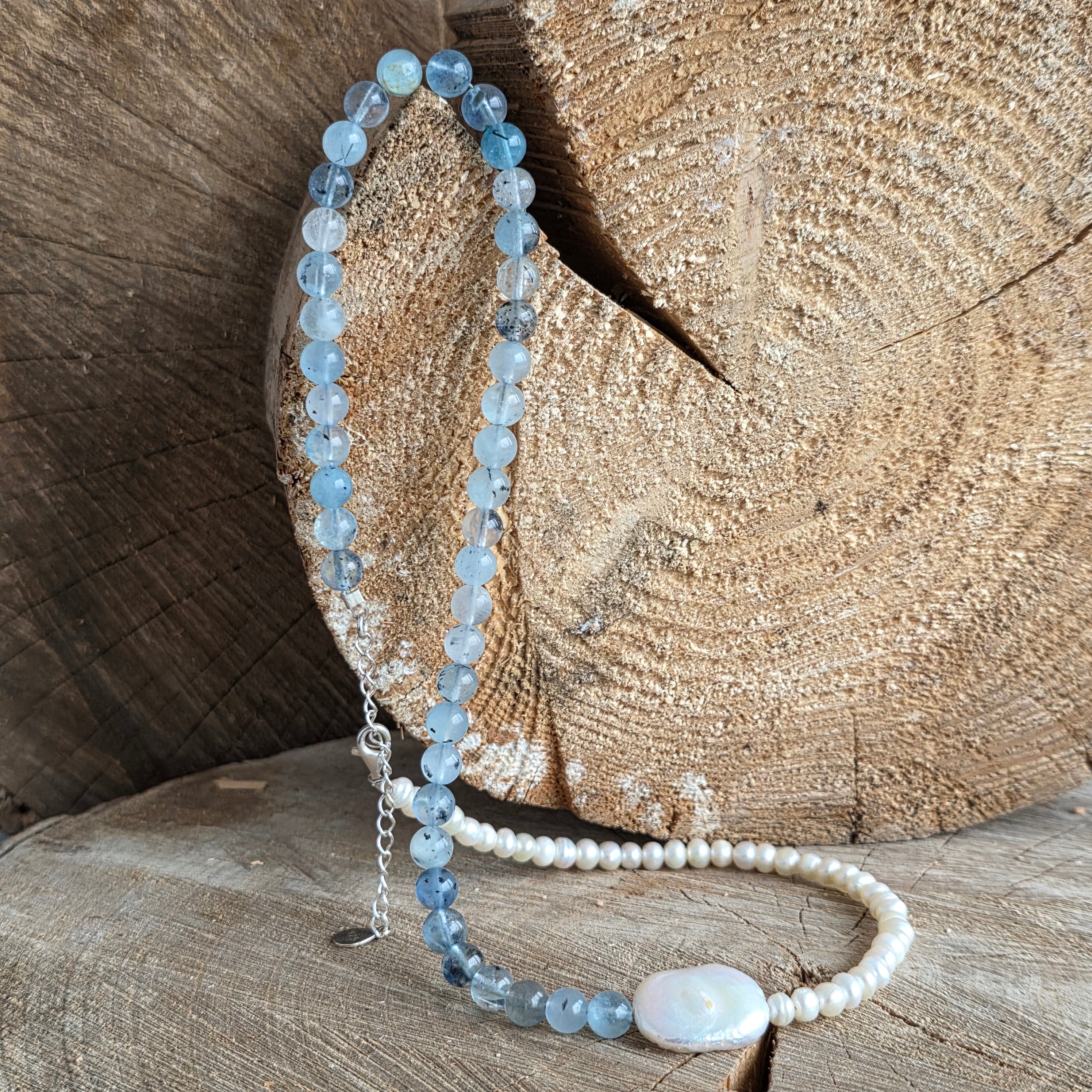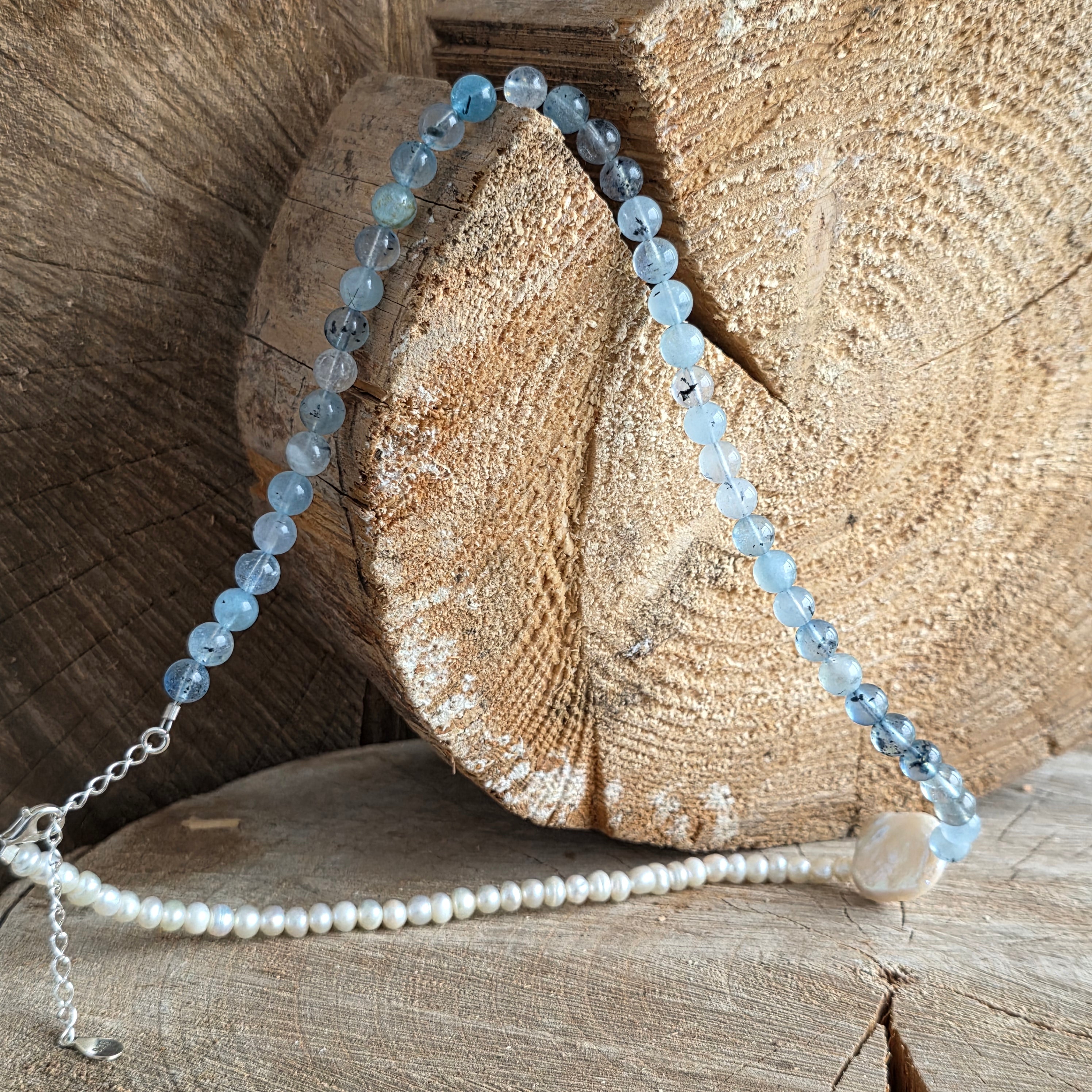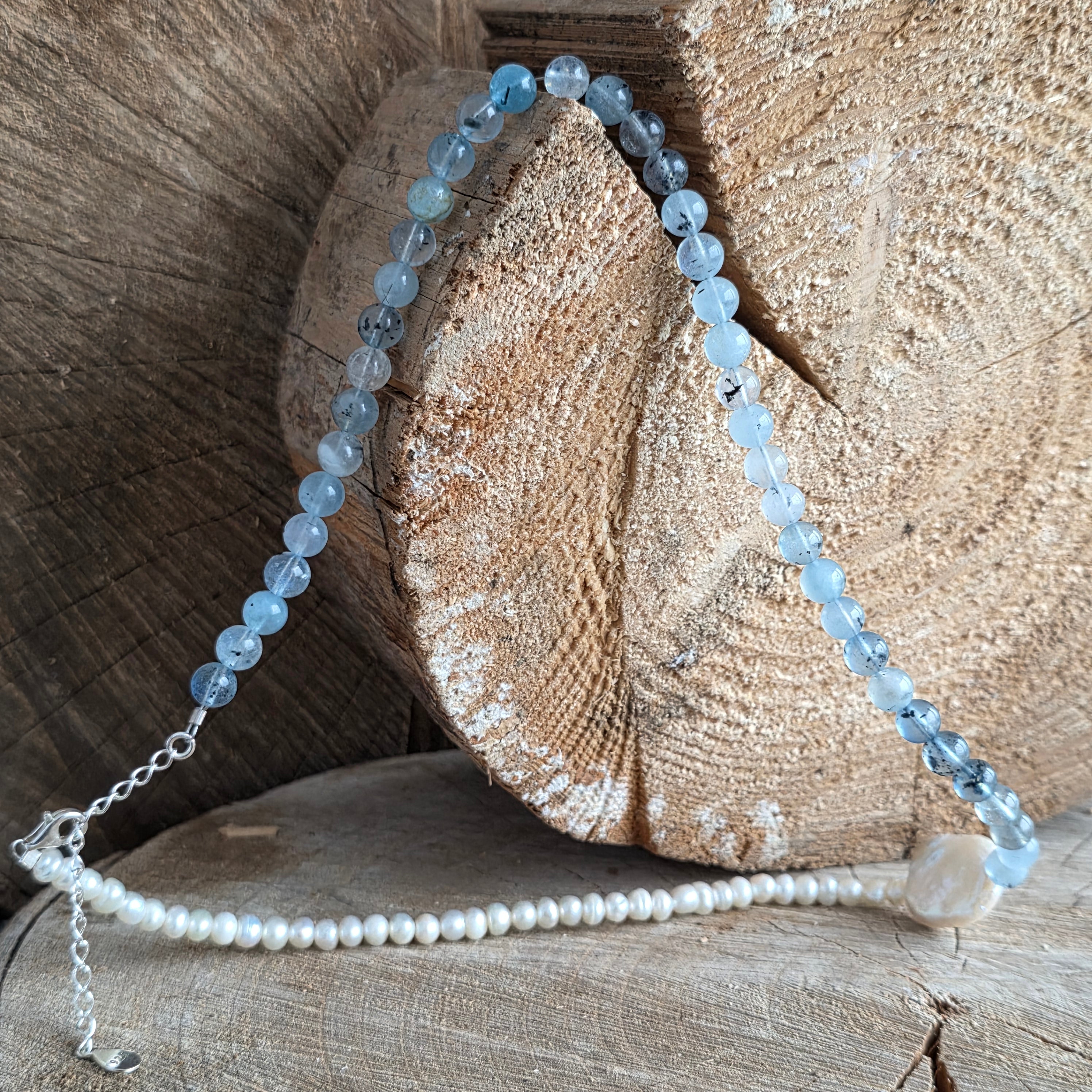 Realizat din acvamarin natural de 6 mm, cu nuanțe blânde de albastru pal și transparențe fine ce amintesc de adâncurile limpezi ale oceanului, colierul este completat de perle naturale, alese pentru strălucirea lor subtilă și rafinamentul atemporal.