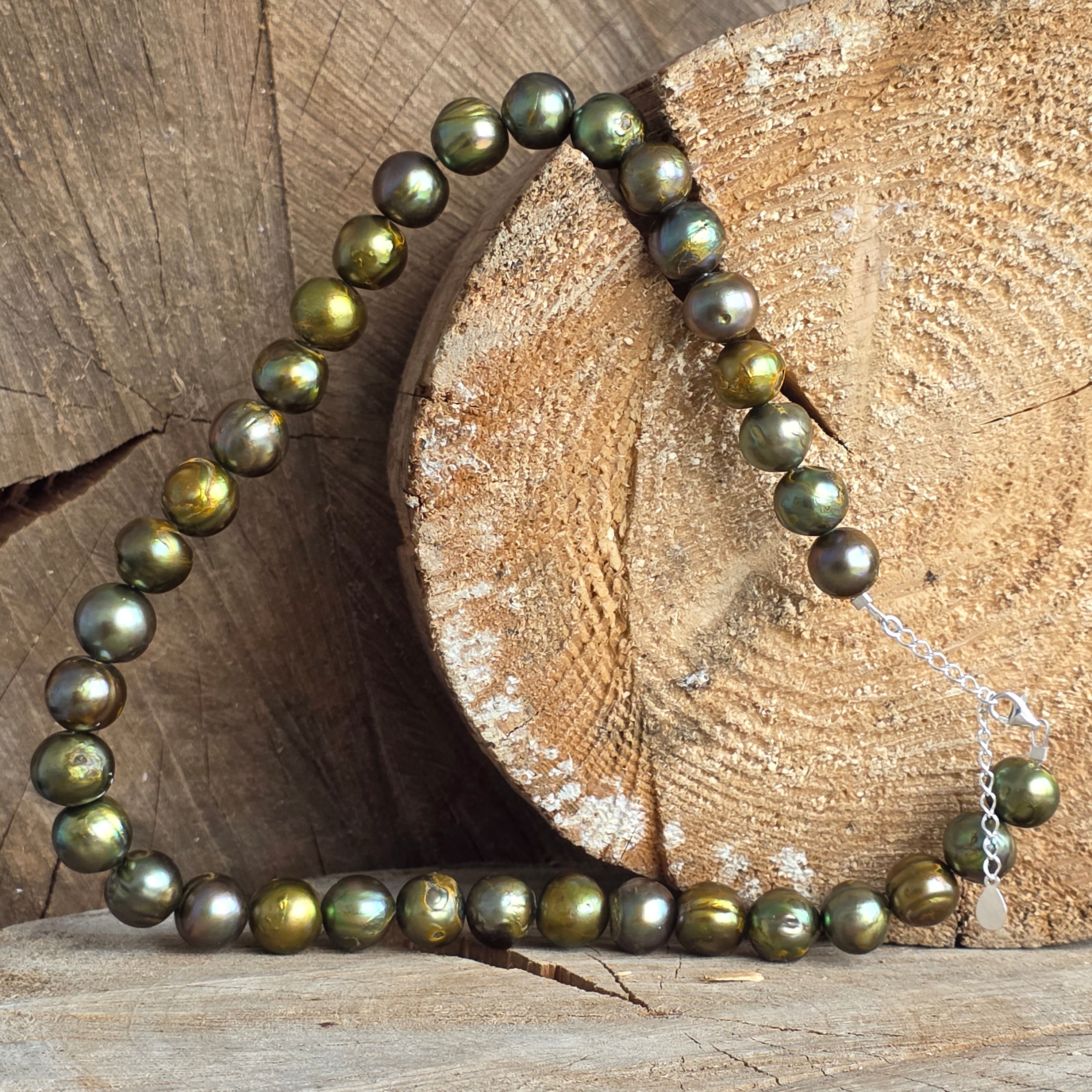 Materiale: perle de cultură verzi (sfere de 10 mm), argint 925, închidere lobster din argint