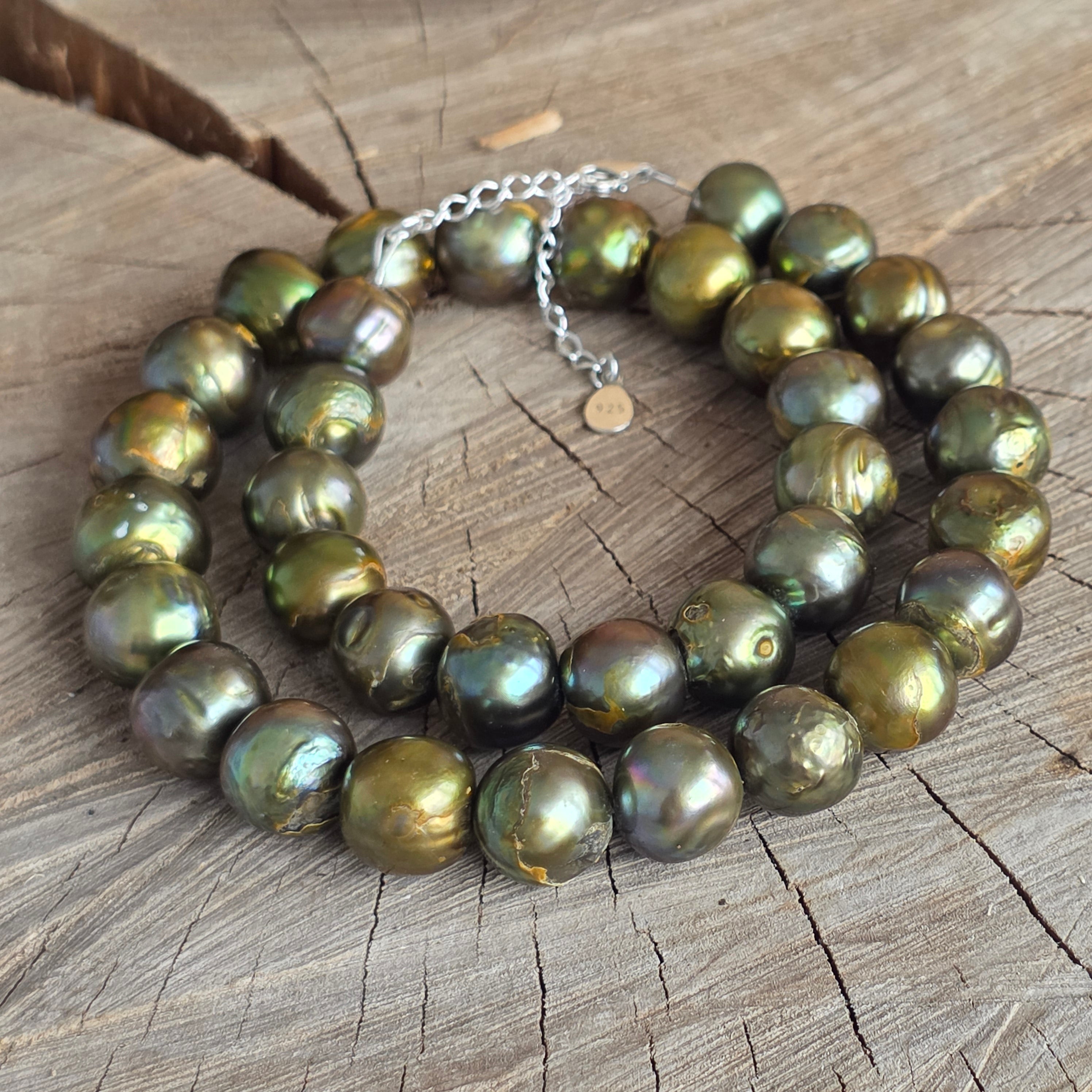 Un colier cu o eleganță calmă și rafinată, în nuanțe de verde profund care evocă liniștea naturii și echilibrul interior. Perlele de 10 mm oferă o prezență clară și sofisticată, transformând această piesă într-un accesoriu cu personalitate.