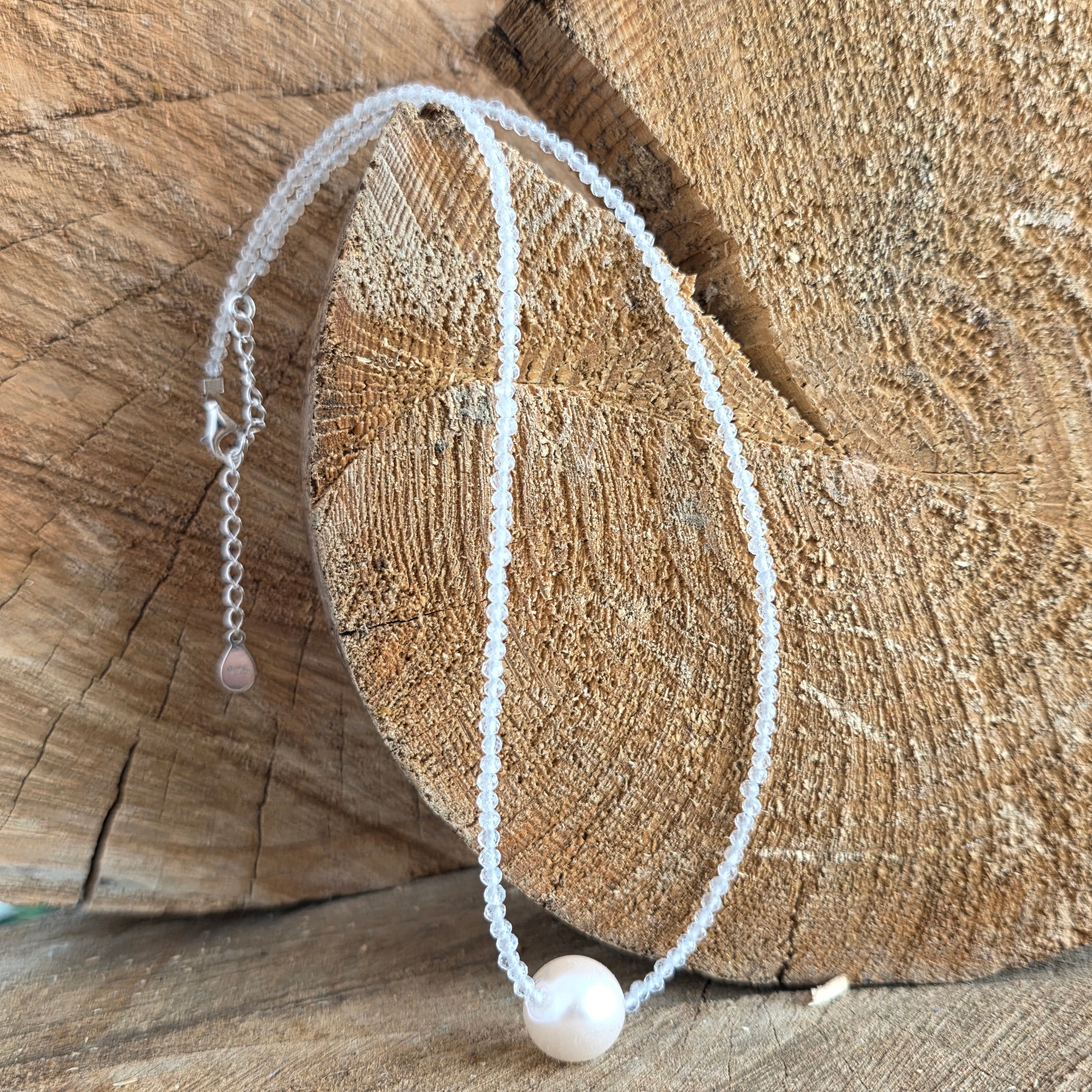 Colierul este finisat cu elemente din argint 925, atent alese pentru durabilitate și aspectul lor curat. Lungimea de 38 cm, completată de un lanț de prelungire de 5 cm, permite ajustarea ușoară pentru diferite stiluri și ținute. Închiderea este de tip lobster (delfin), realizată din argint 925, asigurând siguranță și confort la purtare.