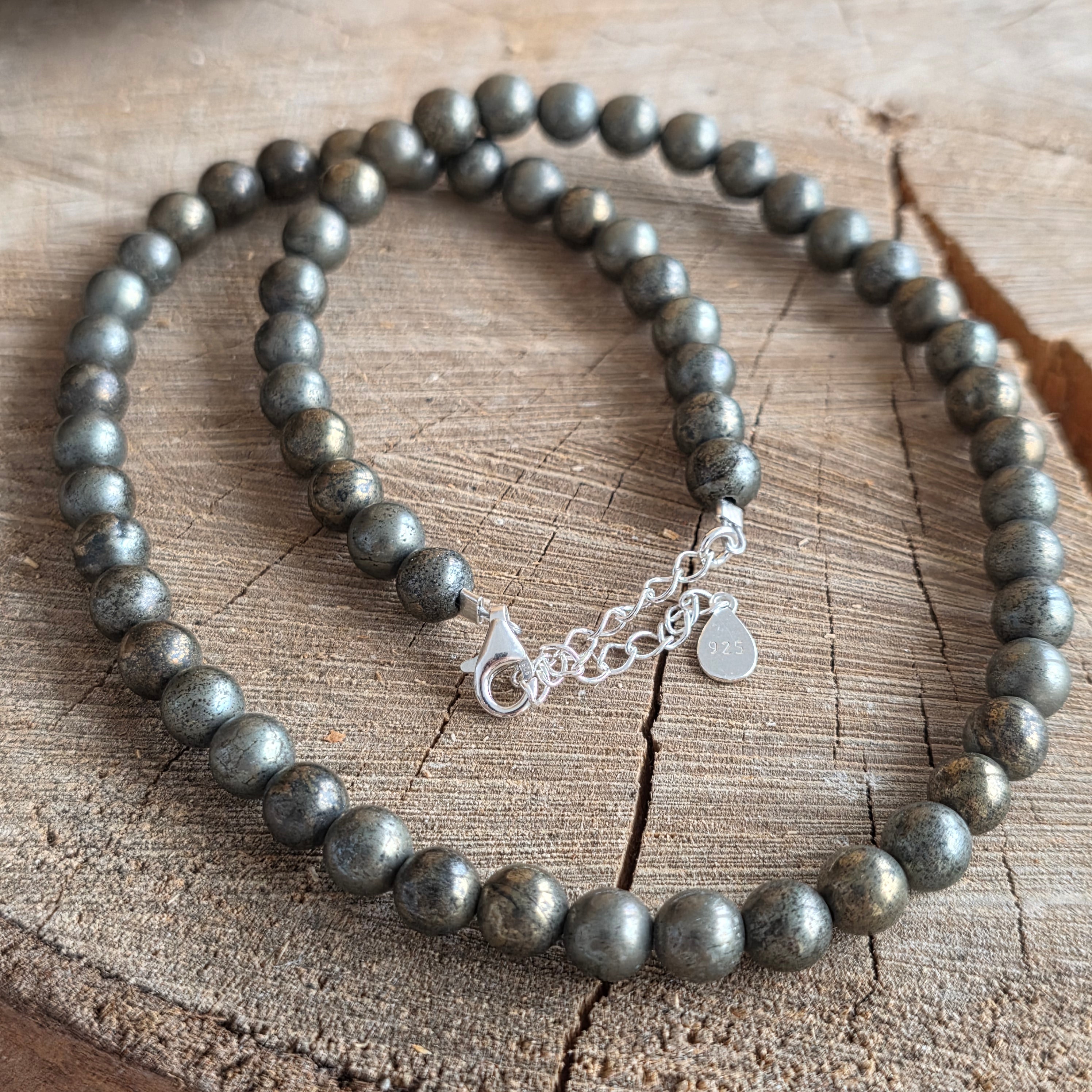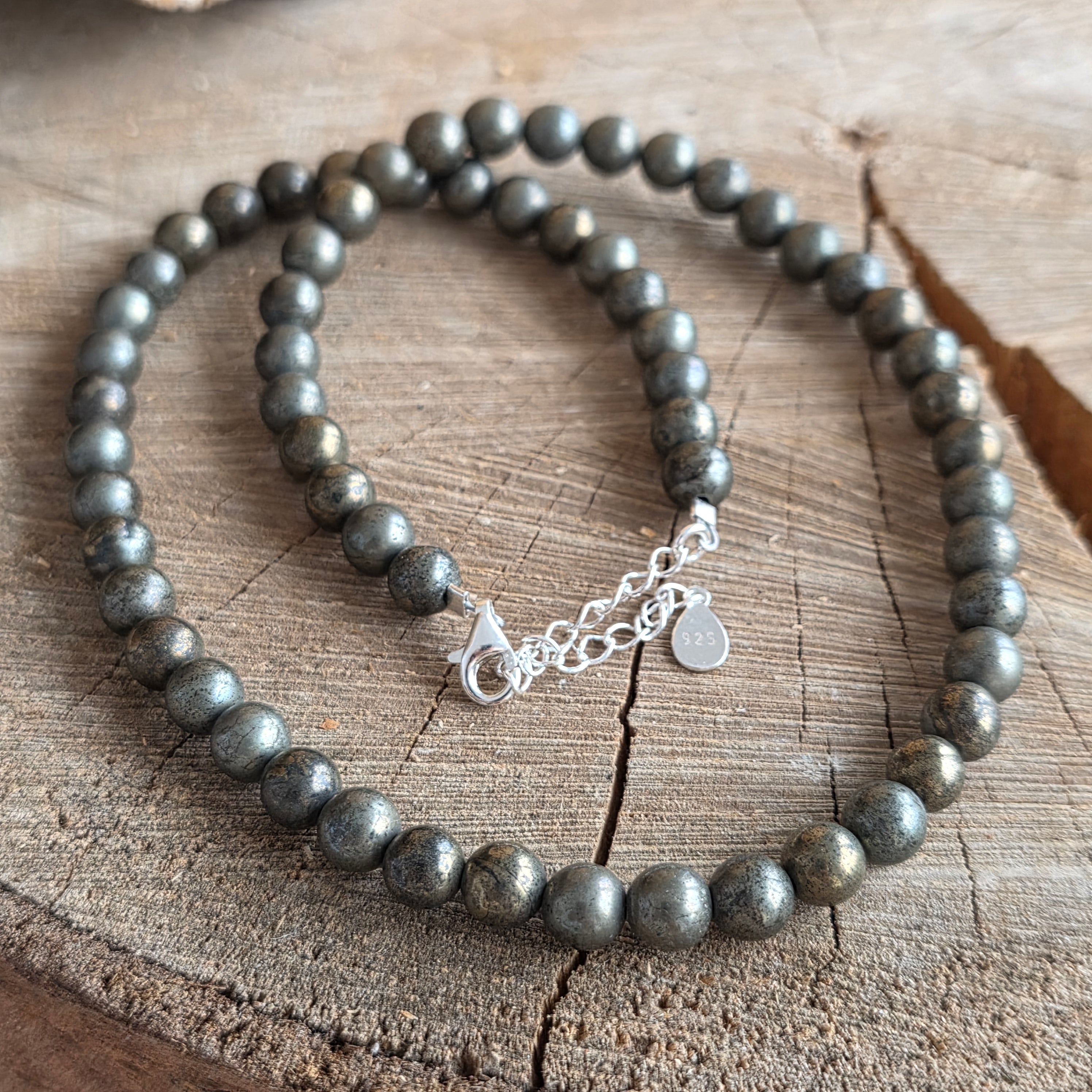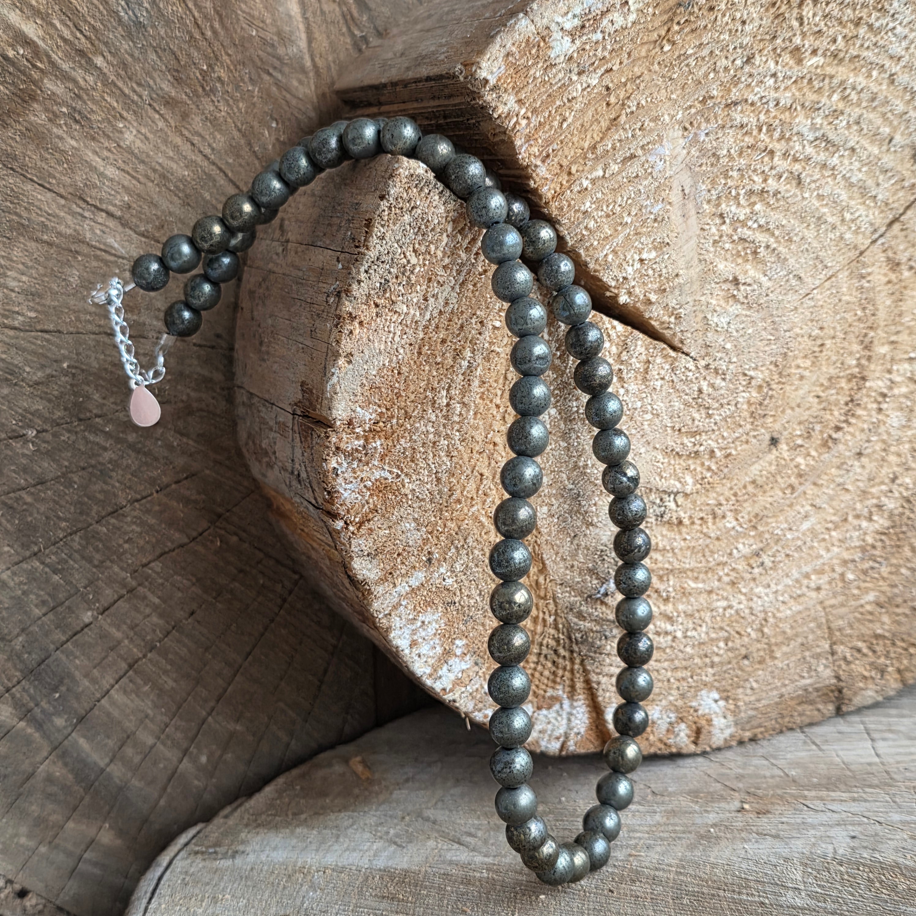 Un colier cu personalitate puternică și eleganță minerală, realizat din sfere de pirită de 6 mm, ale căror reflexii metalice captează lumina într-un joc subtil de auriu și grafit. Fiecare sferă are o strălucire proprie, ușor brută, amintind de structura cristalină a pietrei și de forța ei primordială. Este o bijuterie care nu are nevoie de ornamente suplimentare pentru a se face remarcată.