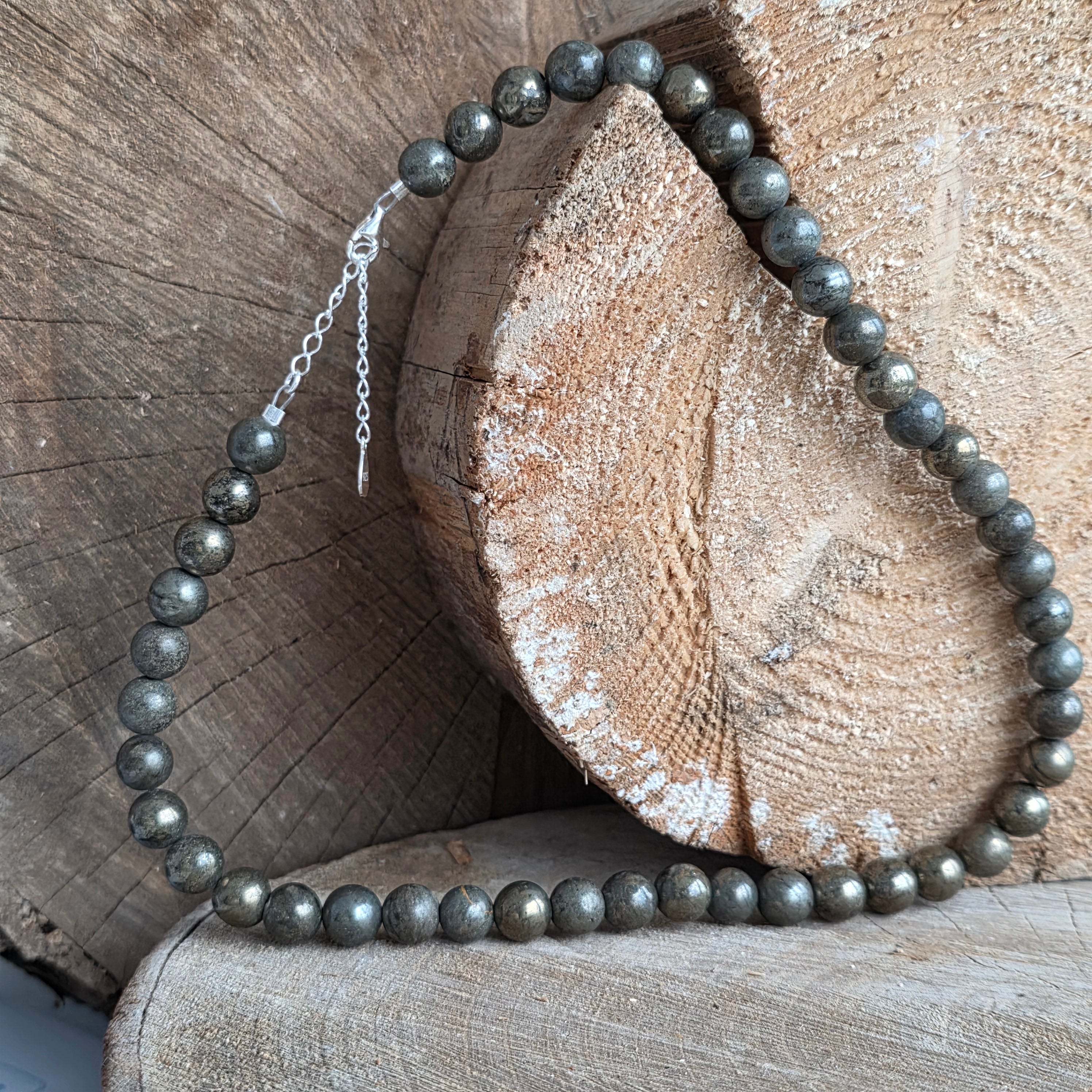 Un colier cu personalitate puternică și eleganță minerală, realizat din sfere de pirită de 8 mm, ale căror reflexii metalice captează lumina într-un joc subtil de auriu și grafit. Fiecare sferă are o strălucire proprie, ușor brută, amintind de structura cristalină a pietrei și de forța ei primordială. Este o bijuterie care nu are nevoie de ornamente suplimentare pentru a se face remarcată.