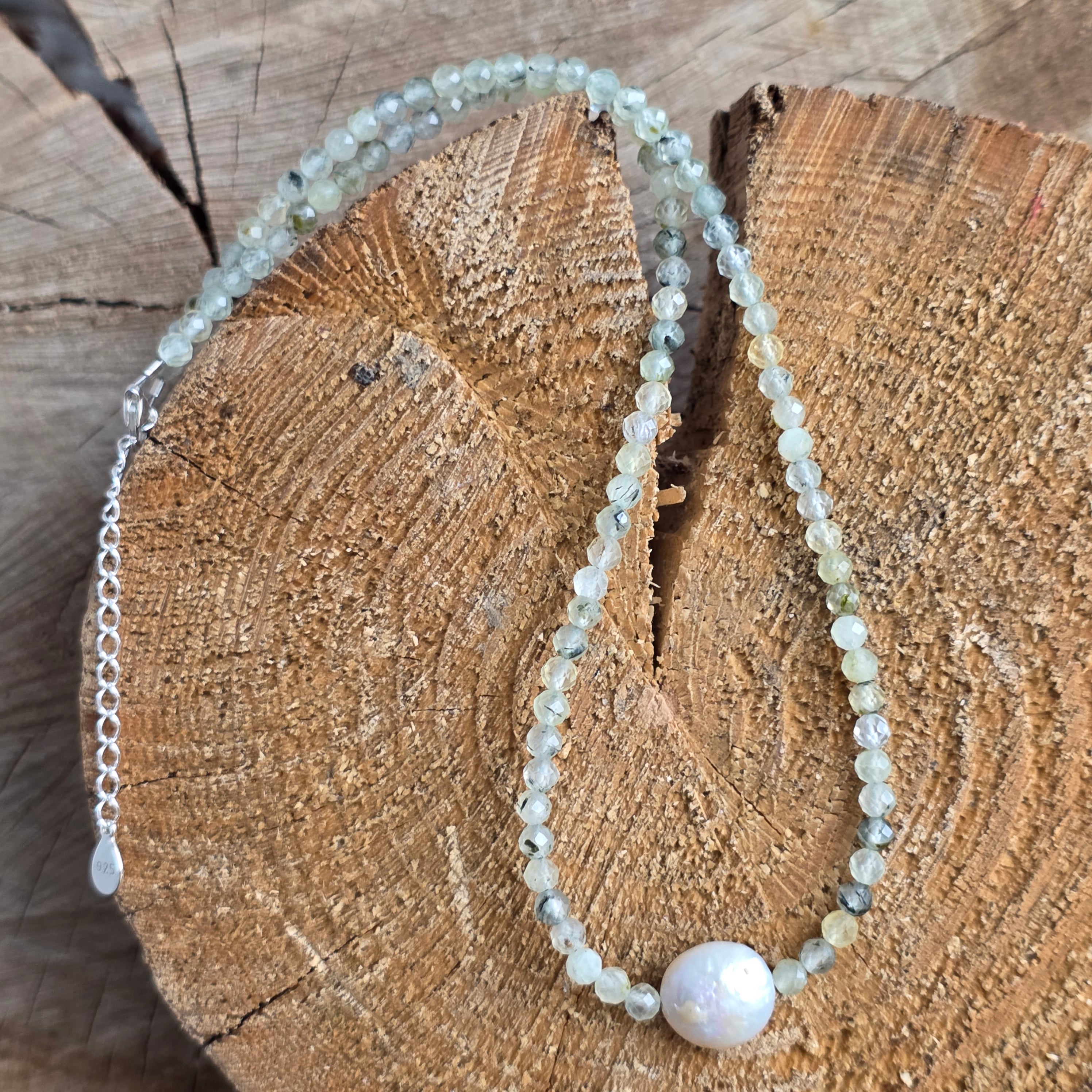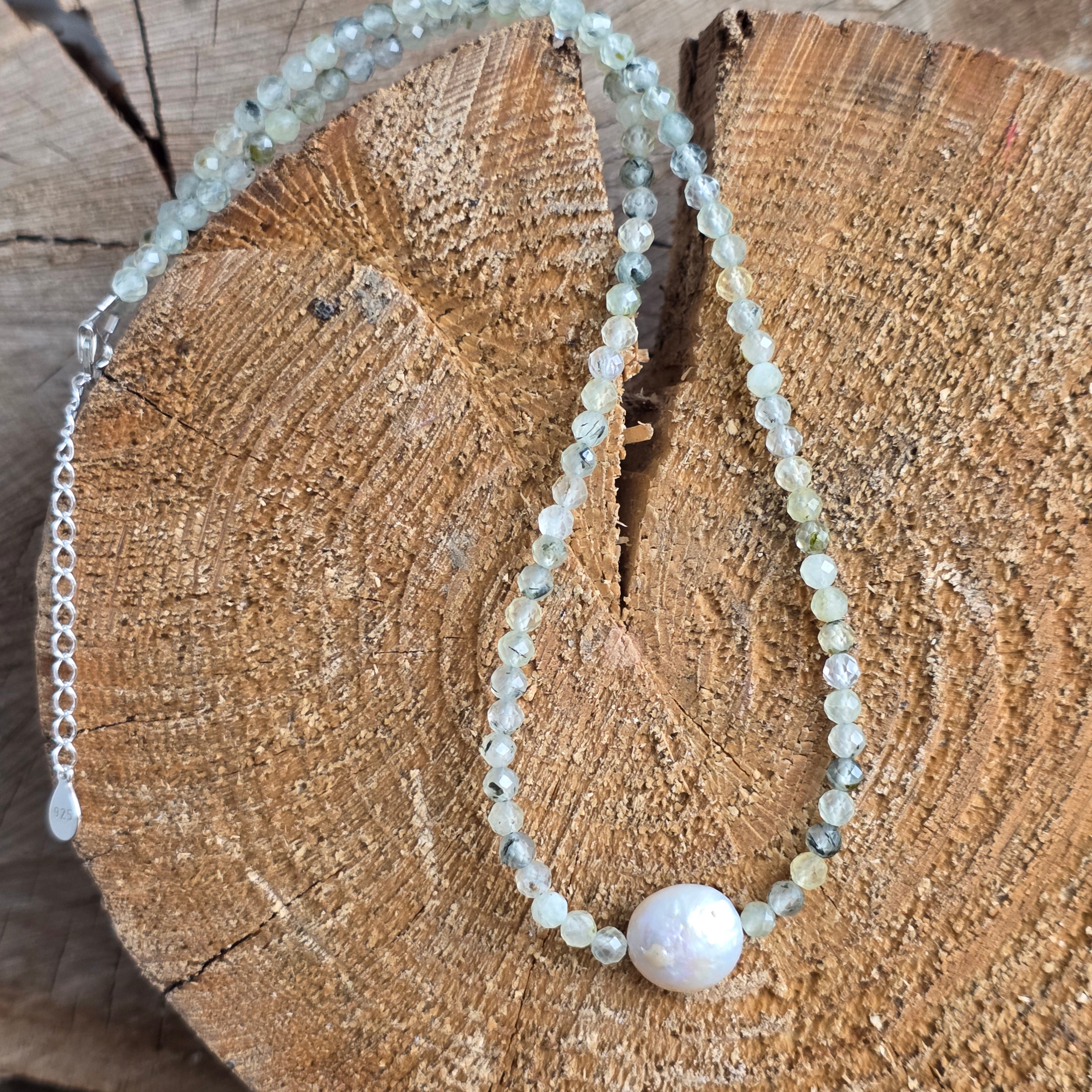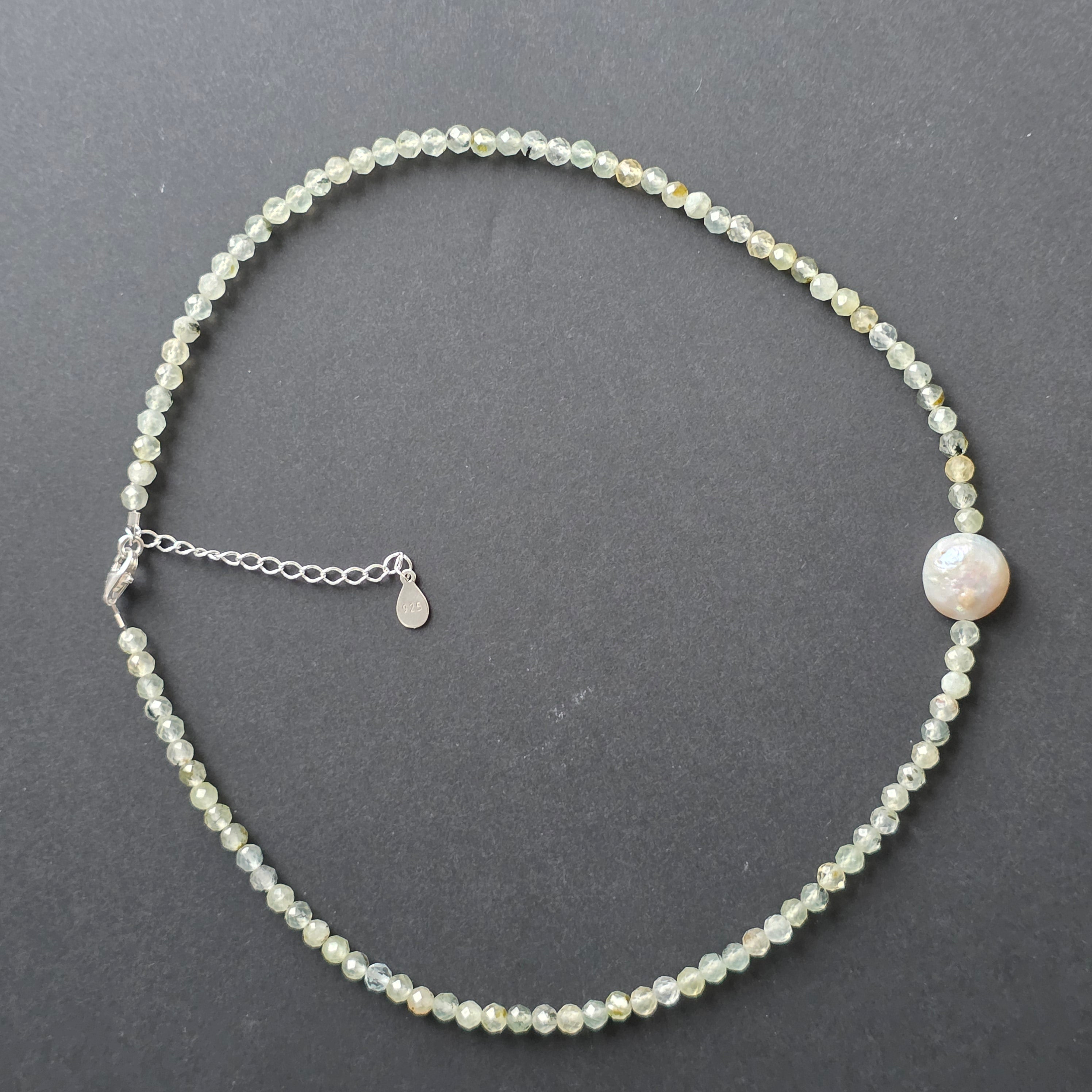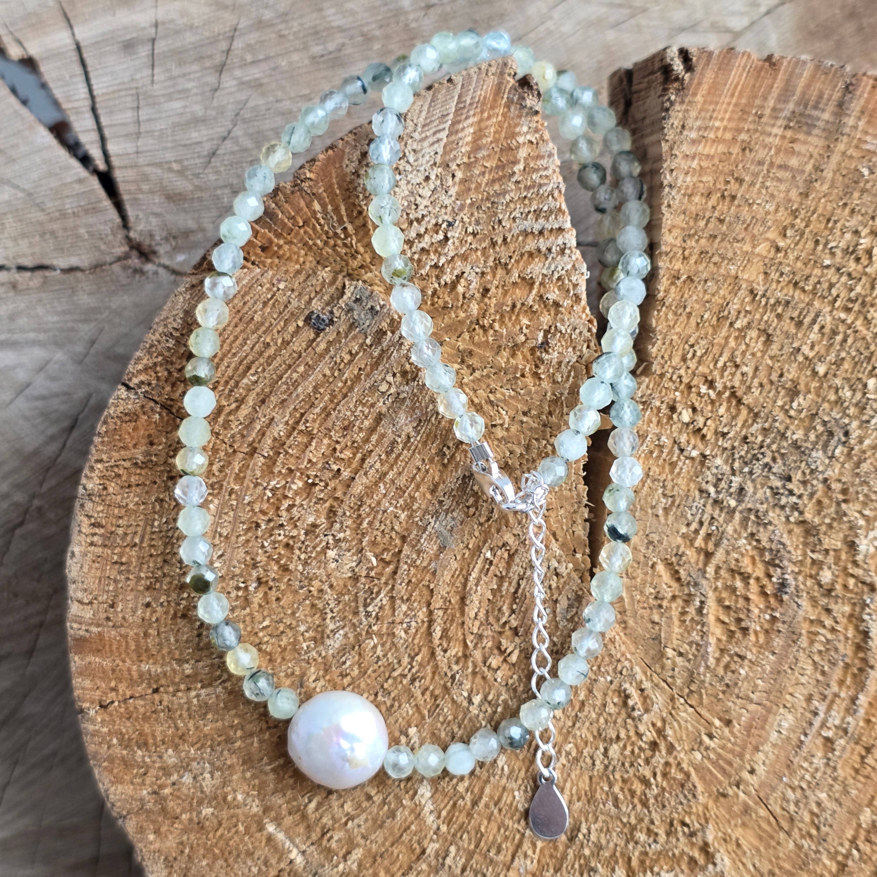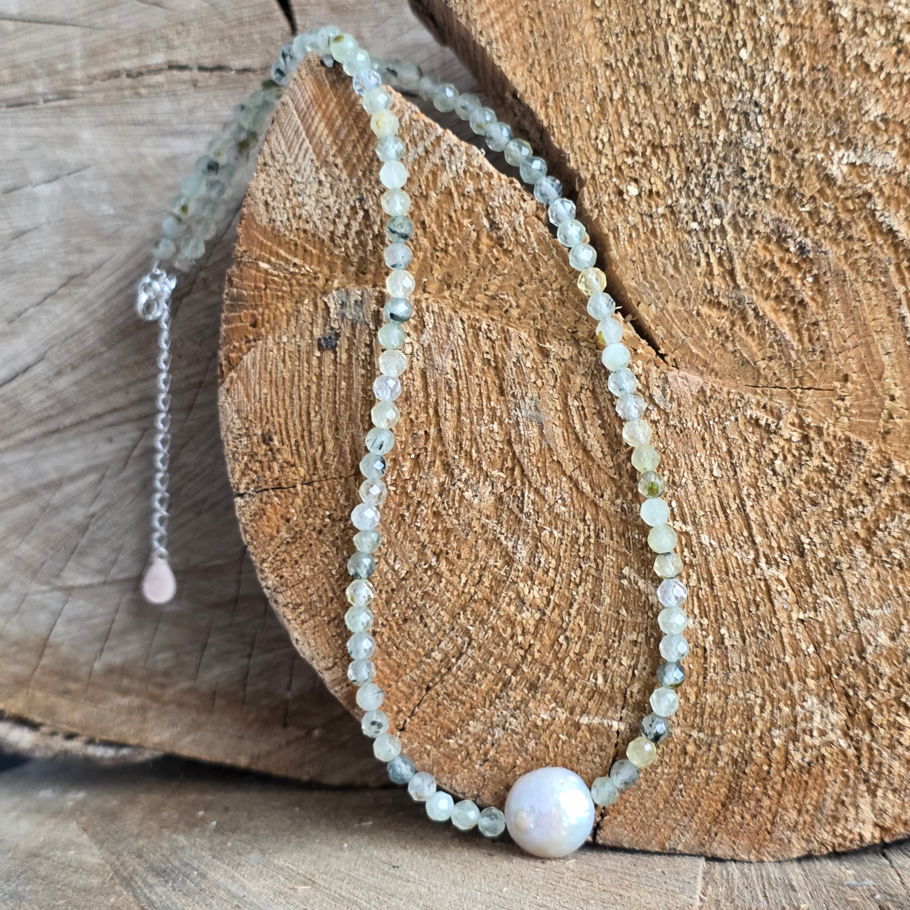 Un colier delicat și luminos, realizat din sfere fațetate de prehnit de 4 mm, așezate cu finețe într-un ritm calm și echilibrat. În centrul compoziției, o perlă naturală de aproximativ 1 cm devine punctul de liniște și rafinament, adăugând bijuteriei o notă de eleganță atemporală.