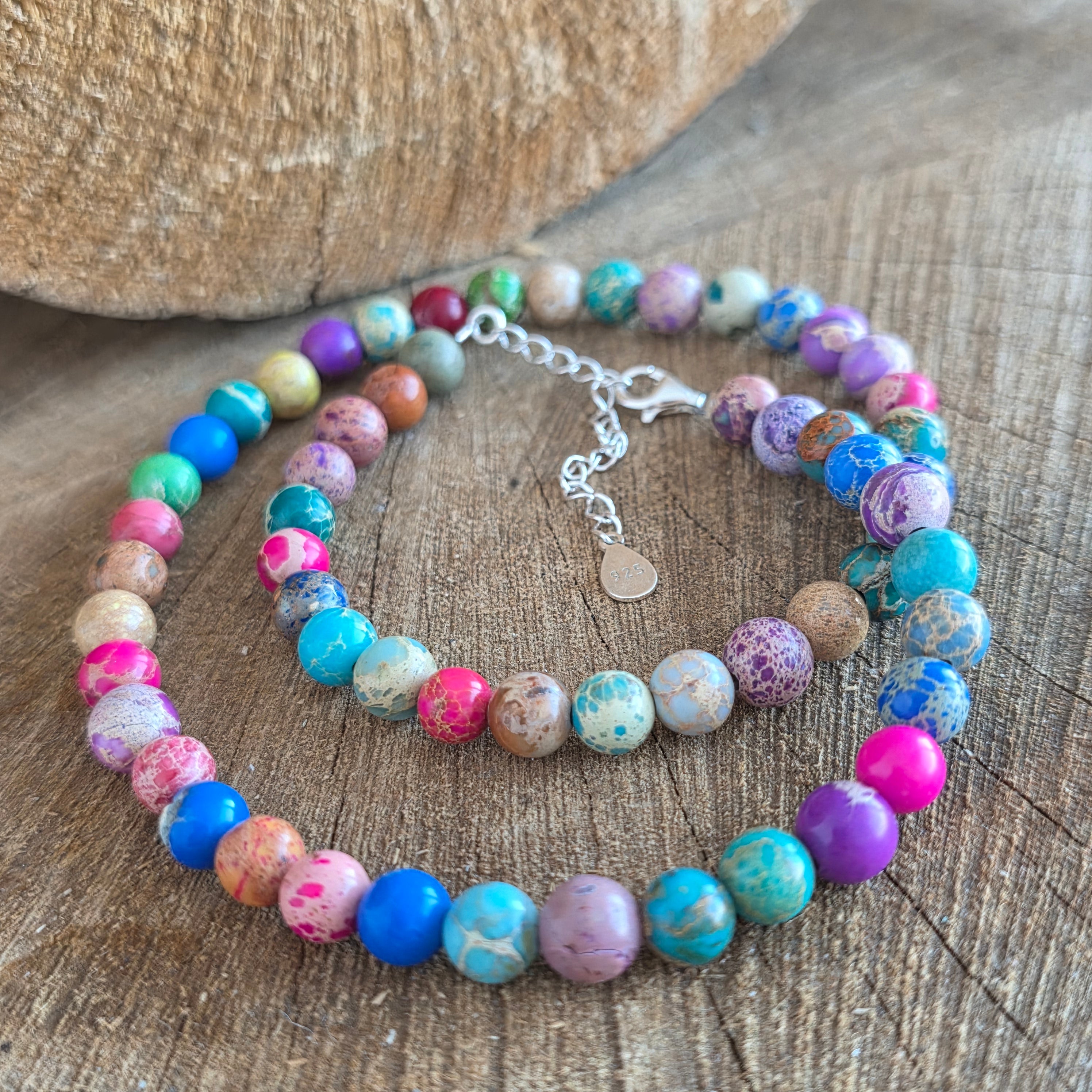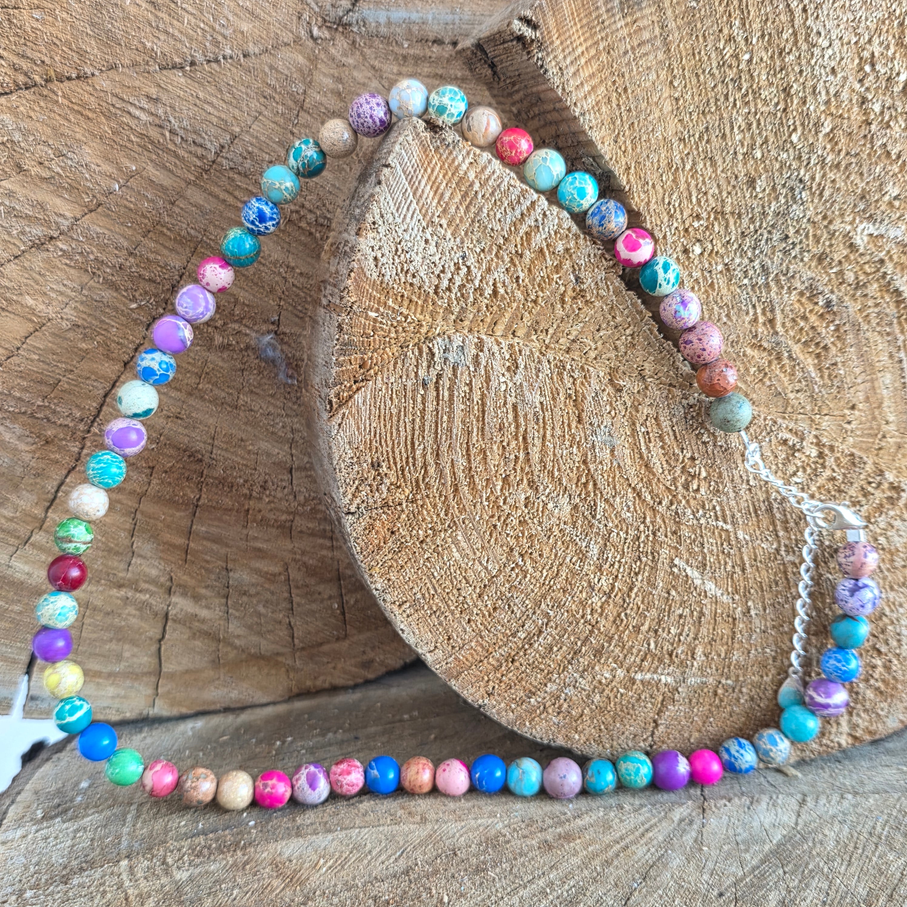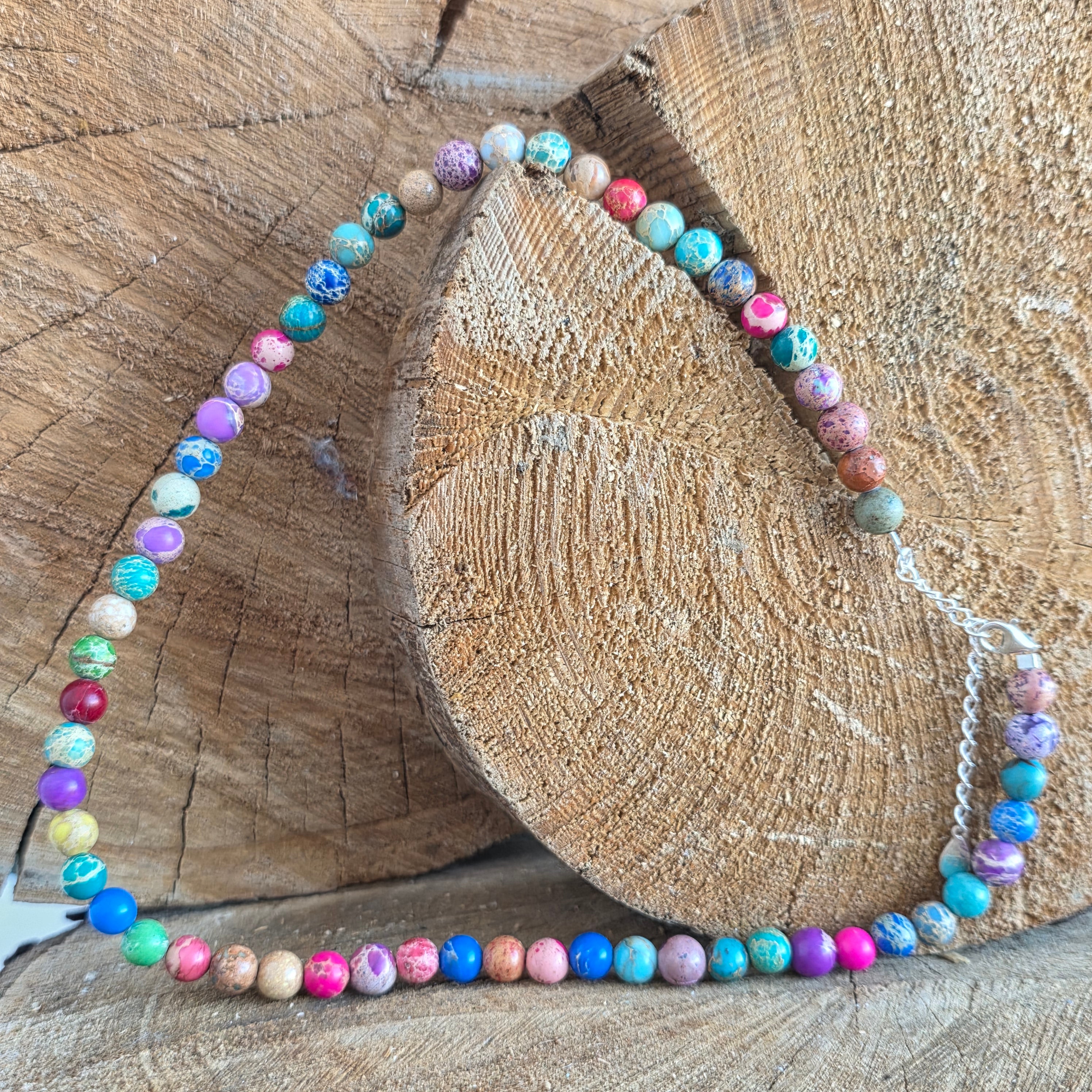 Acest colier din regalit reunește nuanțe variate și armonioase, dispuse sub forma unor sfere șlefuite, fiecare cu personalitatea ei cromatică. Regalit-ul, cu aspectul său marmorat și jocul natural de culori – de la turcoaz și verde, până la tonuri calde de maro, crem sau roșcat – creează o bijuterie expresivă, cu un aer artistic și ușor regal, așa cum îi sugerează și numele.