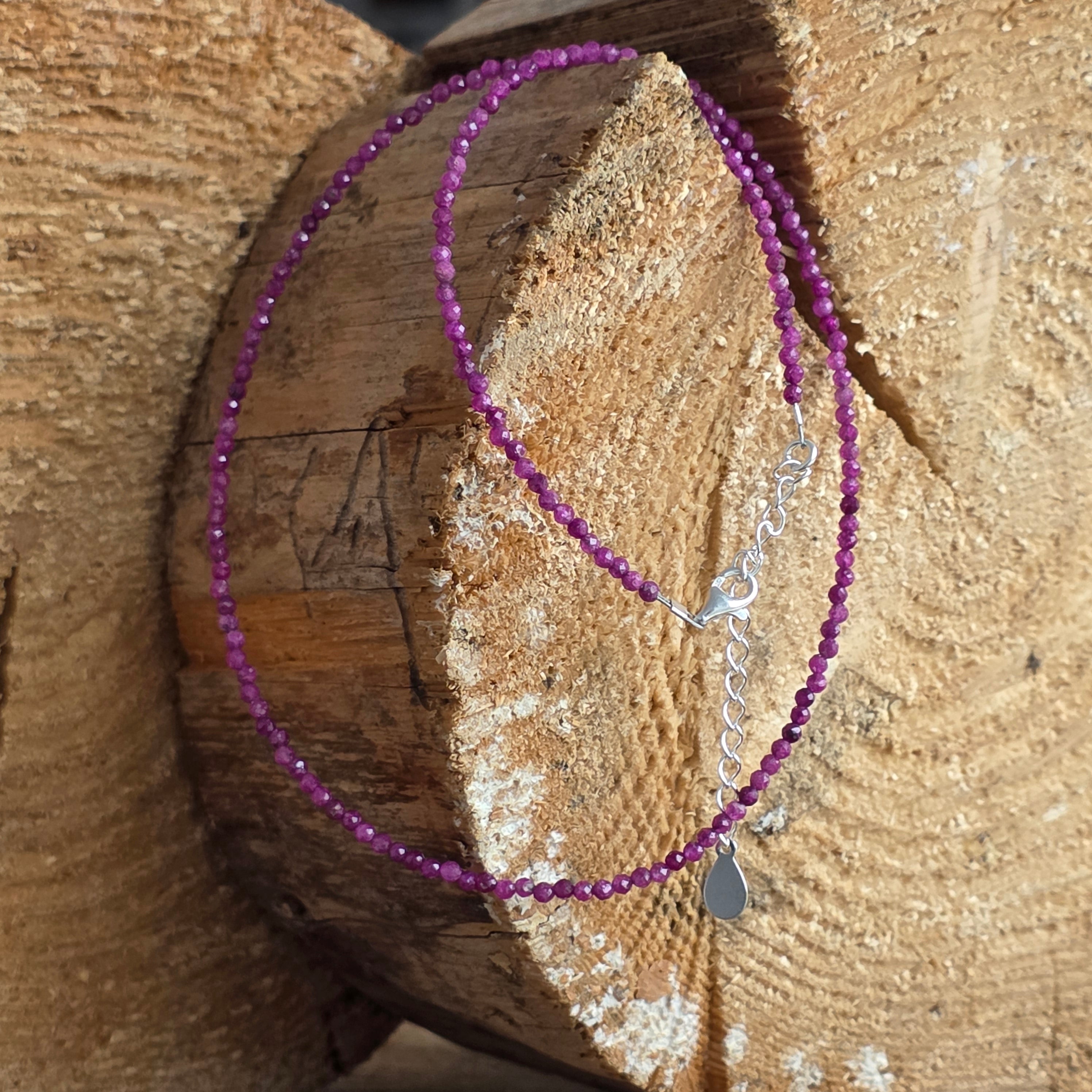 Un colier fin, dar cu prezență, realizat din sfere fațetate de rubin natural de 2.5 mm, într-o nuanță profundă de vișiniu intens, cu reflexe calde și aproape regale. Fiecare perlă mică și tăcută reflectă lumina discret, ca o șoaptă de pasiune, de intenție și de noblețe interioară.