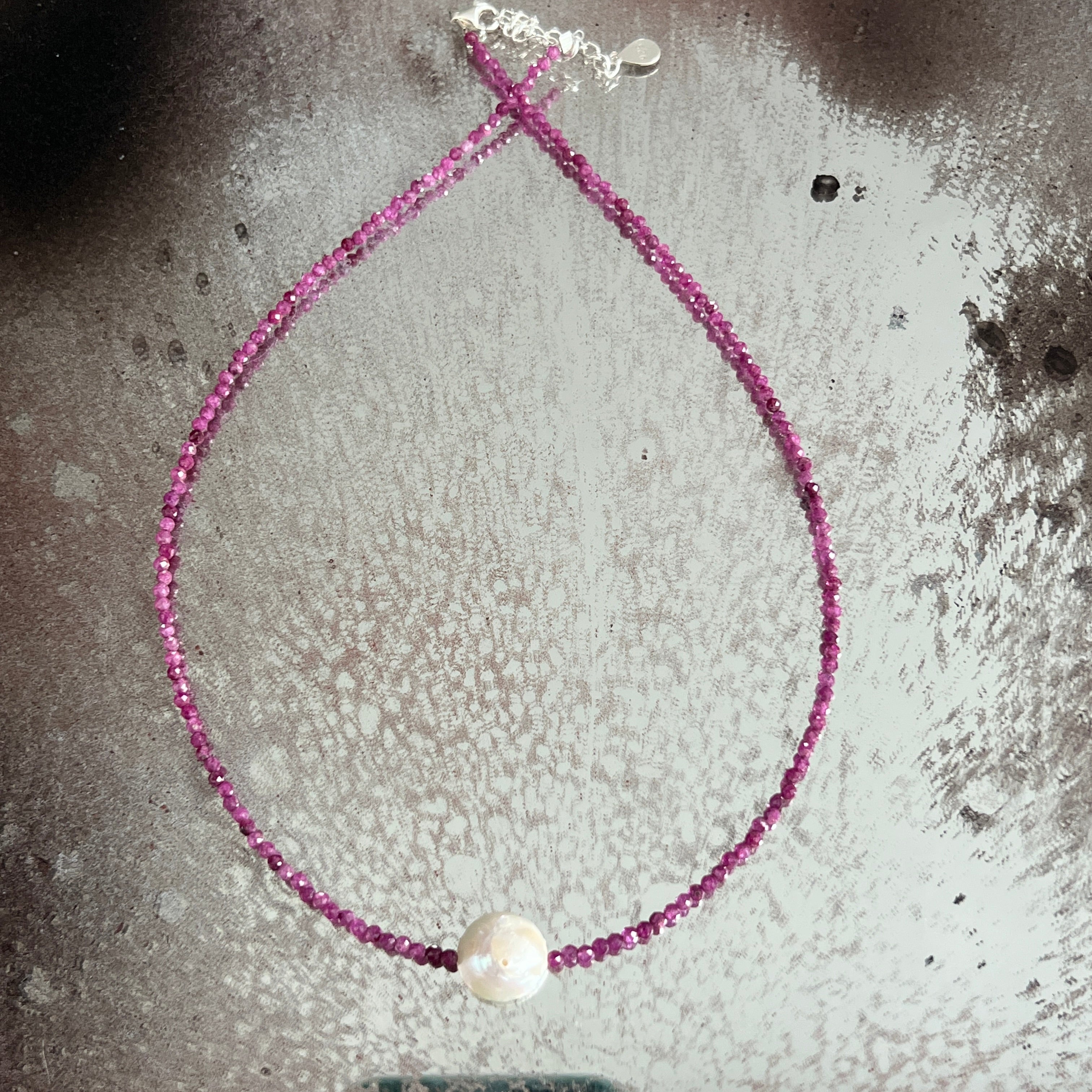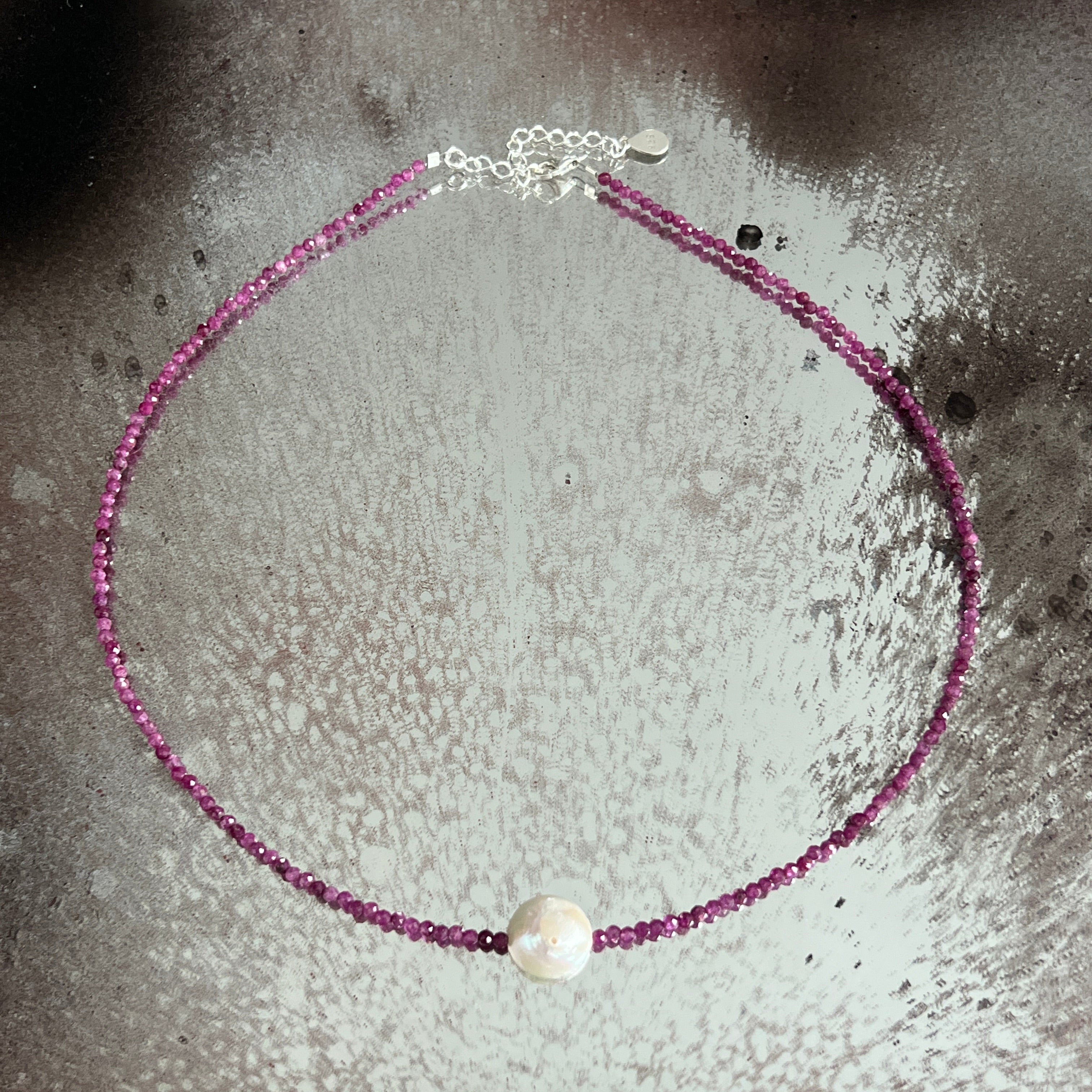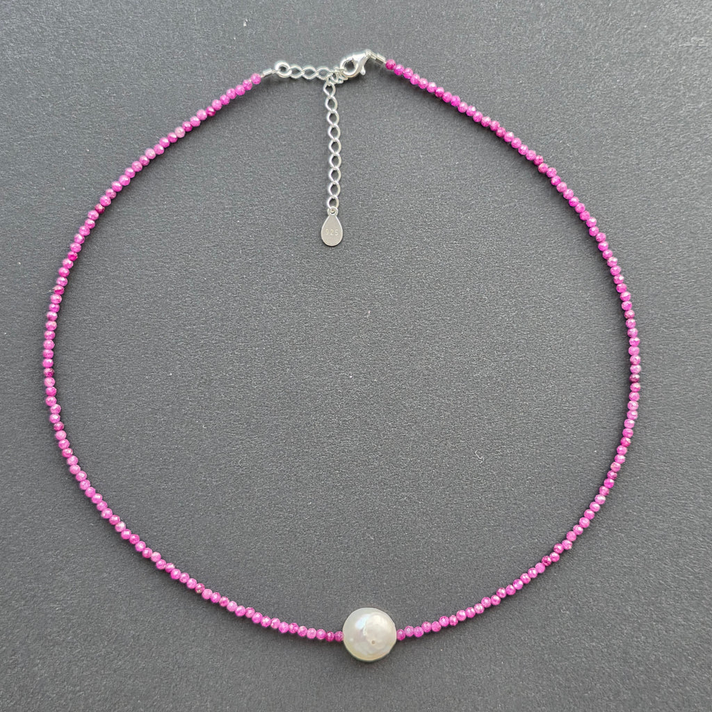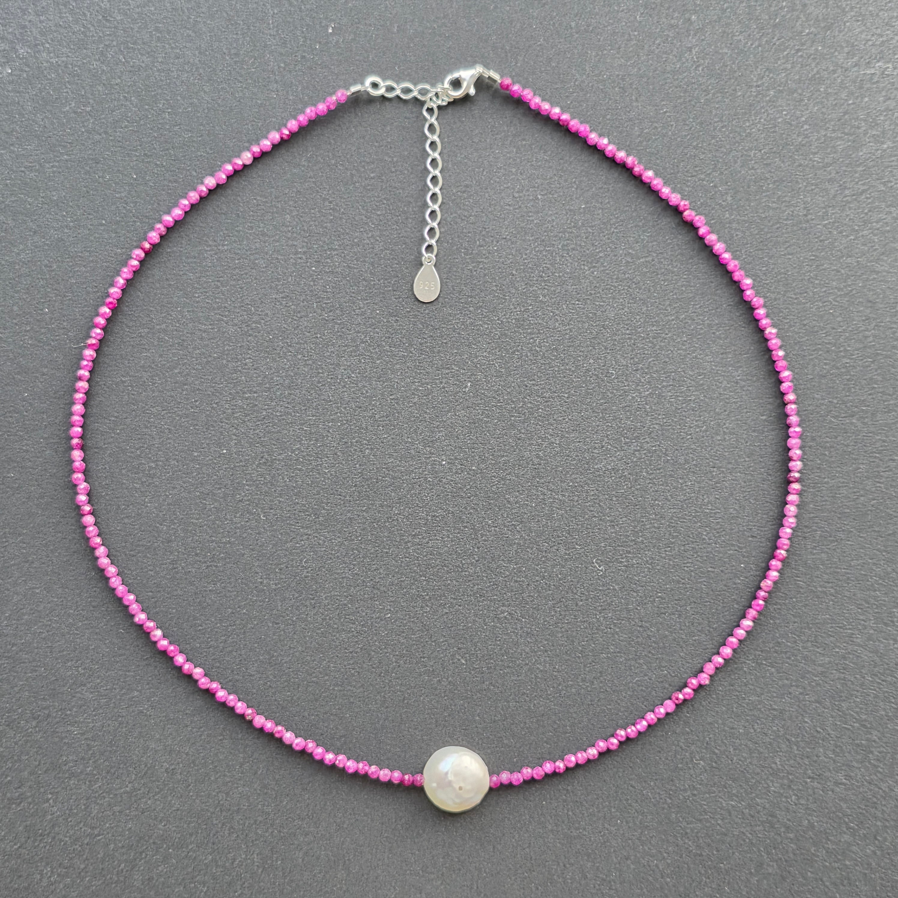 Un colier fin, dar cu prezență, realizat din sfere fațetate de rubin natural de 2.5 mm, într-o nuanță profundă de vișiniu intens, cu reflexe calde și aproape regale. Fiecare perlă mică și tăcută reflectă lumina discret, ca o șoaptă de pasiune, de intenție și de noblețe interioară.