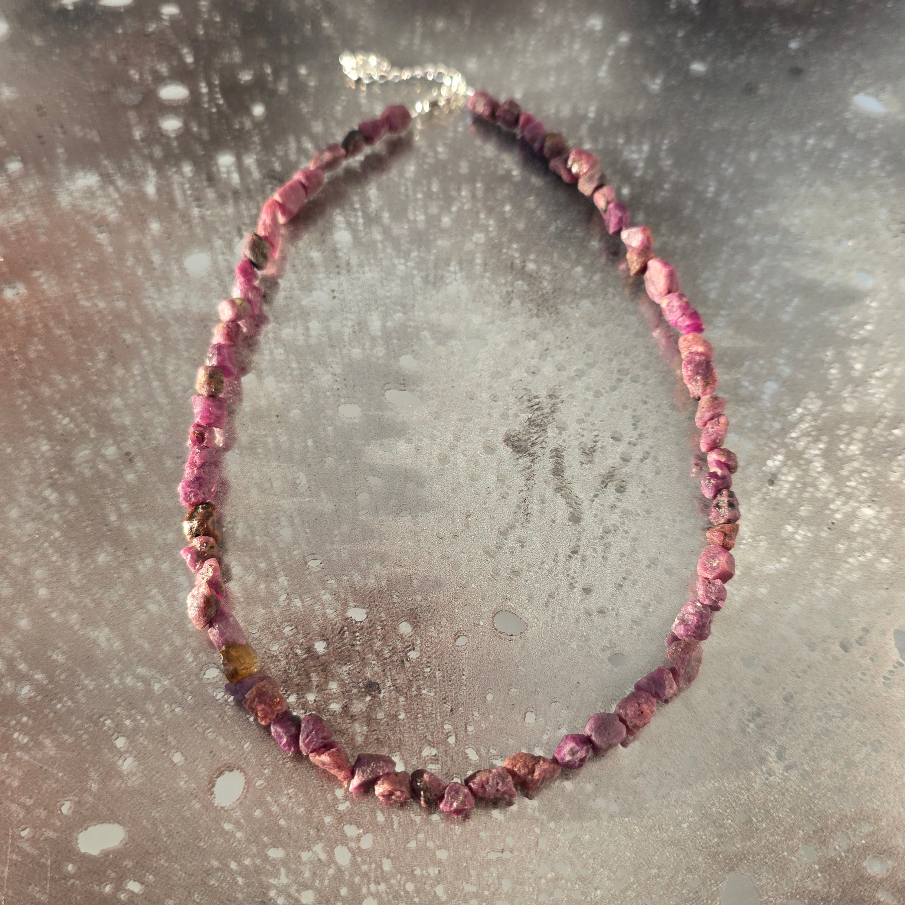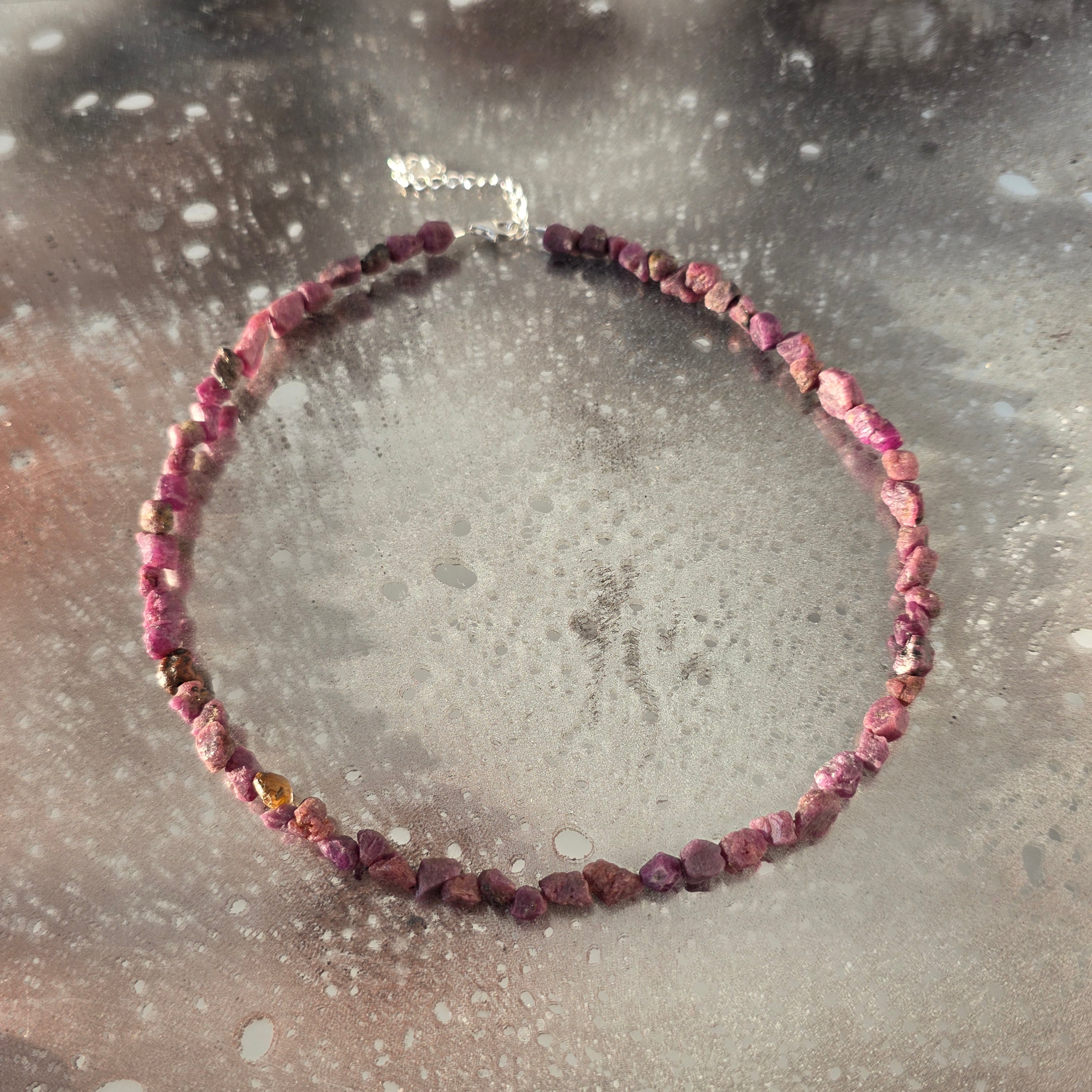 Un colier intens și autentic, în care rubinul în formă brută își păstrează energia naturală și textura neprelucrată, oferind o estetică sinceră și puternică. Pietrele de aproximativ 6 x 3 mm creează un ritm organic, diferit de la o piesă la alta, evidențiind unicitatea fiecărui colier.