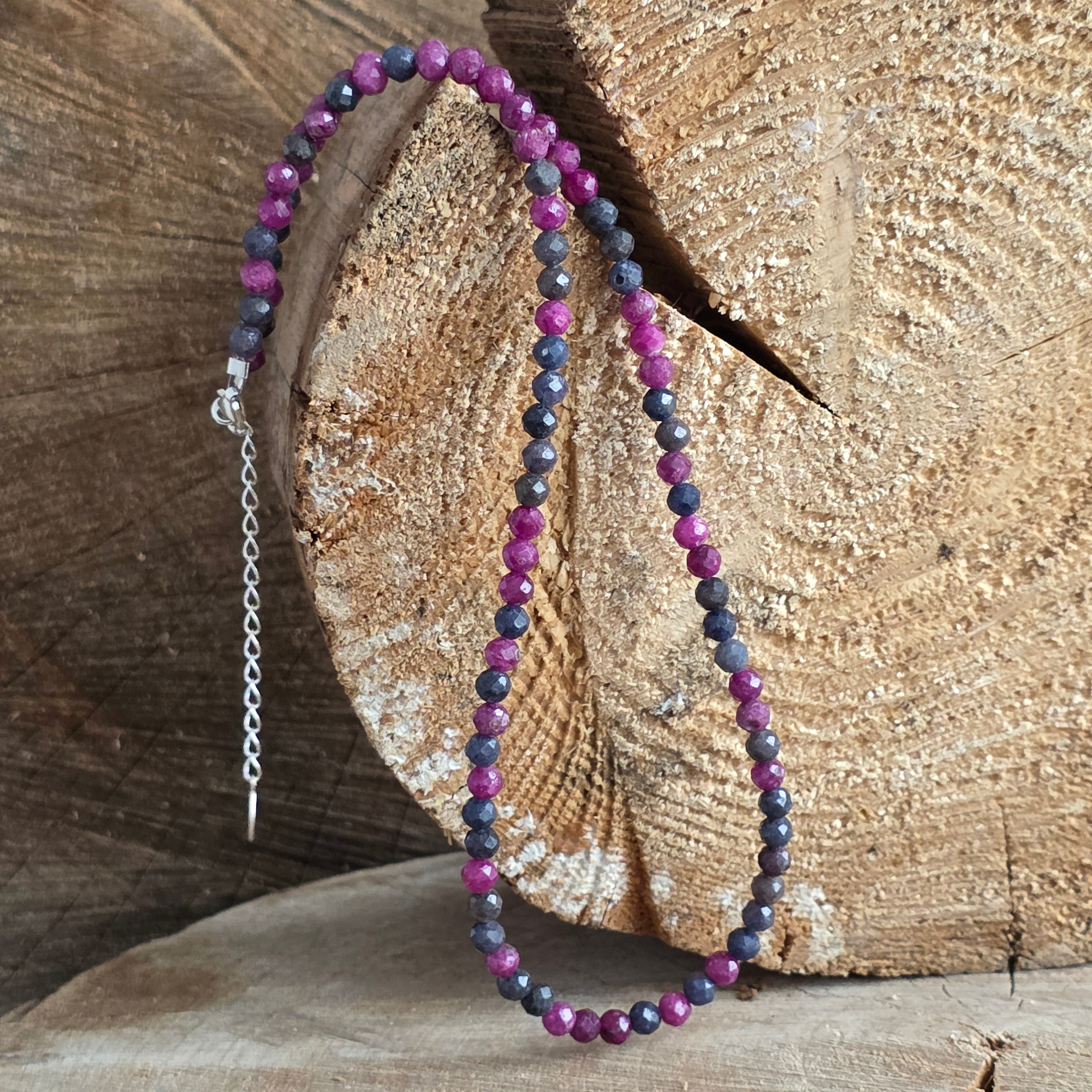 Un colier delicat, dar cu o forță subtilă, realizat din sfere fațetate de safir și rubin de 5 mm, împletite într-un joc armonios de contraste – albastrul înțelept al safirului și roșul pasional al rubinului. Cele două pietre prețioase alternează discret, într-o compoziție ce vorbește despre echilibru, rafinament și profunzime.
