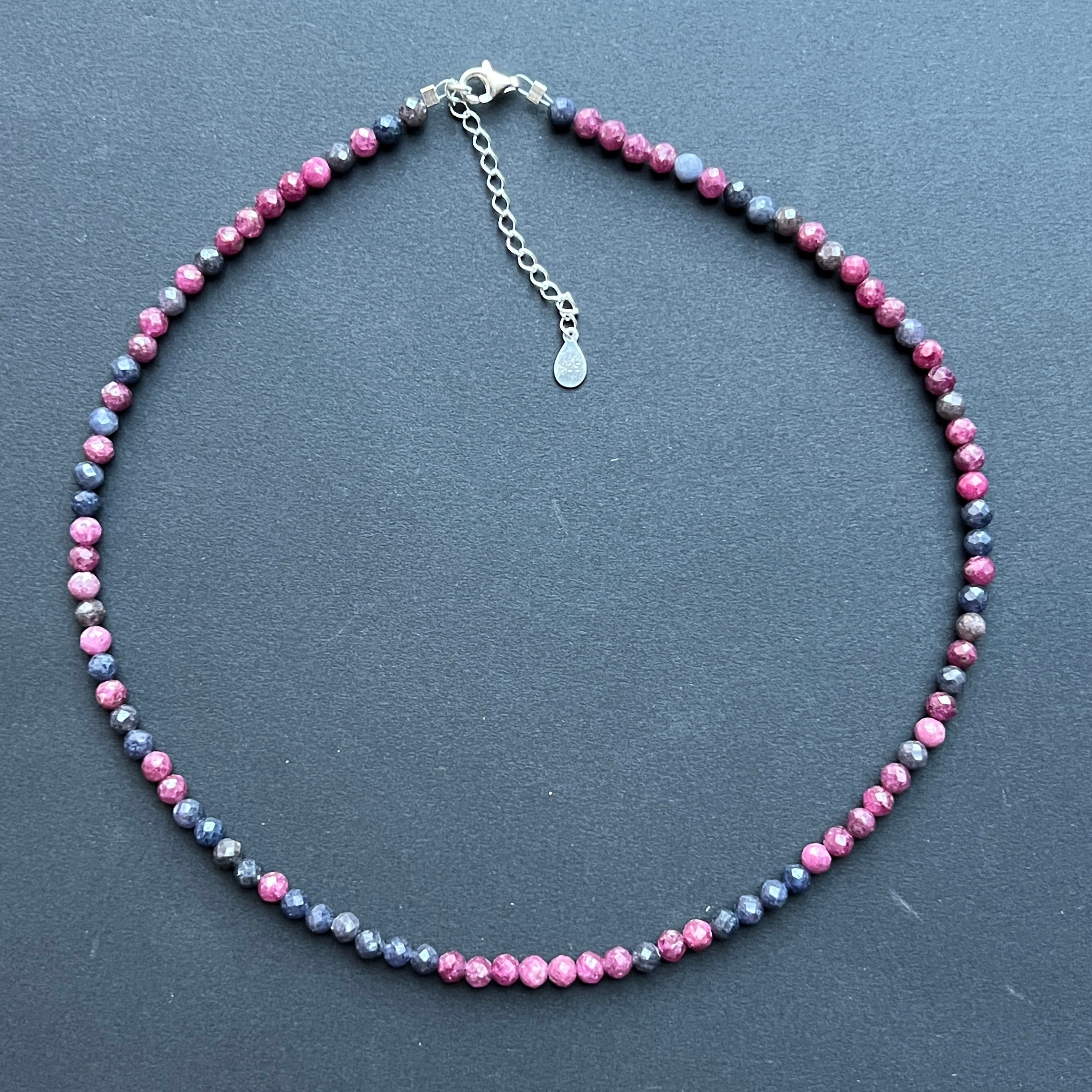 Un colier delicat, dar cu o forță subtilă, realizat din sfere fațetate de safir și rubin de 5 mm, împletite într-un joc armonios de contraste – albastrul înțelept al safirului și roșul pasional al rubinului. Cele două pietre prețioase alternează discret, într-o compoziție ce vorbește despre echilibru, rafinament și profunzime.