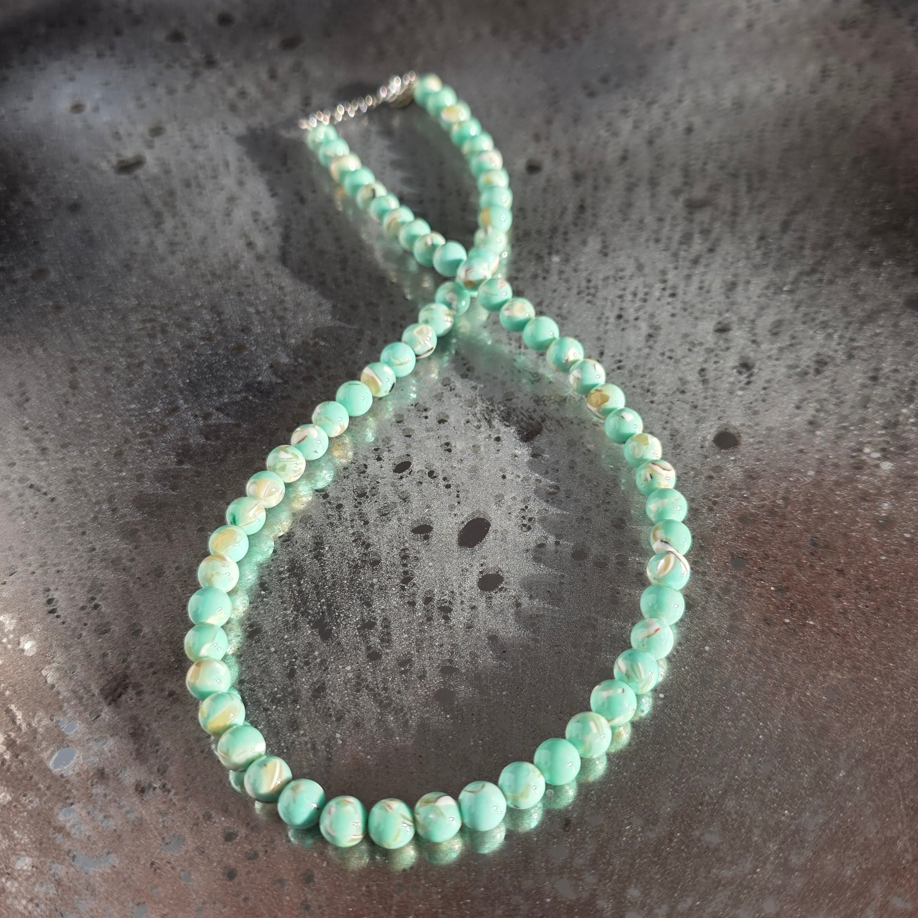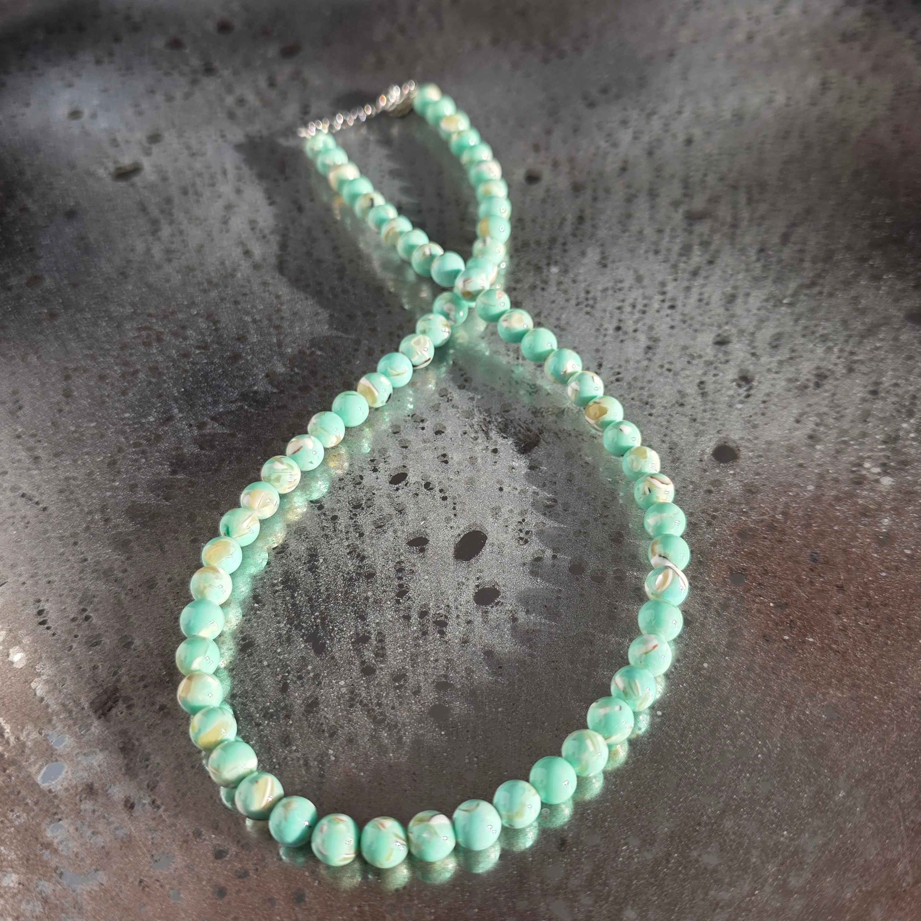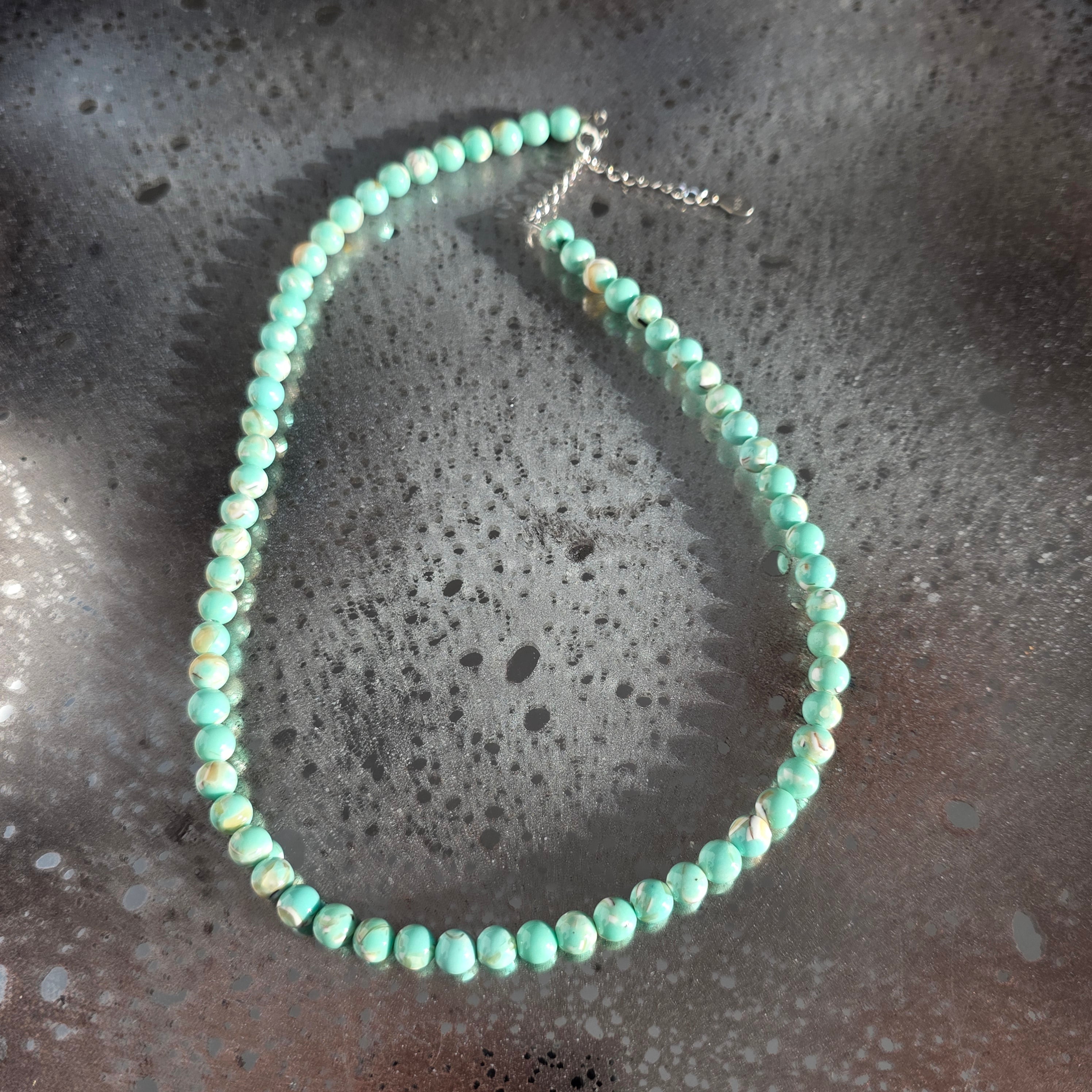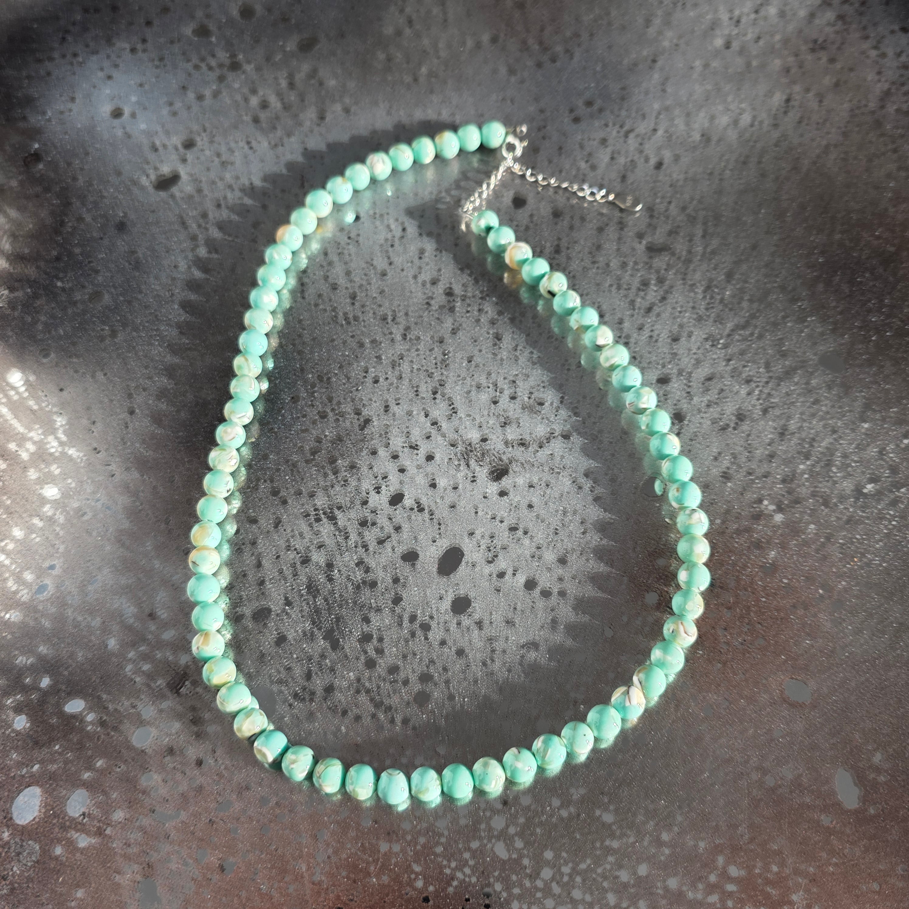 Un colier delicat și armonios, realizat din sfere de sidef de 6 mm. Suprafața netedă și nuanțele calde, perlate, creează o prezență calmă și elegantă, ușor de integrat atât în ținute zilnice, cât și în combinații mai rafinate.