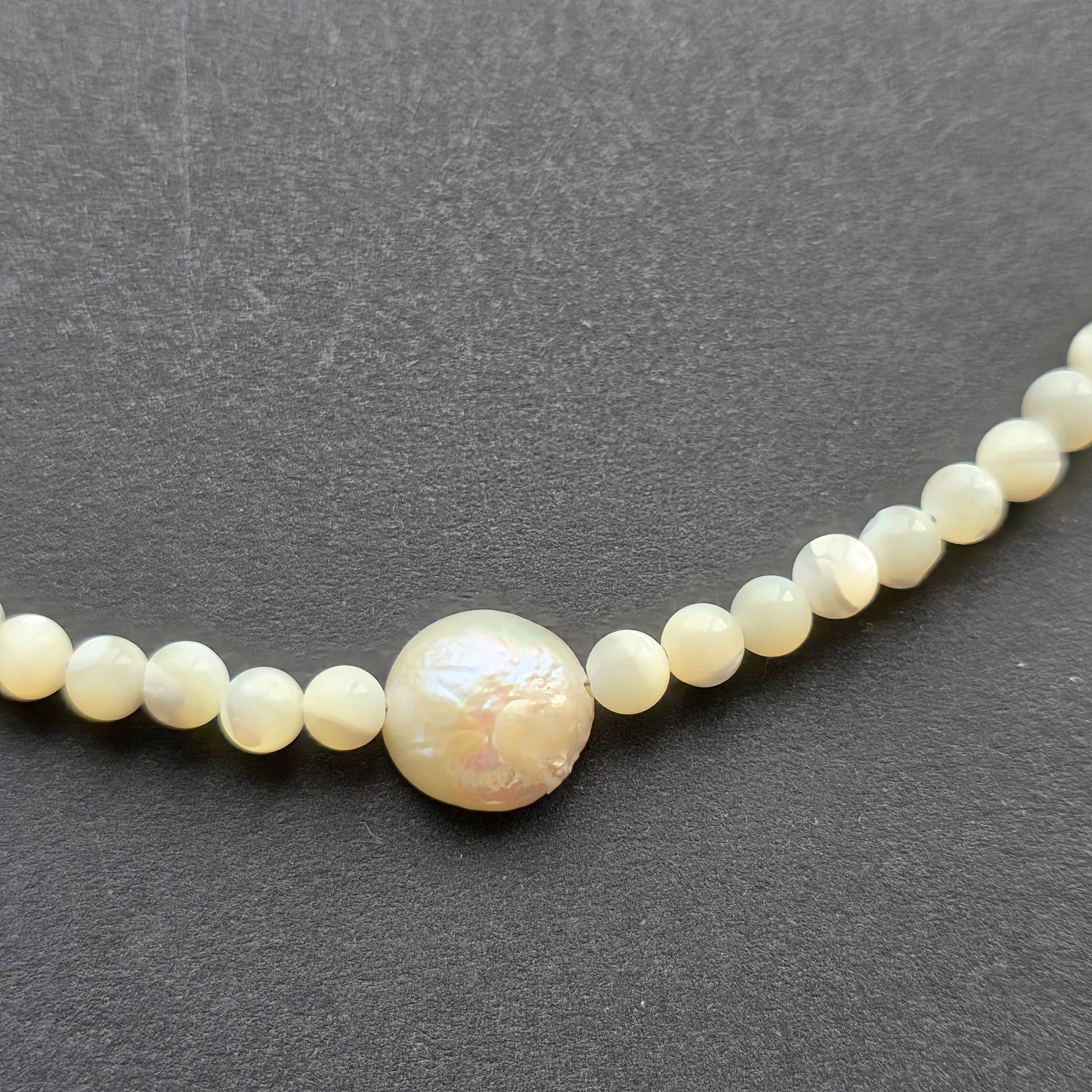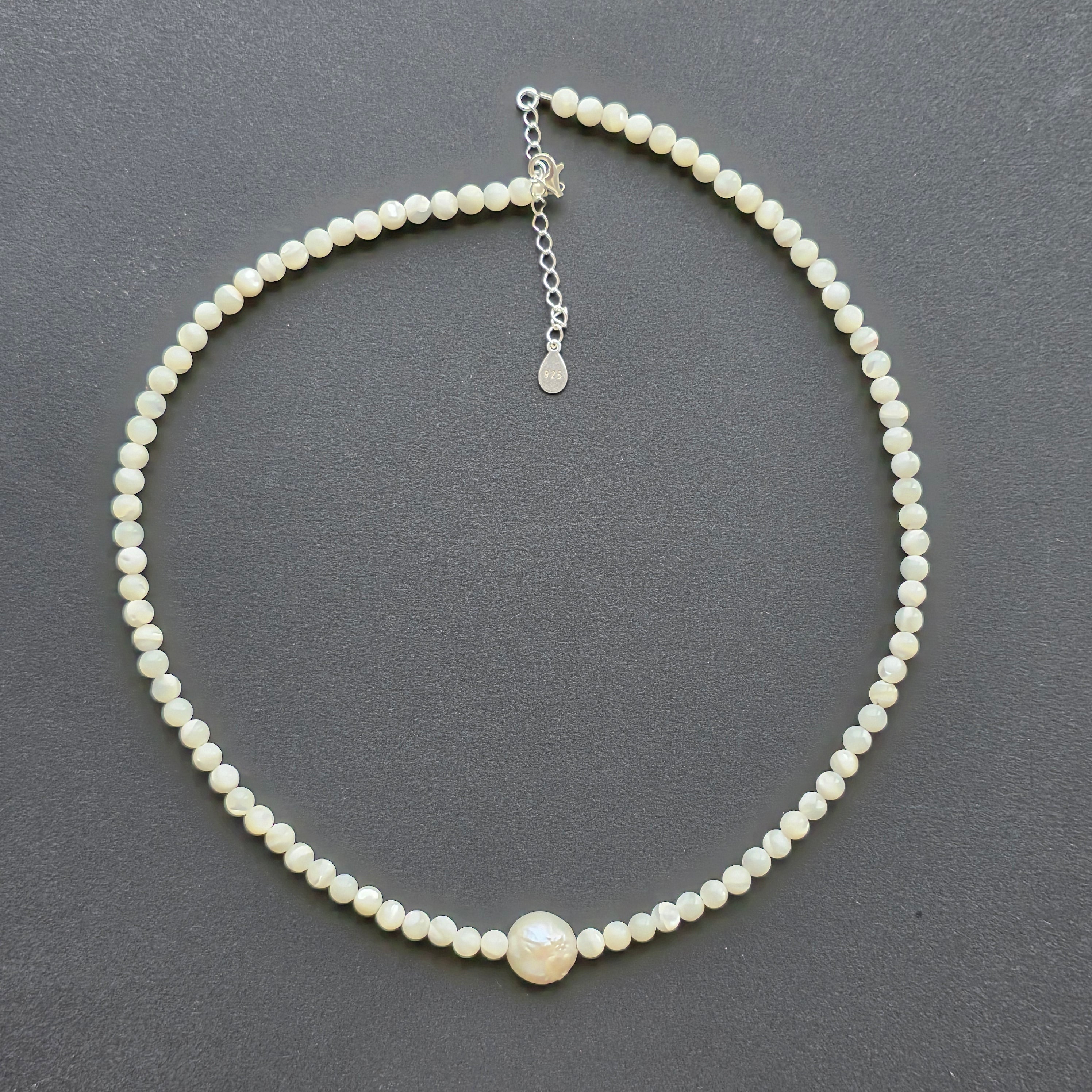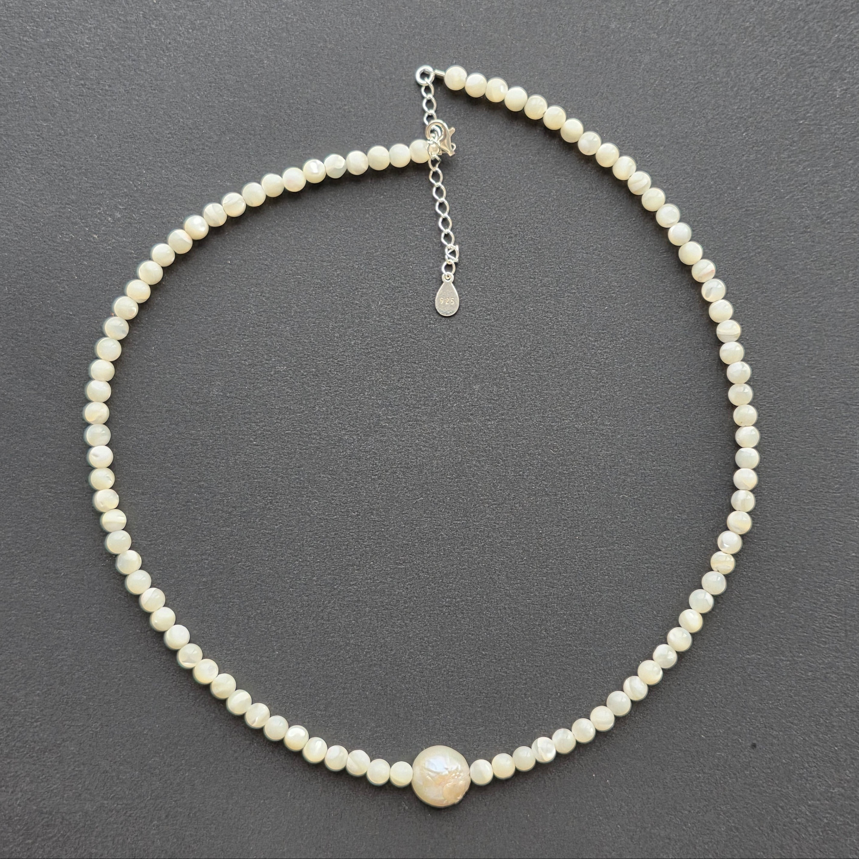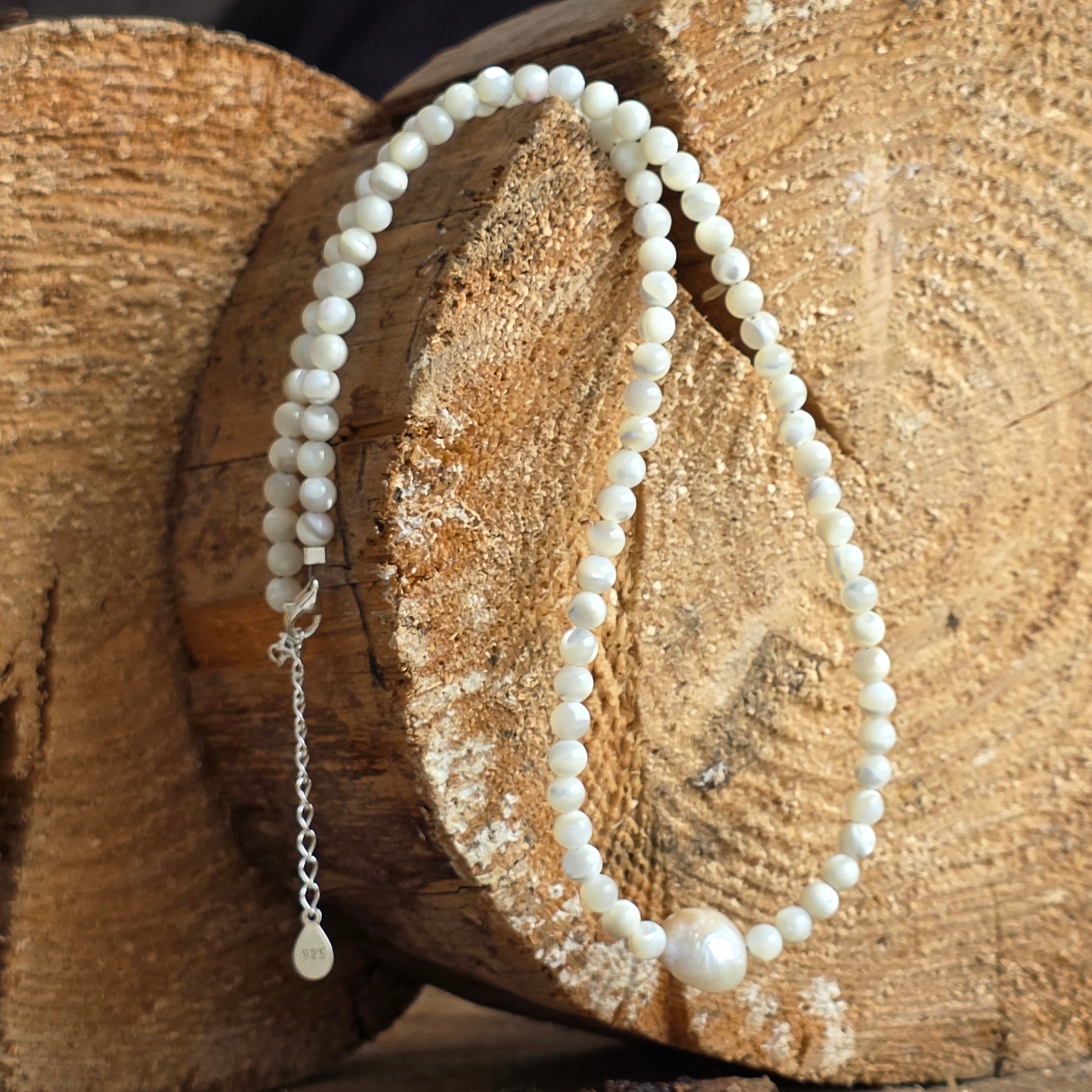 Un colier creat manual, din sidef atent selecționat, care păstrează strălucirea blândă a mării în fiecare reflex. Piesă cu accente naturale și tonuri perlate, sideful aduce o eleganță atemporală și un aer calm, perfect pentru cei care iubesc frumusețea discretă. Ușor de purtat zi de zi sau la ocazii speciale, colierul devine un detaliu subtil ce luminează ținuta și aduce armonie în stilul personal.