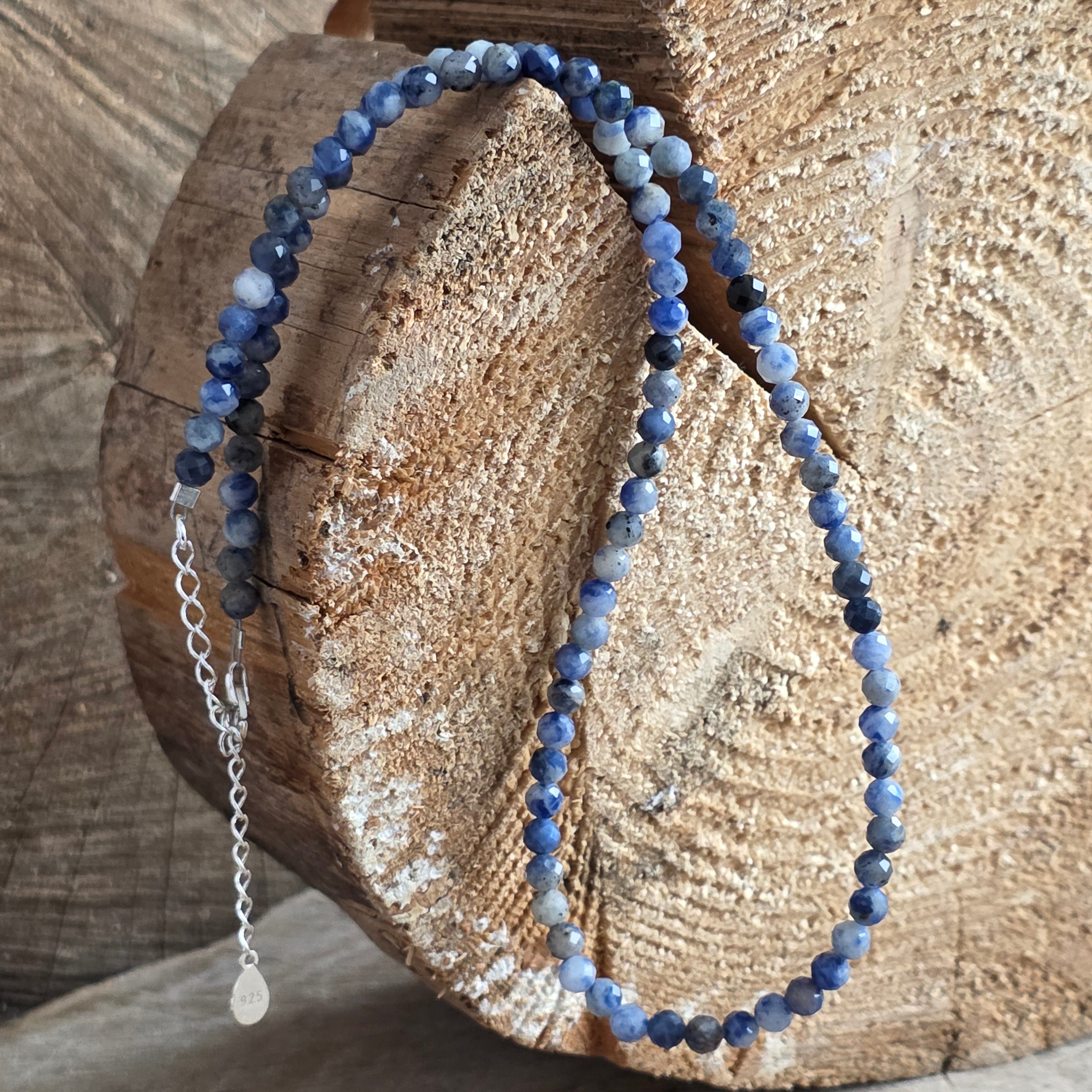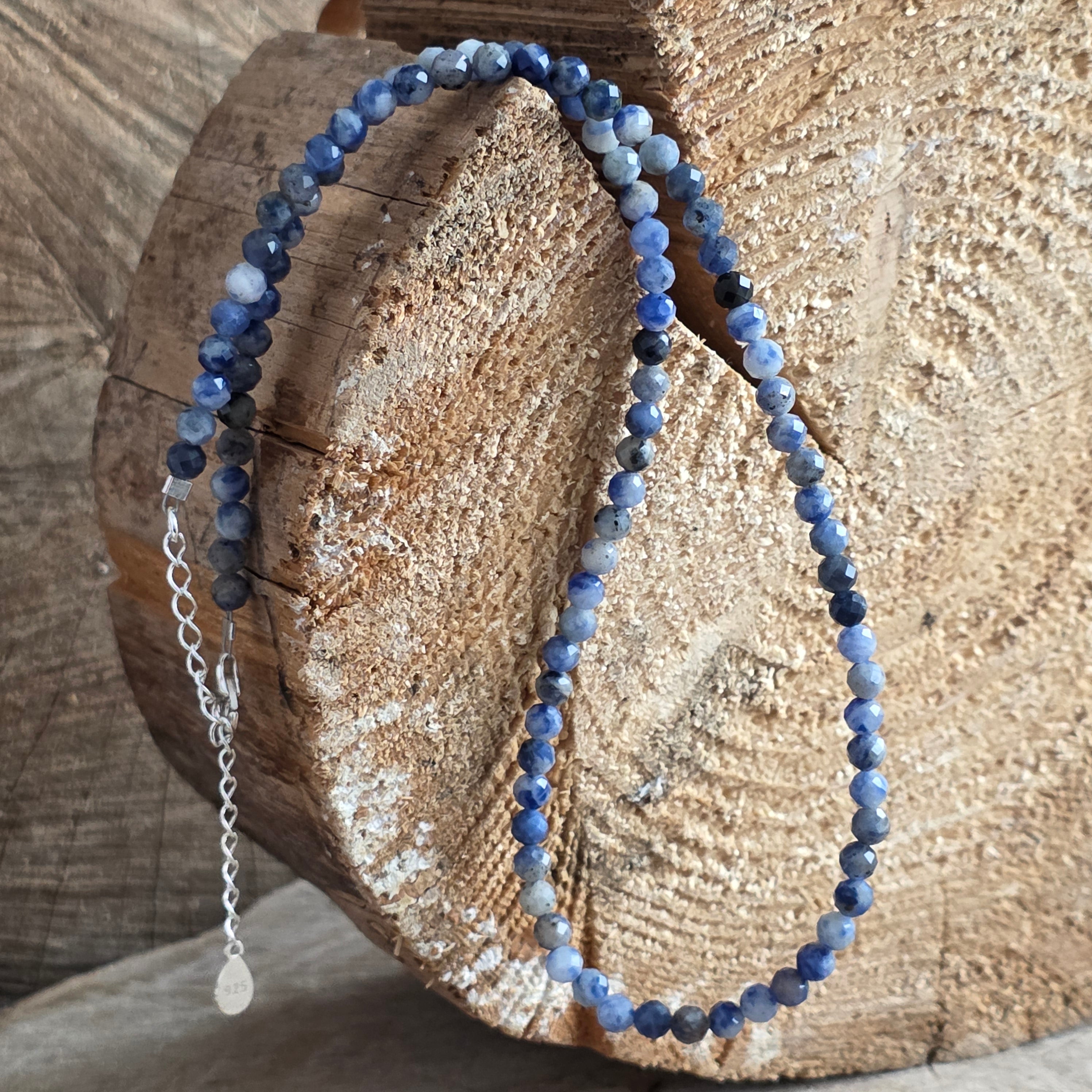 Un colier care poartă seninul cerului și profunzimea gândului limpede. Sodalitul natural fațetat de 4 mm îmbină nuanțe de albastru adânc cu vene fine albe și gri, într-un joc vizual elegant și liniștitor. Fațetele fine reflectă lumina cu discreție, oferind bijuteriei o strălucire subtilă, perfect echilibrată între rafinament și naturalețe.