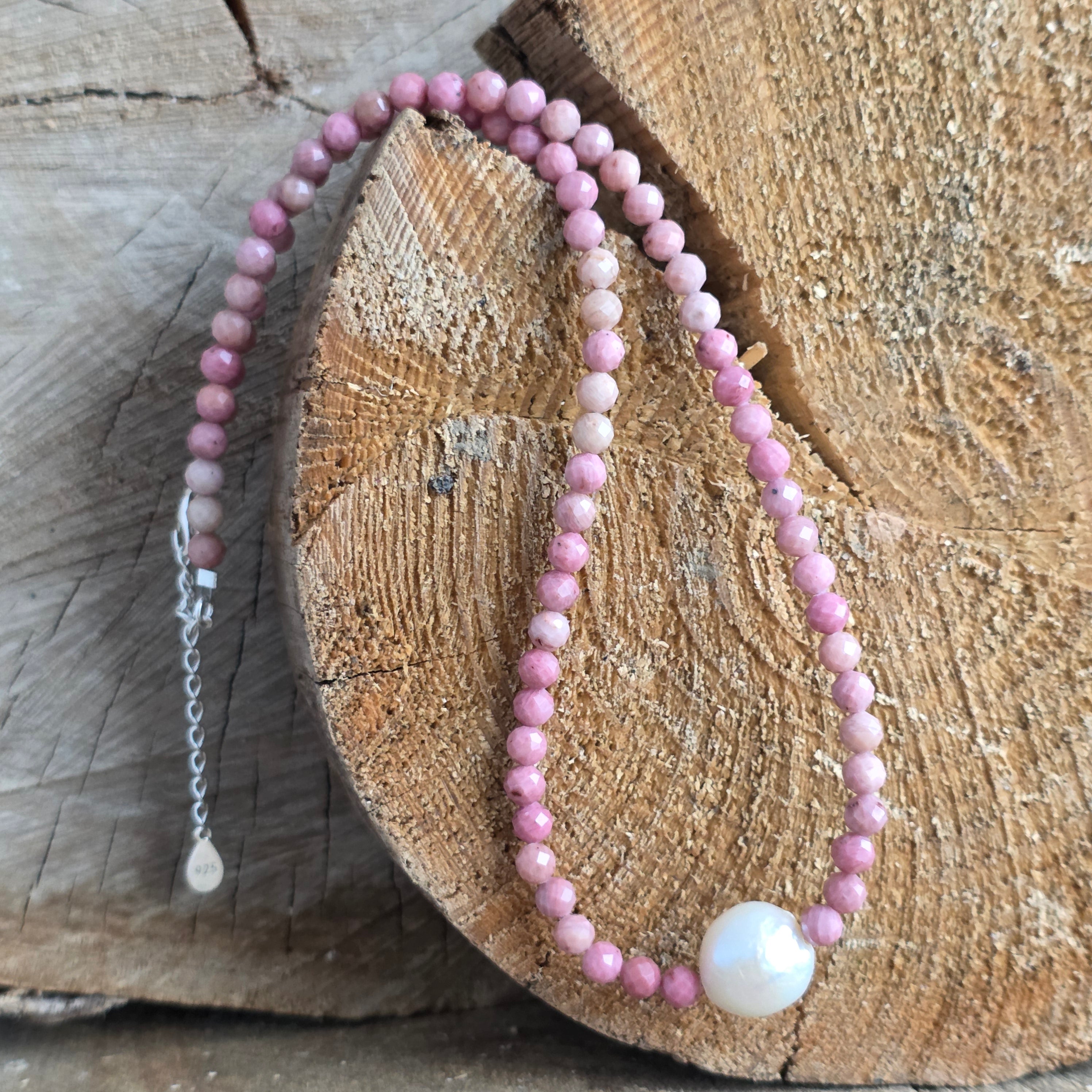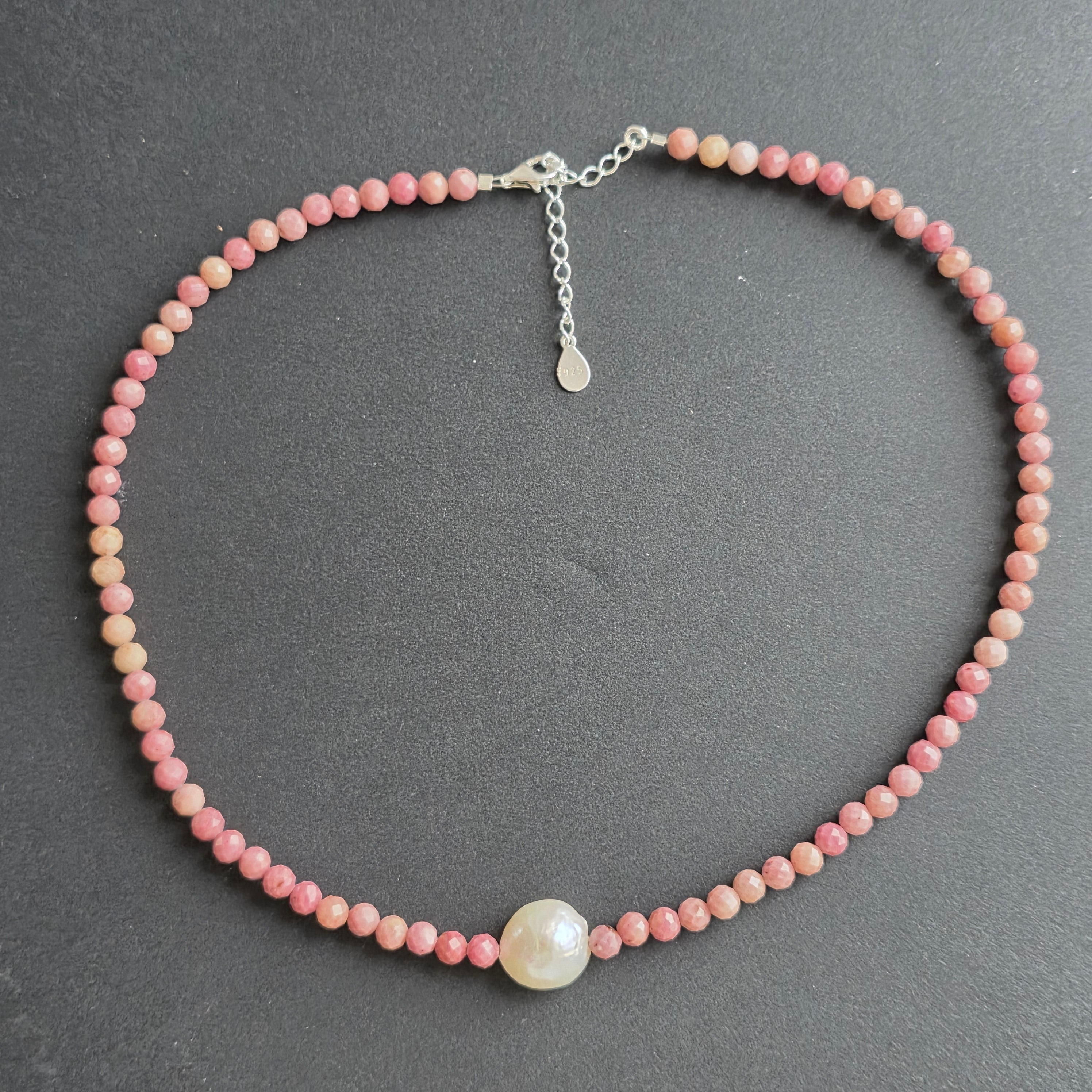 Un colier delicat și expresiv, realizat din sfere fațetate de tulit de 5 mm, puse în valoare de o perlă naturală centrală de 1 cm, care adaugă echilibru și eleganță compoziției. Contrastul dintre rozul cald al tulitului și lumina calmă a perlei creează o bijuterie cu o energie profund feminină și armonioasă.