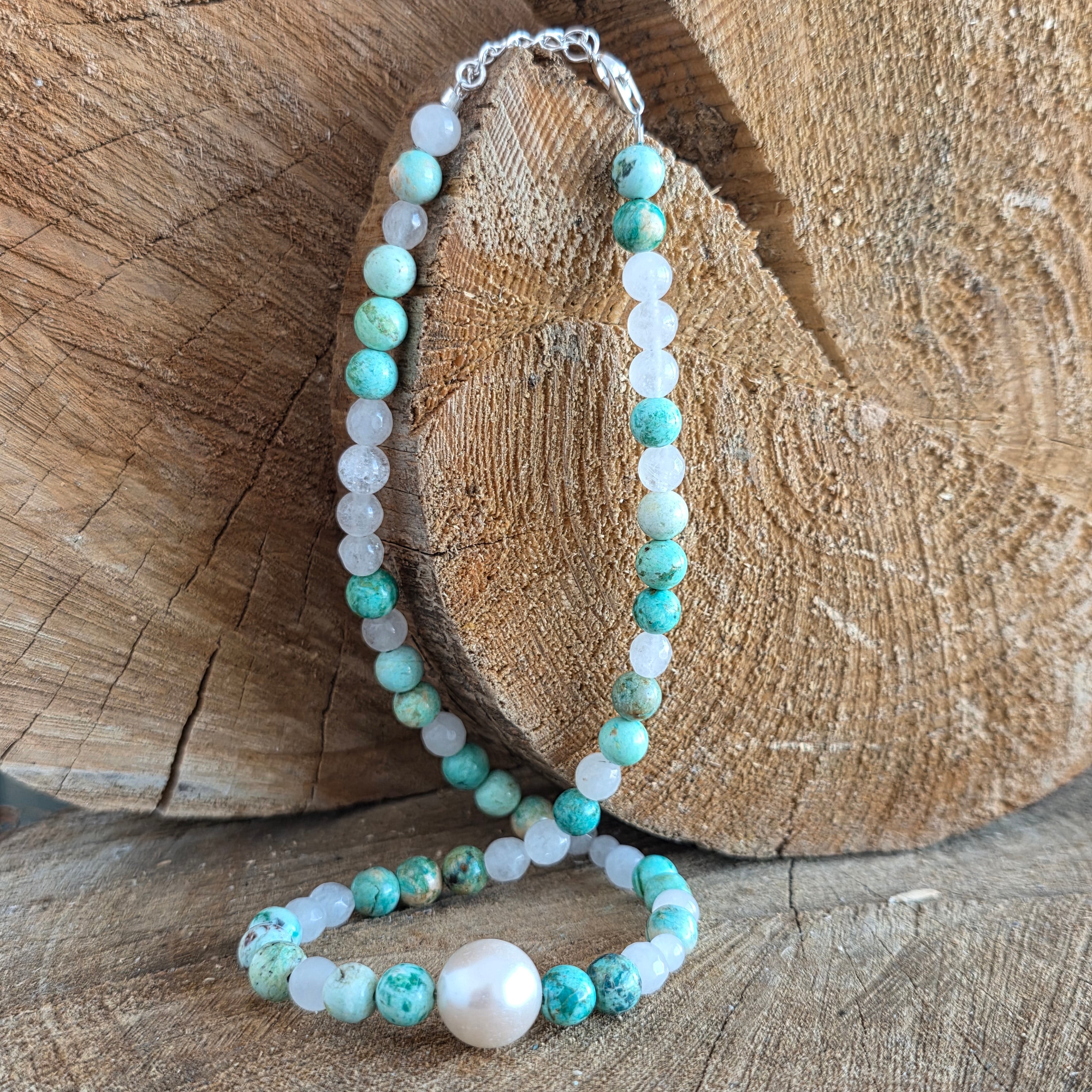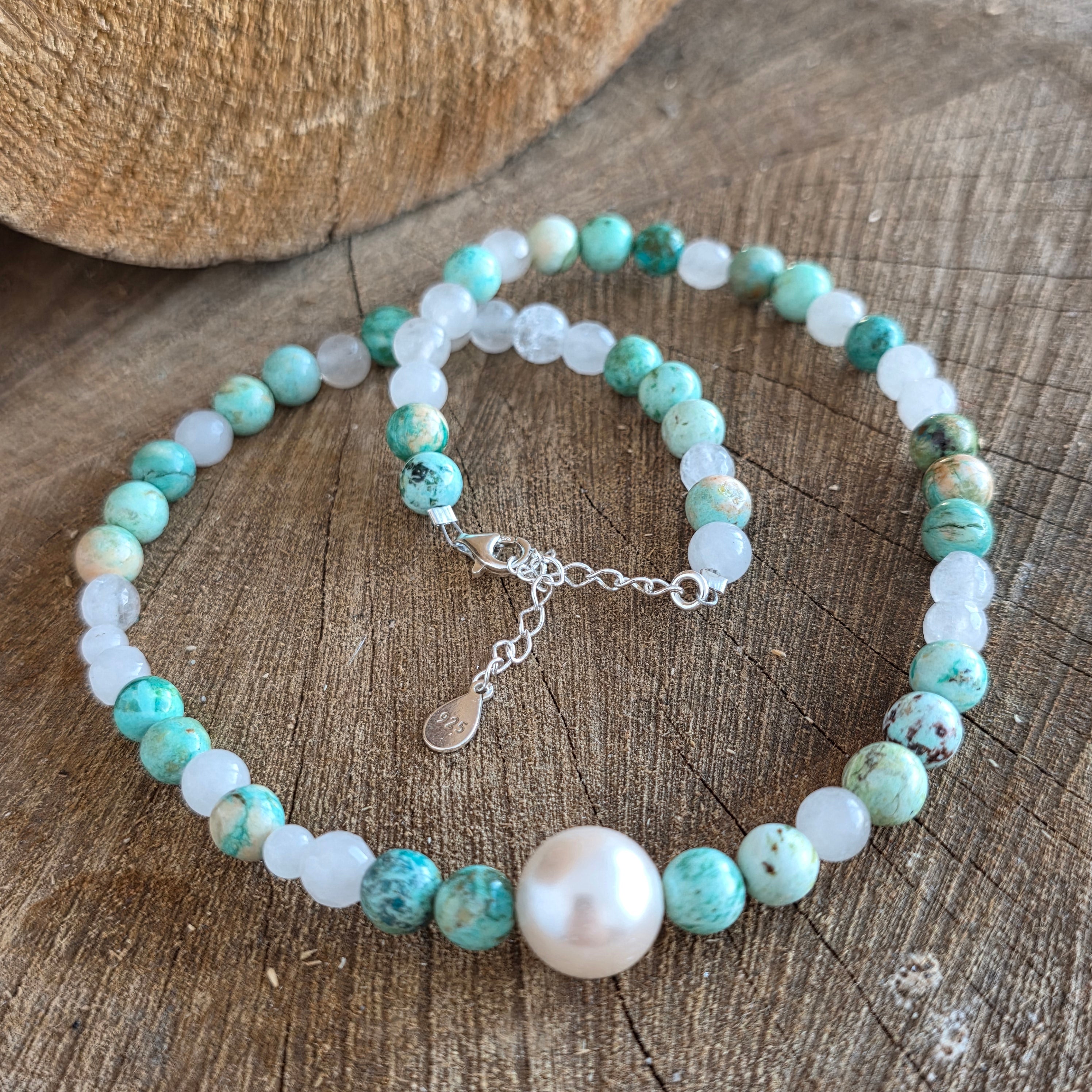 Materiale: turcoaz natural 6 mm, jad natural 5 mm, argint 925, o perla 1 cm