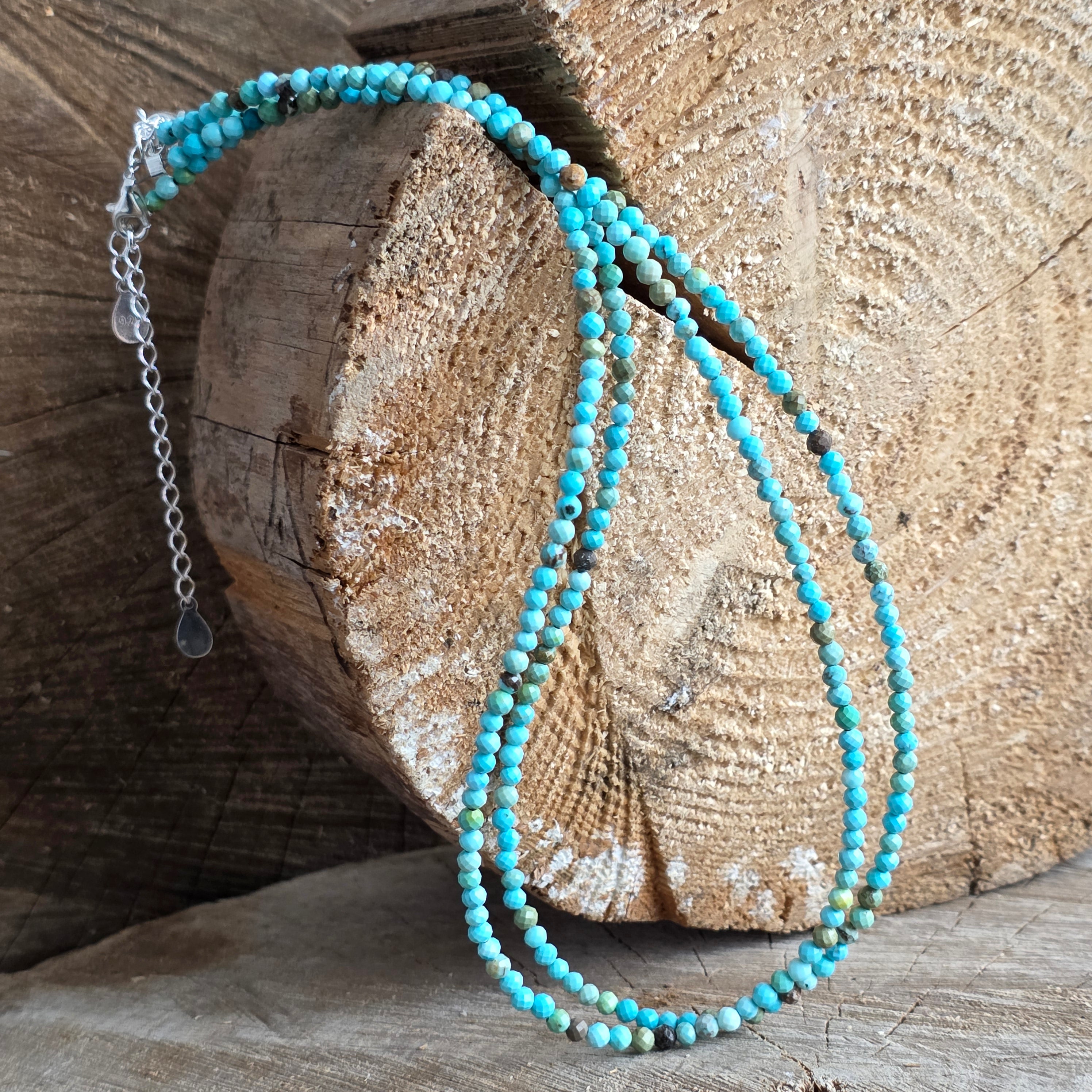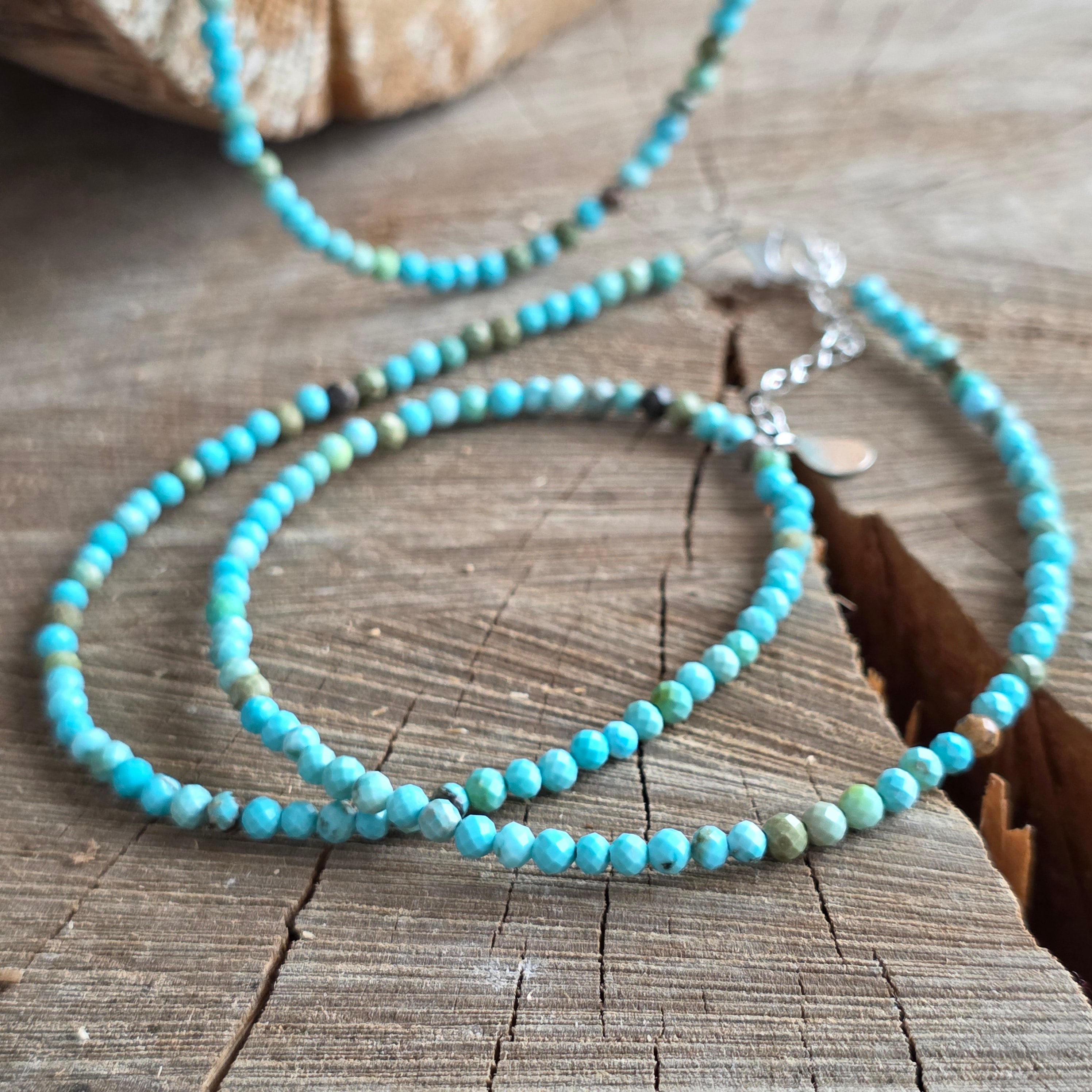 Un colier care poartă seninătatea cerului senin și energia unei dimineți deschise către posibilități. Realizat din turquenit natural, cu sfere fațetate de 3 mm, acest colier fin se așază ca o linie delicată de albastru deschis la baza gâtului – aducând aminte de orizonturi limpezi și gânduri ușoare.