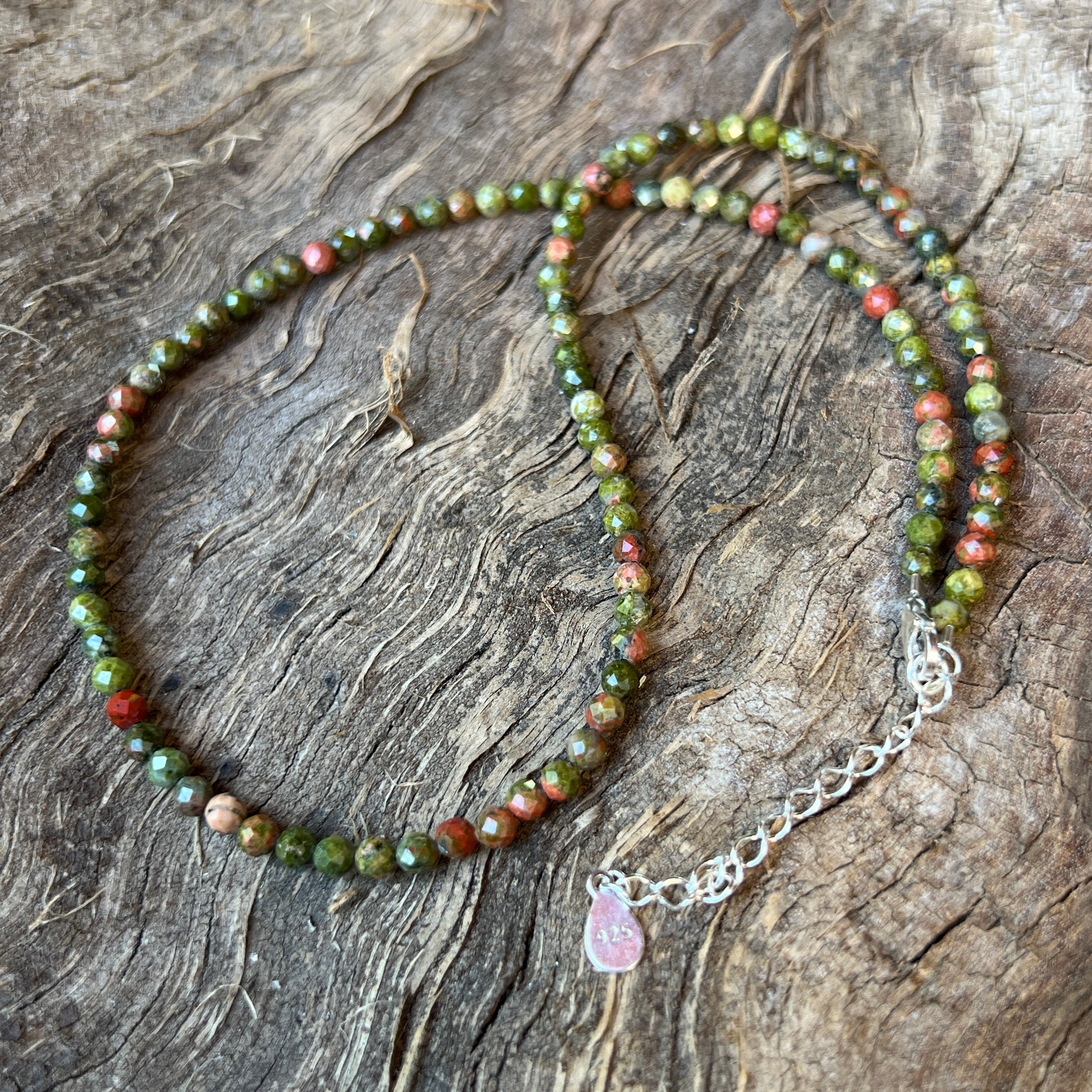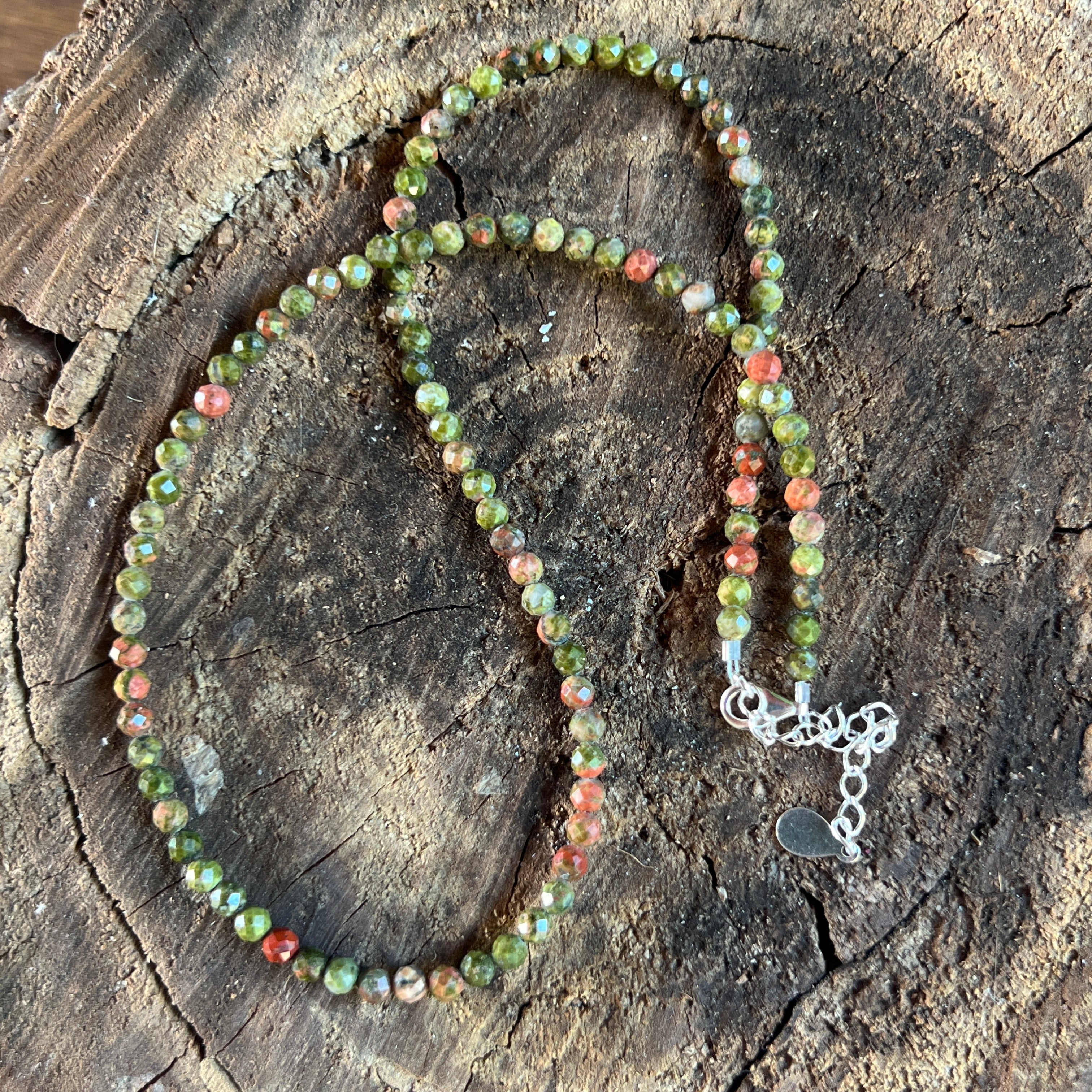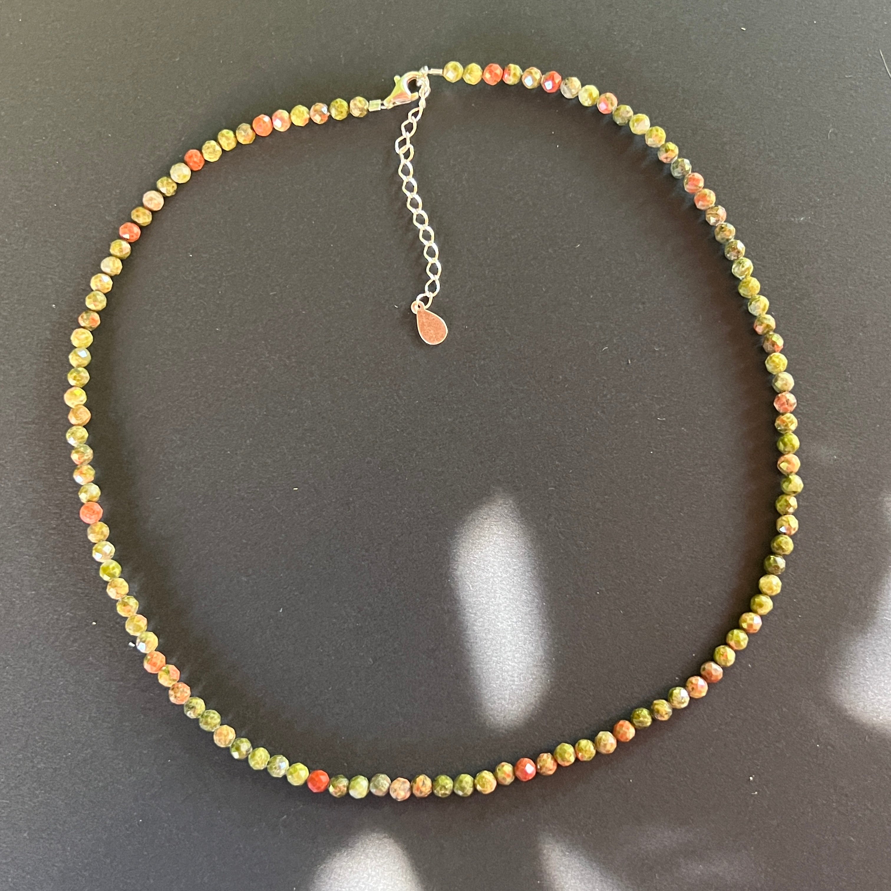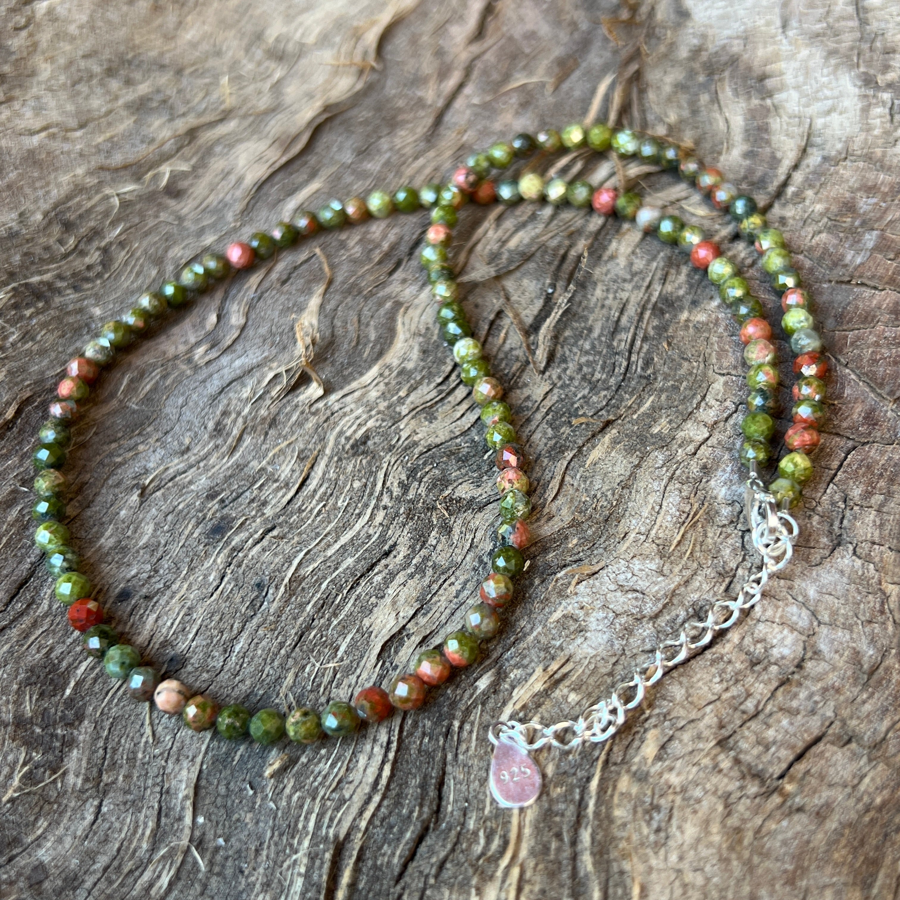 Un colier cu suflet de pământ viu – cald, echilibrat și blând. Mărgelele fațetate de unakit de 4 mm îmbină nuanțe de verde-musc și roz-teracotă, ca un peisaj de toamnă caldă surprins într-un fir de bijuterie.
