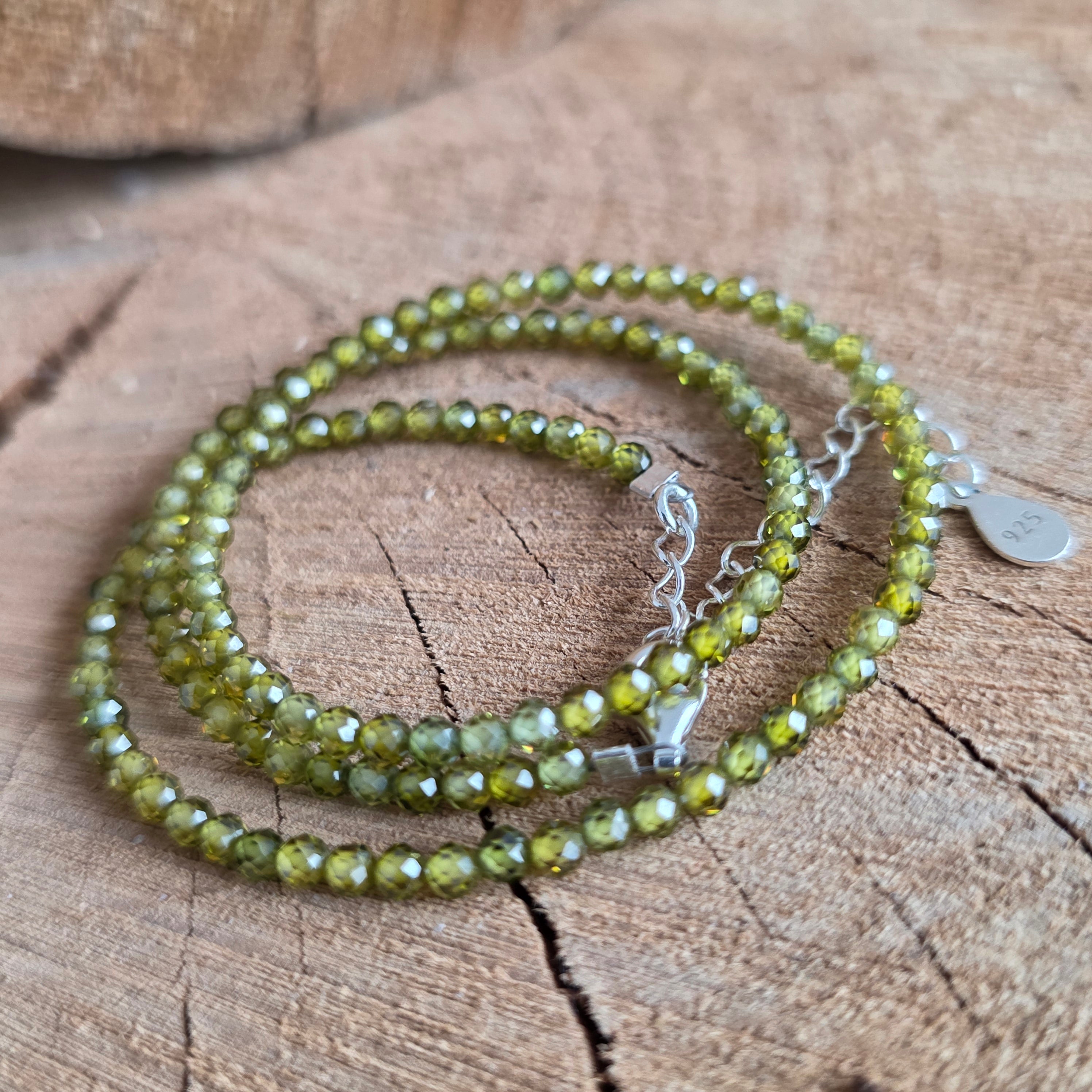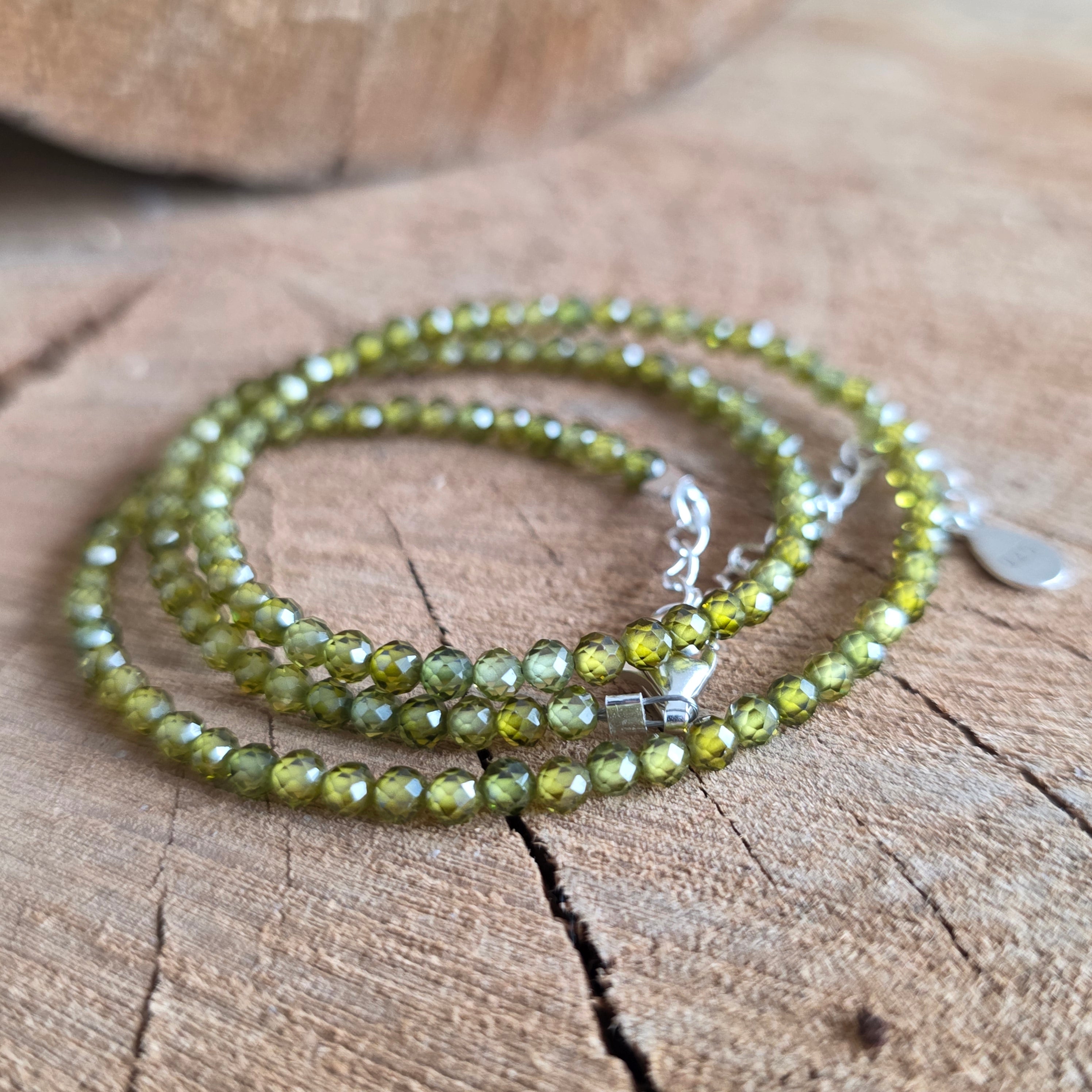Acest colier este realizat din zircon verde natural, ales pentru nuanțele sale proaspete și pentru strălucirea fină, elegantă. Sferele fațetate de 2,5 mm reflectă delicat lumina, creând un joc subtil de sclipiri care conferă bijuteriei un aer rafinat și luminos.