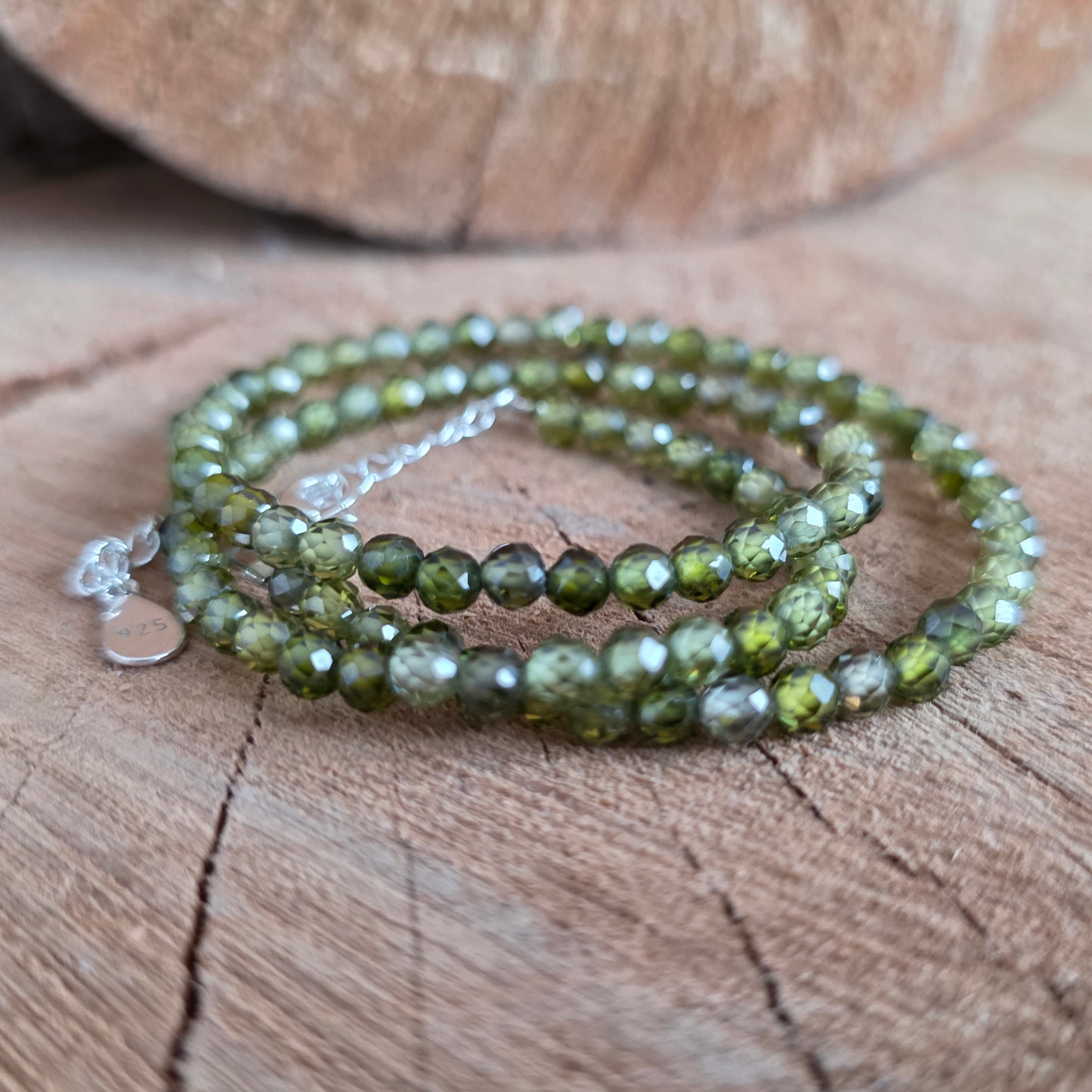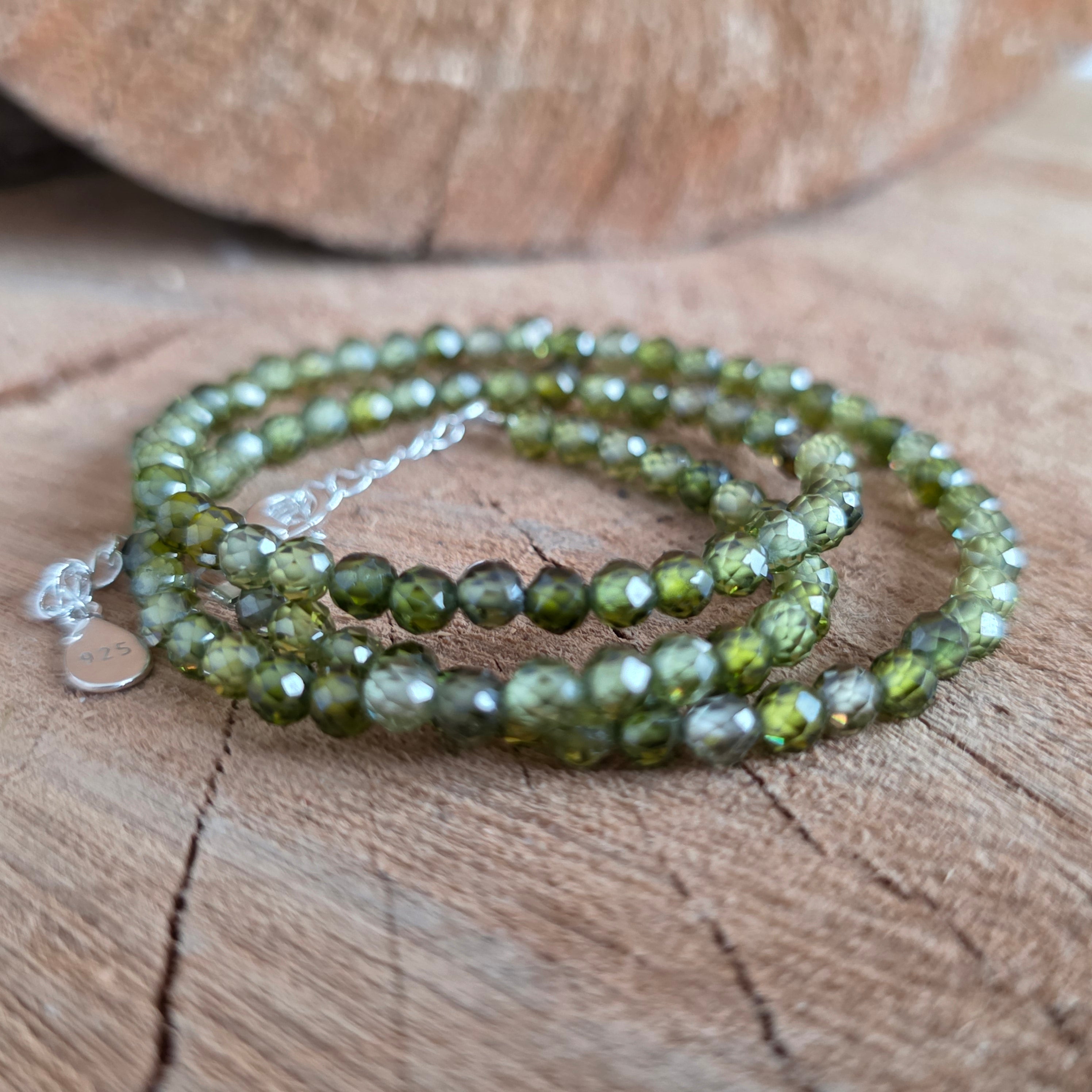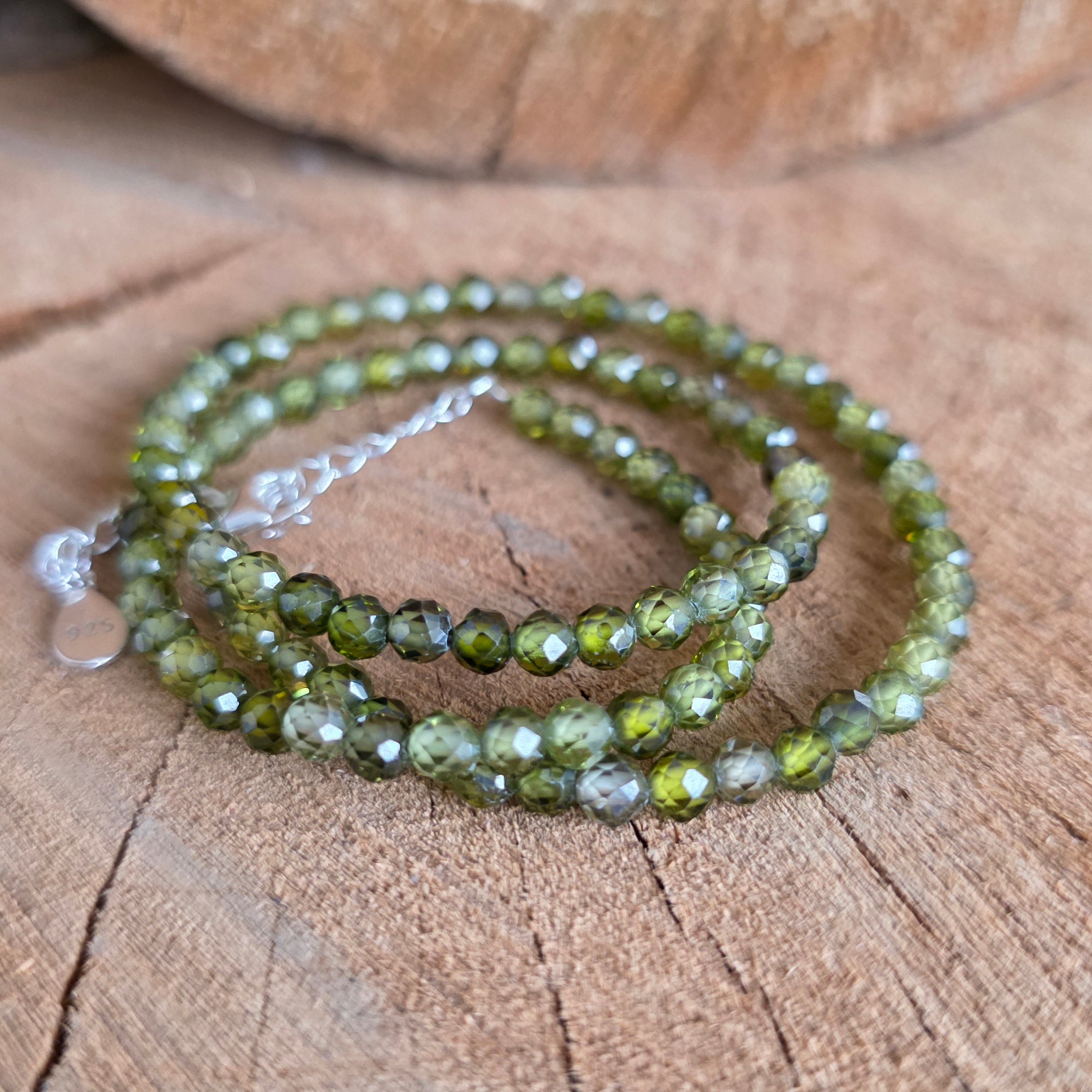 Acest colier este realizat din zircon verde natural, ales pentru nuanțele sale proaspete și pentru strălucirea fină, elegantă. Sferele fațetate de 3 mm reflectă delicat lumina, creând un joc subtil de sclipiri care conferă bijuteriei un aer rafinat și luminos.
