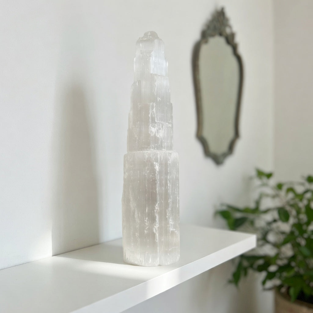 Selenitul este adesea folosit ca un cristal de sprijin în practicile spirituale, ajutând la deschiderea și activarea chakrelor 6 si 7, care sunt asociate cu intuiția, clarviziunea și conexiunea la nivel spiritual.