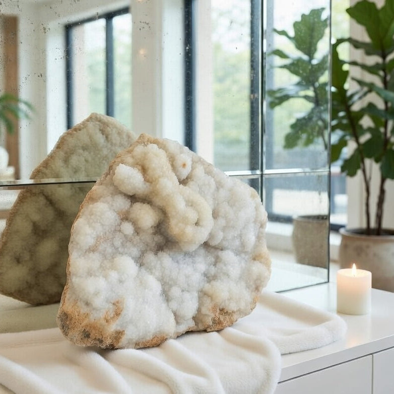 Structura botrioidală – asemănătoare unor ciorchini fuzionați sau nori minerali – este o expresie rară a modului în care cuarțul se poate manifesta atunci când crește liber, în cavități umplute lent cu siliciu. Nu este doar o piatră, ci o operă geologică ce îmbină energia brută a Pământului cu o frumusețe eterică.
