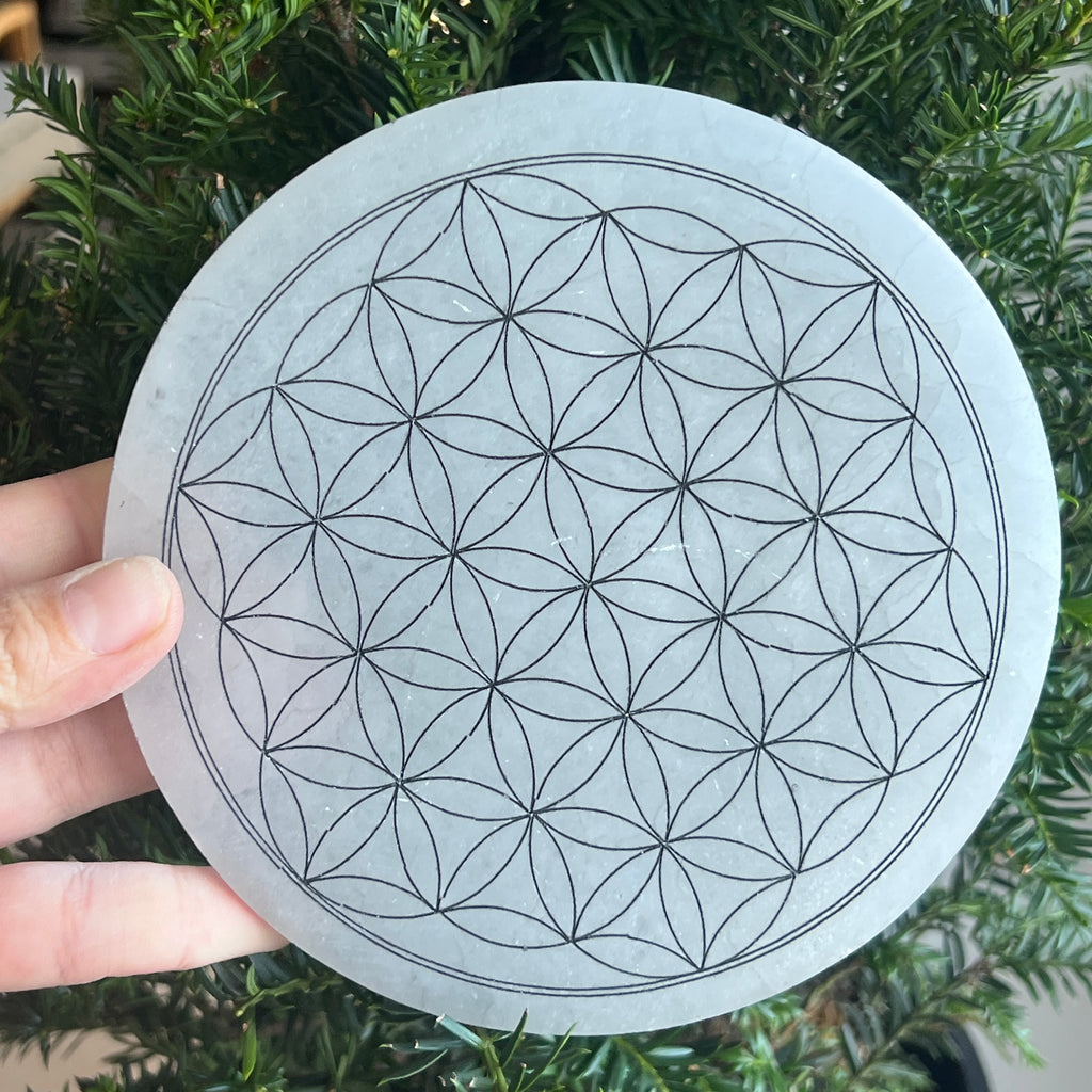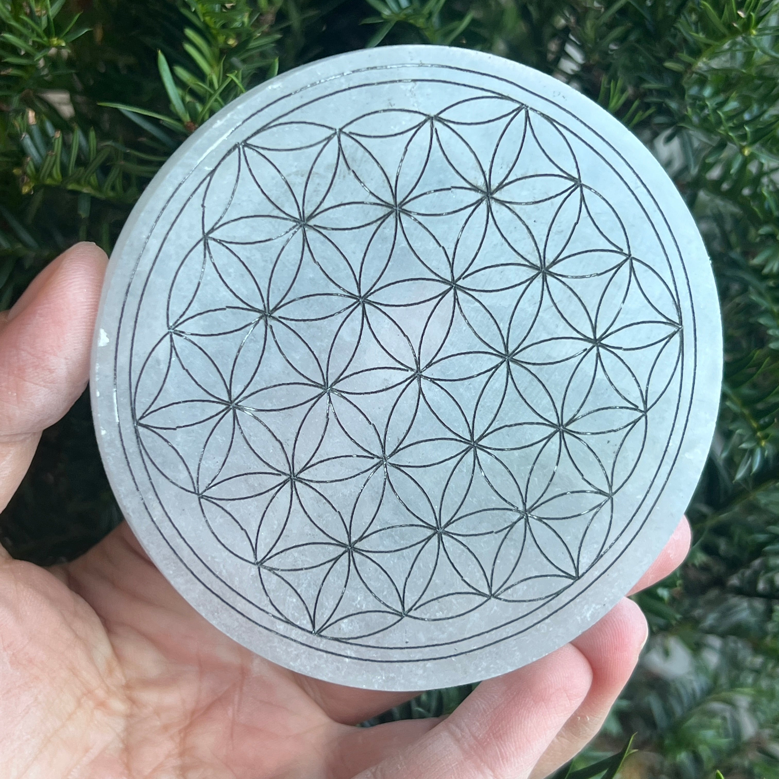 Alege Discul din Selenit cu Floarea Vieții / Flower of Life pentru a aduce în viața ta energie pură, armonie și protecție. O piesă unică, care îmbină geometria sacră cu lumina subtilă a mineralului natural. 🤍✨