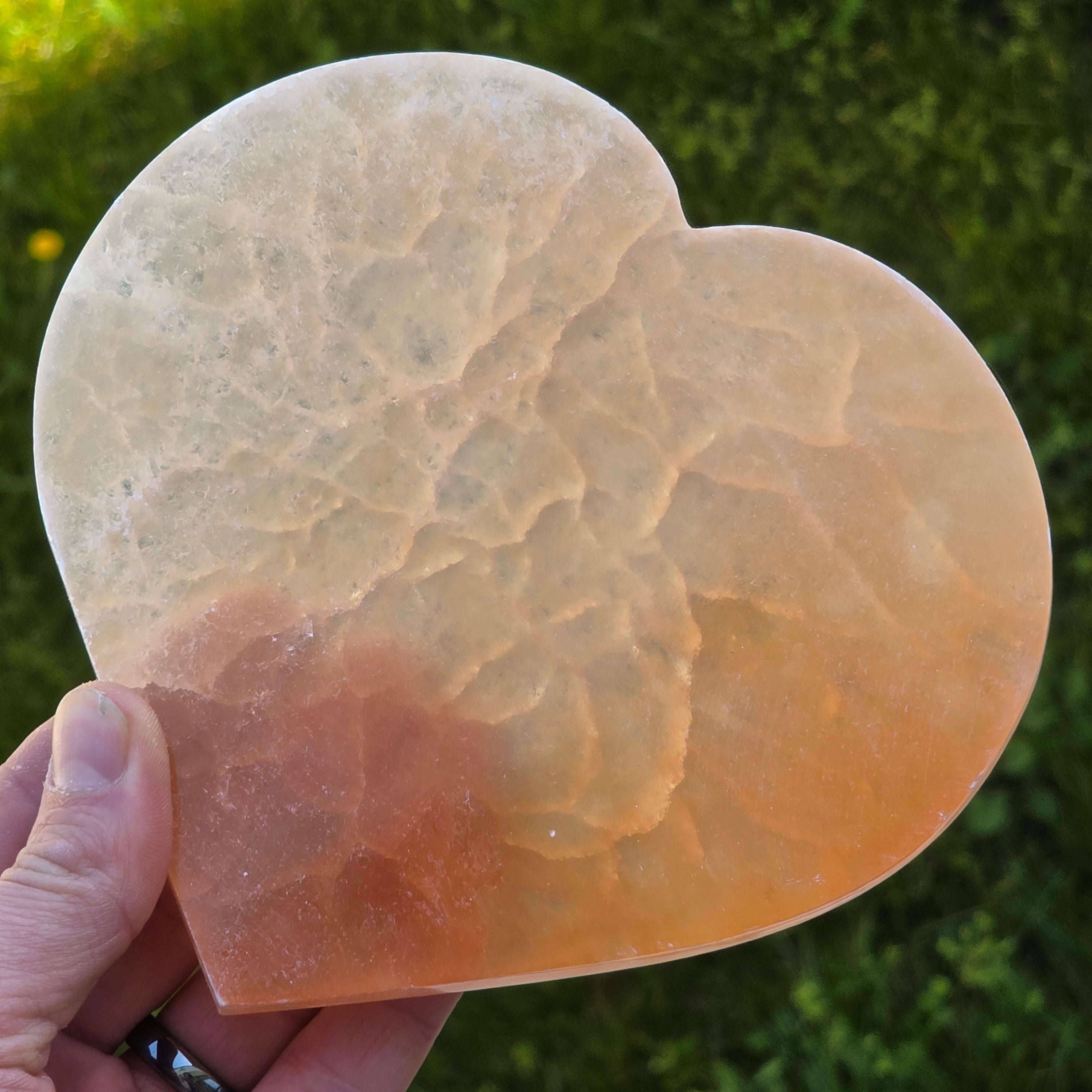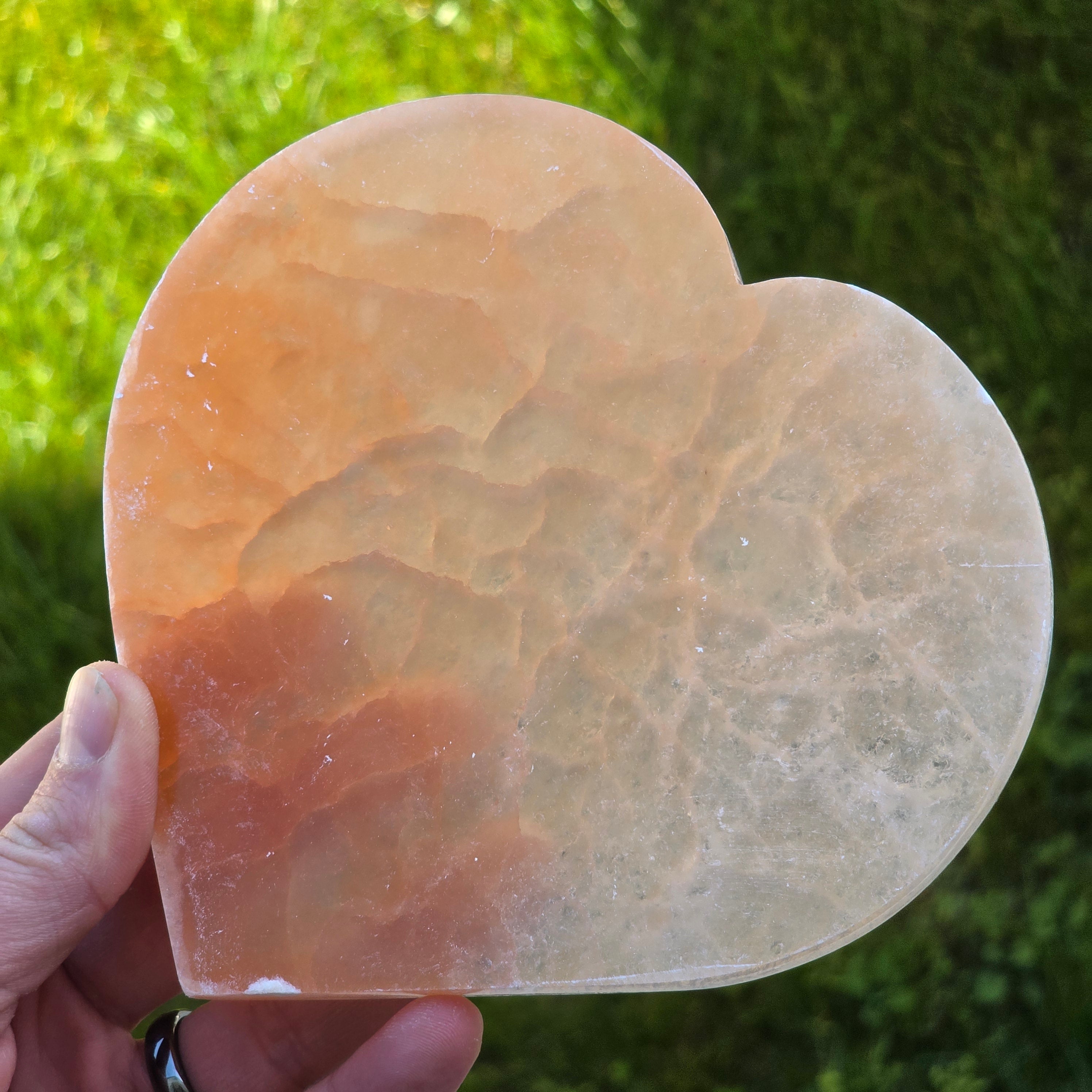 Inima din Selenit Portocaliu este una dintre cele mai calde și expresive sculpturi realizate din acest mineral luminos. Nuanța sa portocalie, rară și profundă, poartă în ea căldura nisipurilor marocane și lumina blândă a răsăriturilor de deșert. Este o piesă care pare să strălucească din interior, datorită fibrelor naturale ale selenitului ce reflectă lumina în valuri fine, mătăsoase - este un simbol al bucuriei, al vitalității și al deschiderii sufletești.