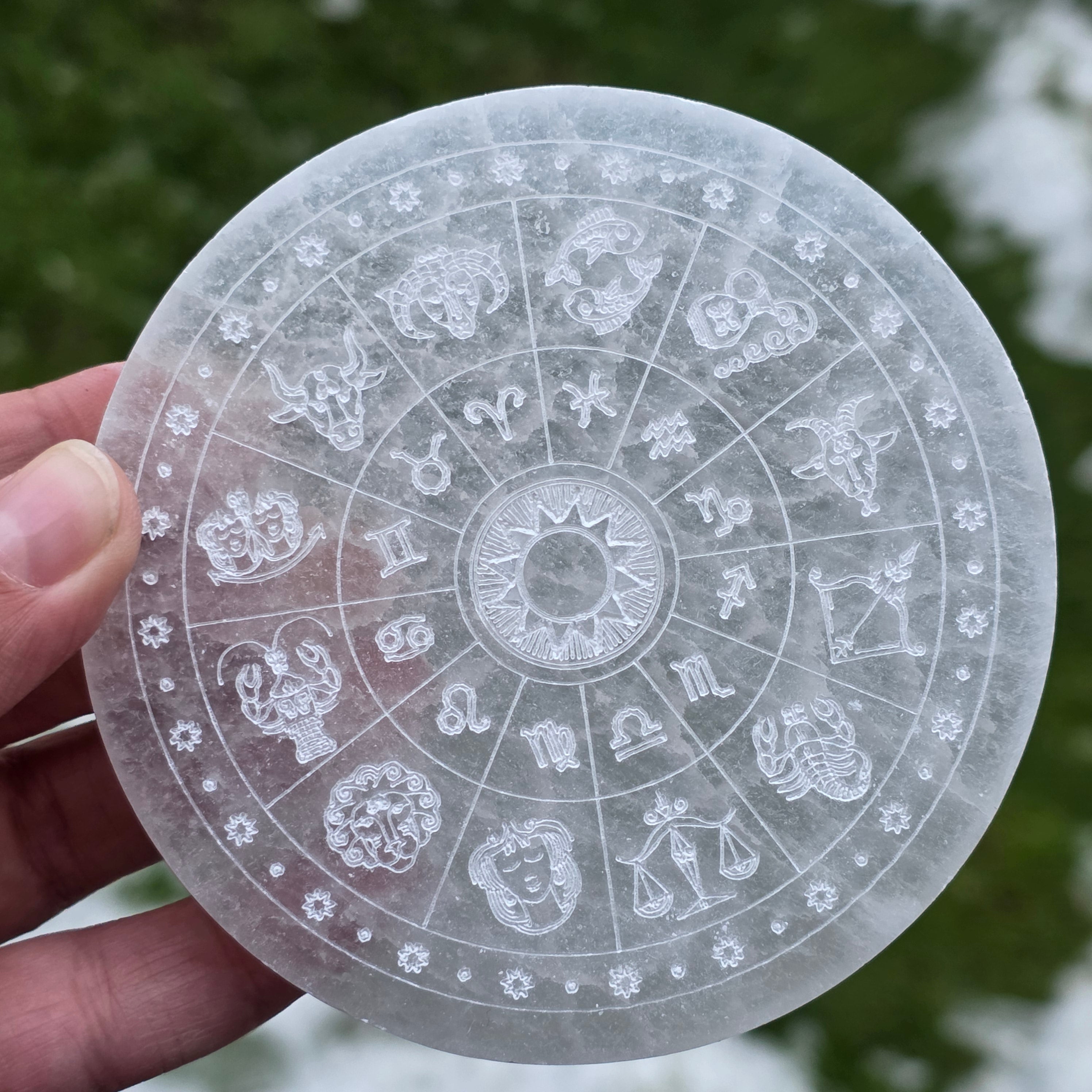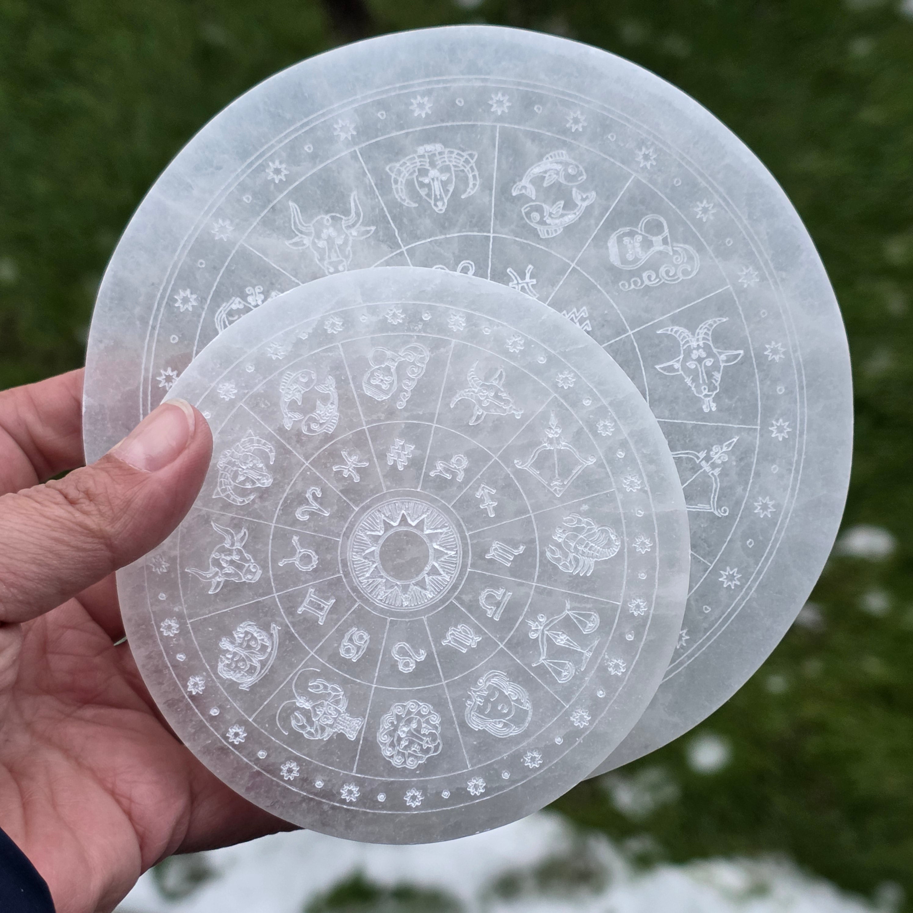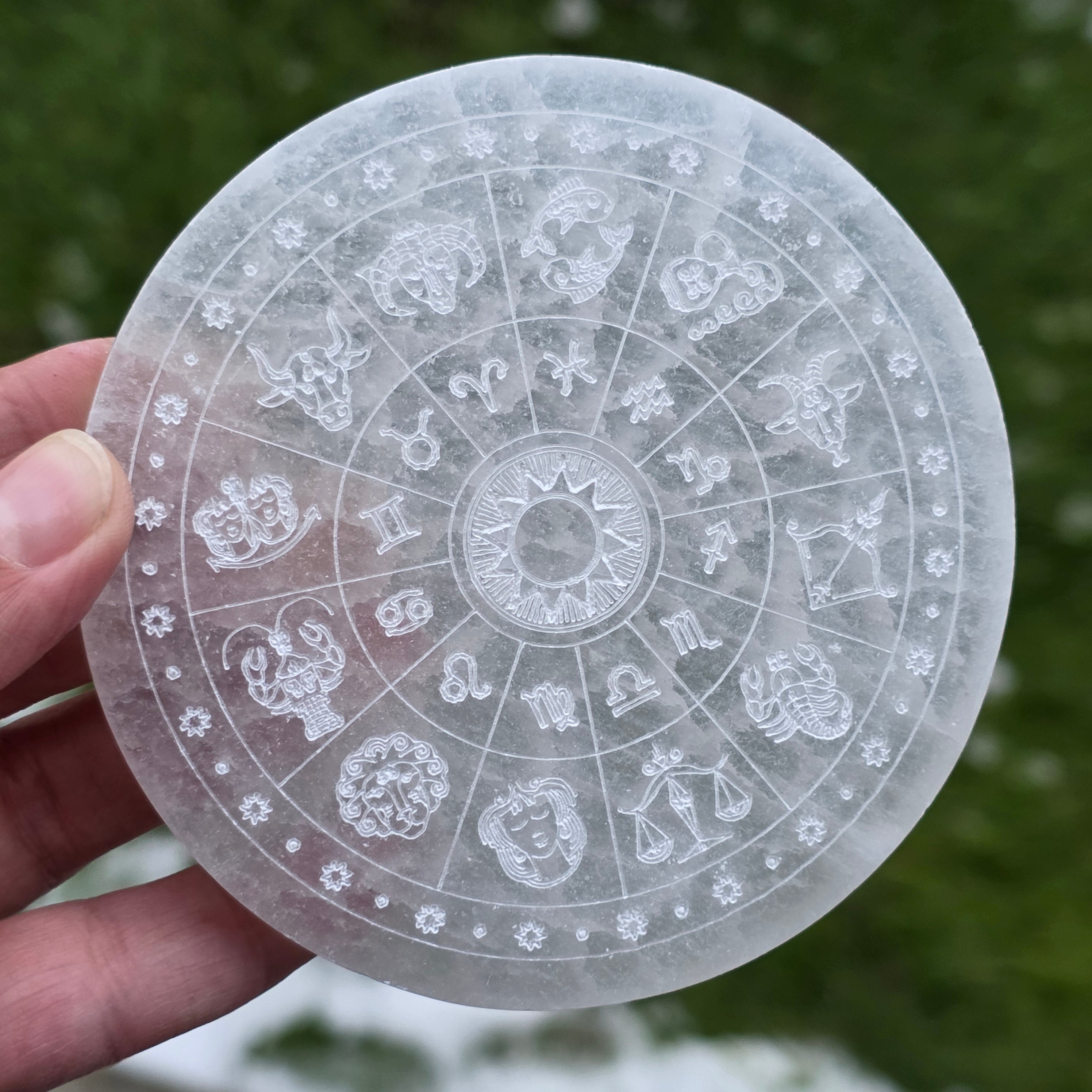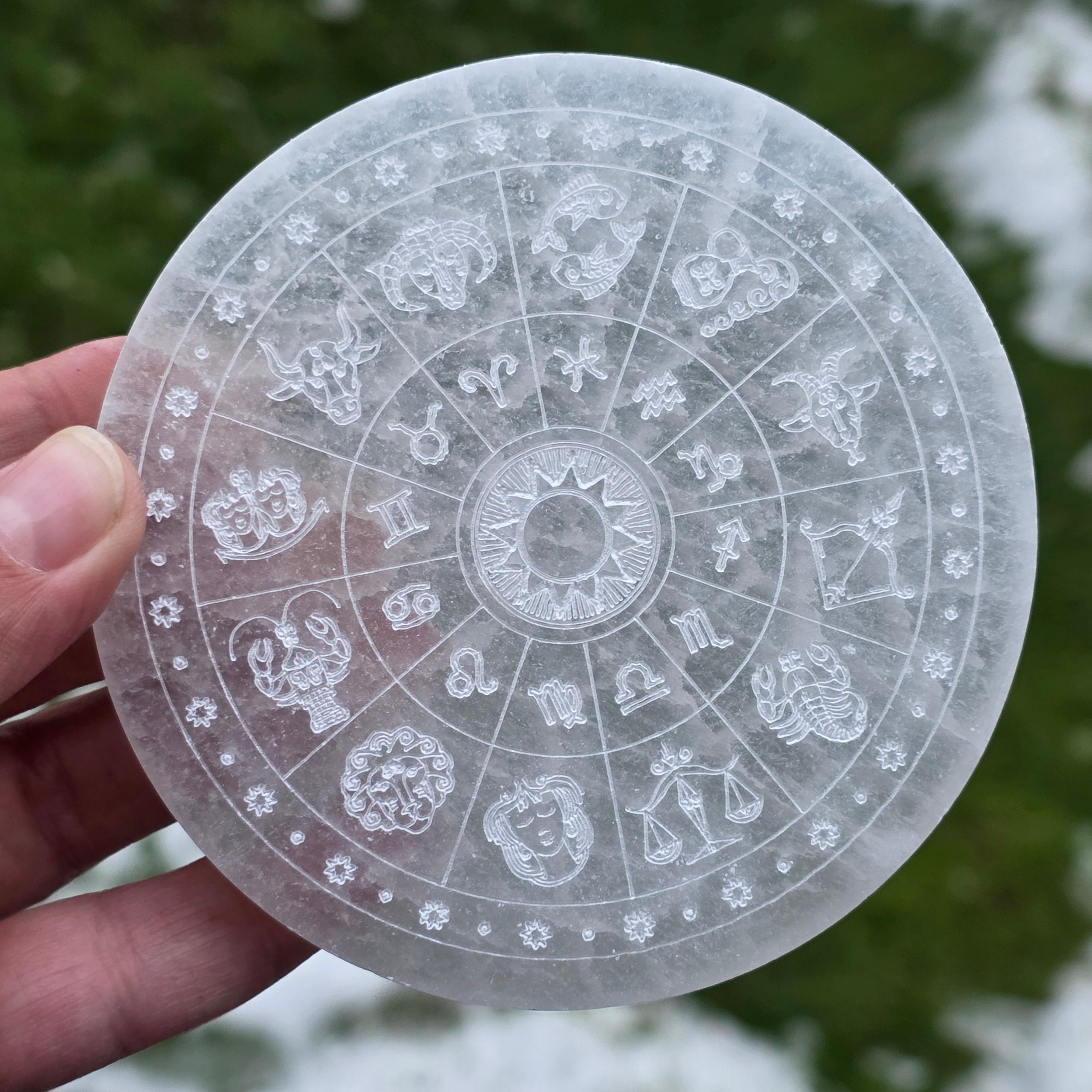 Alege acest disc din Selenit cu simboluri zodiacale ca instrument de purificare și reconectare la ritmurile universului.