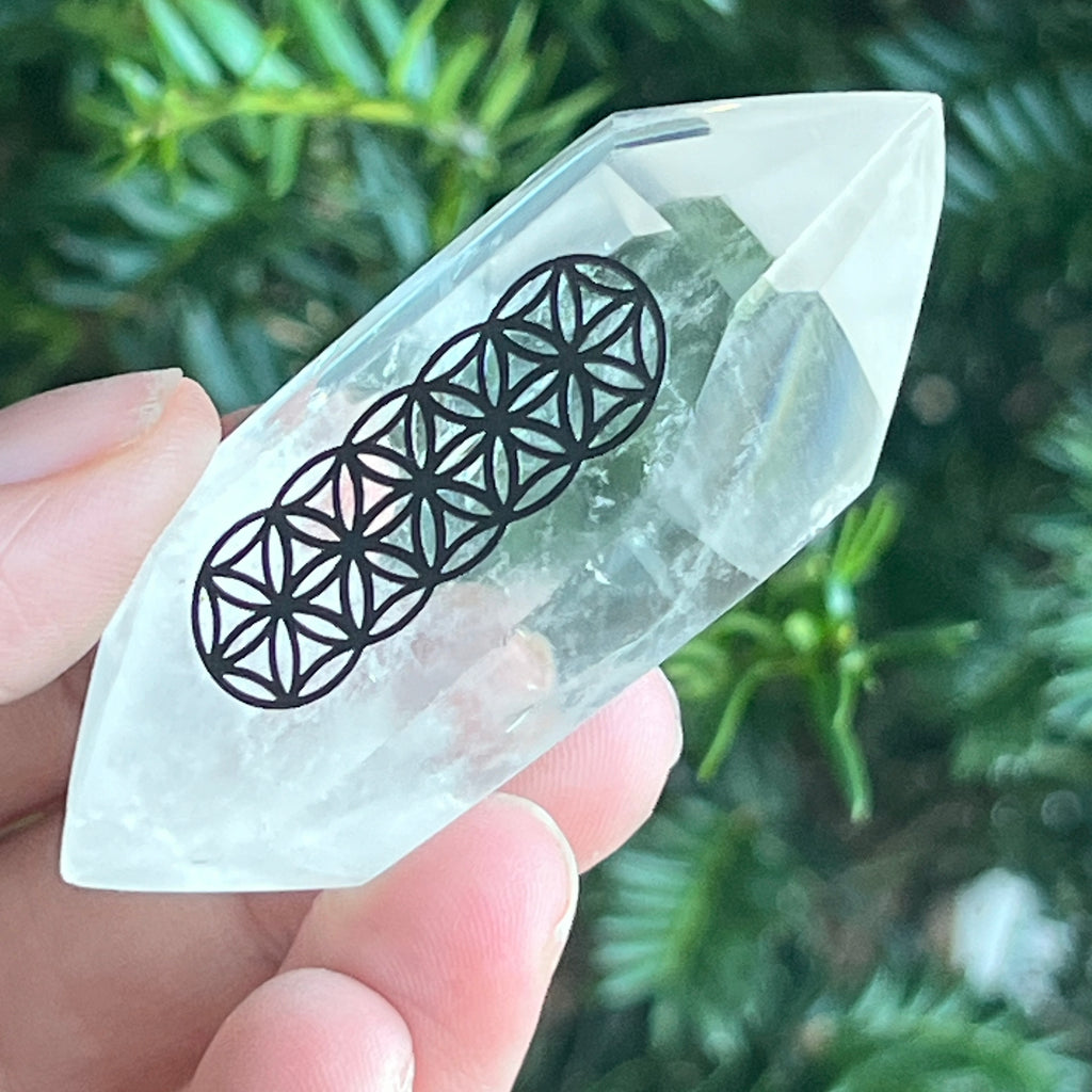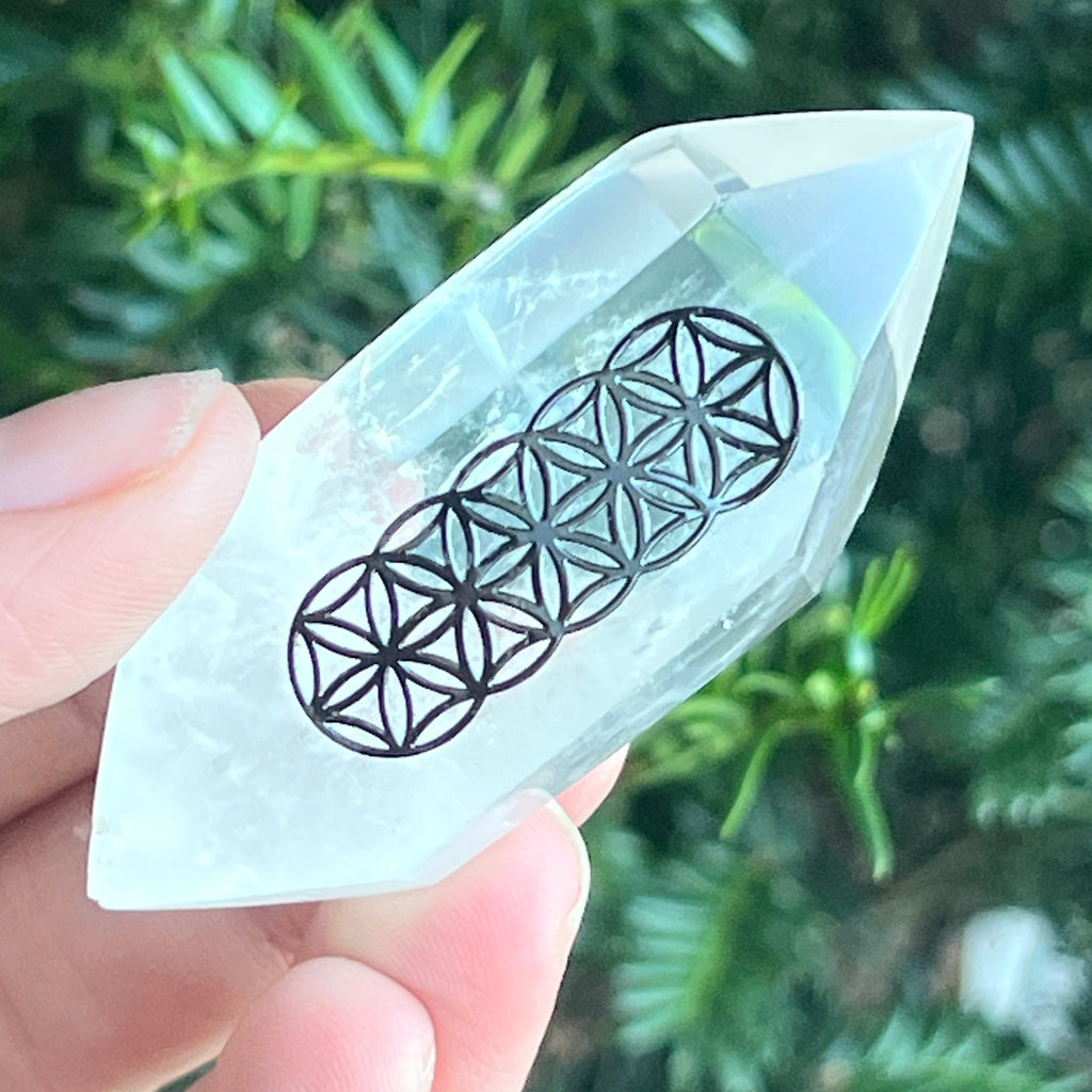 Piatra cu dublu vârf din cuart incolor gravată cu Floarea Vieții / Flower of Life este ideală pentru:
