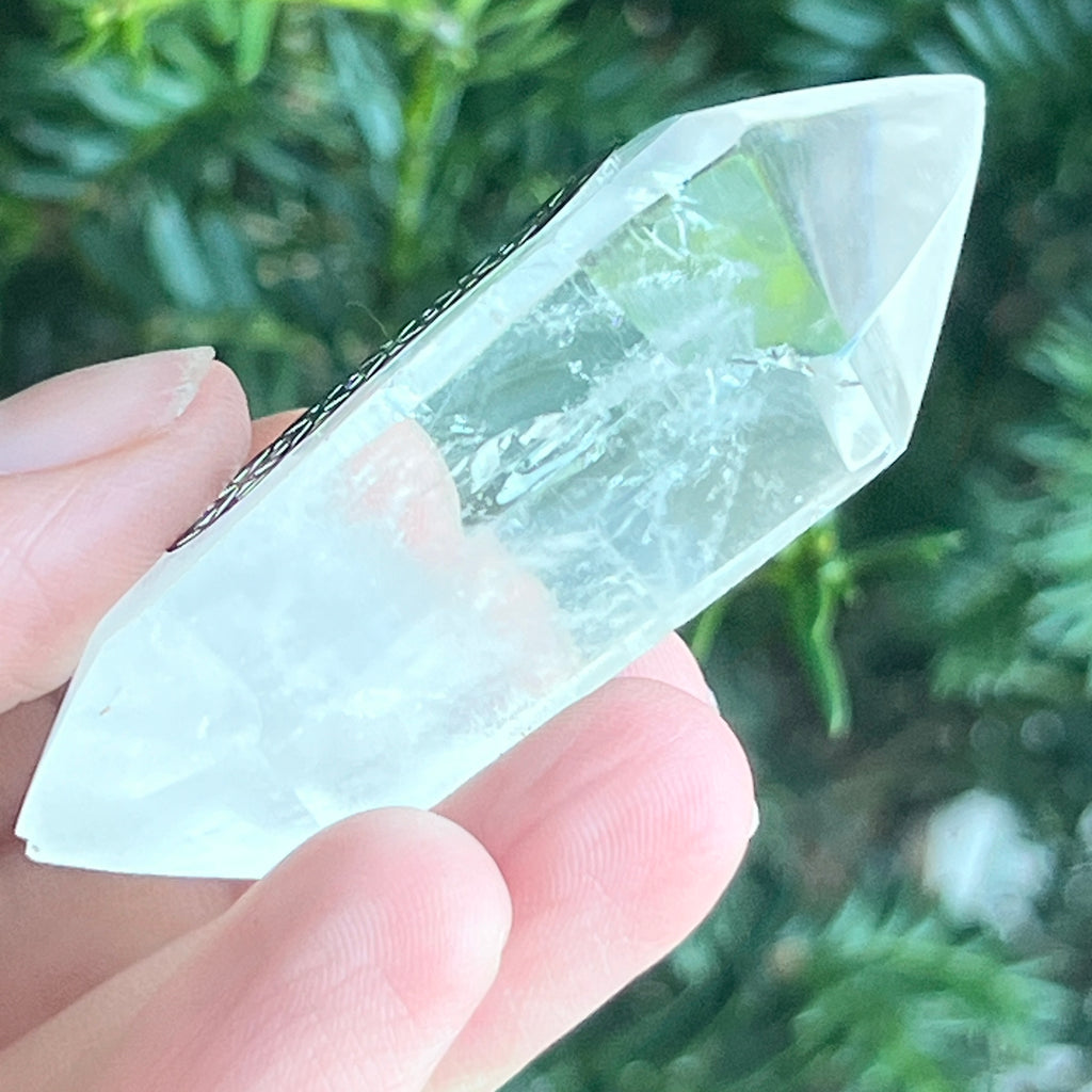 Această piesă din Cuart Incolor natural este o expresie perfectă a echilibrului. Forma cu dublu vârf permite energiei să circule în ambele direcții — simbol al fluxului continuu dintre a primi și a dărui, dintre interior și exterior, dintre spirit și materie.