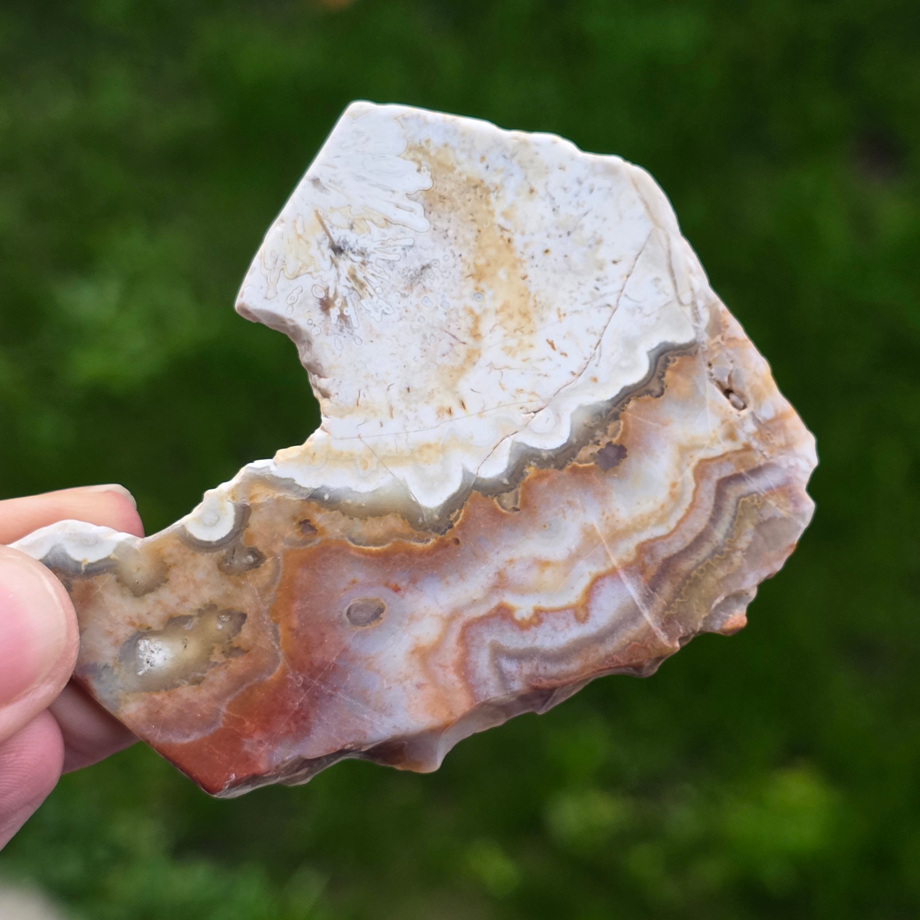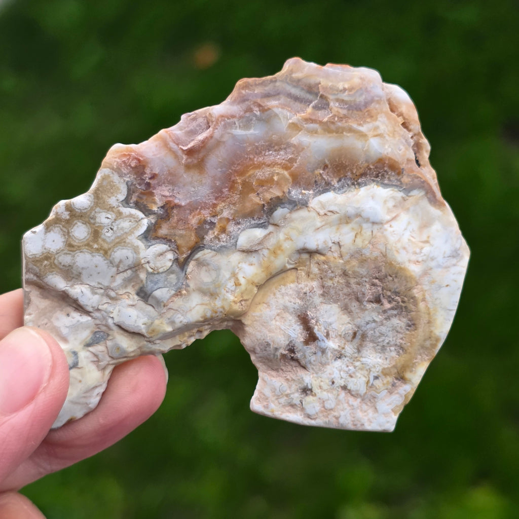 Agatul Crazy din Mexic este una dintre cele mai vibrante și spectaculoase varietăți de agat, celebru pentru liniile sale ondulate și jocurile nebunești de culori ce par desenate de o mână liberă, fără reguli. În această felie naturală, mică dar extrem de expresivă, se dezvăluie întreaga poveste a pietrei: straturi pământii, nuanțe calde de caramel, roșu aprins, portocaliu, gri și crem, amestecate în modele spiralate care par să pulseze cu viață.