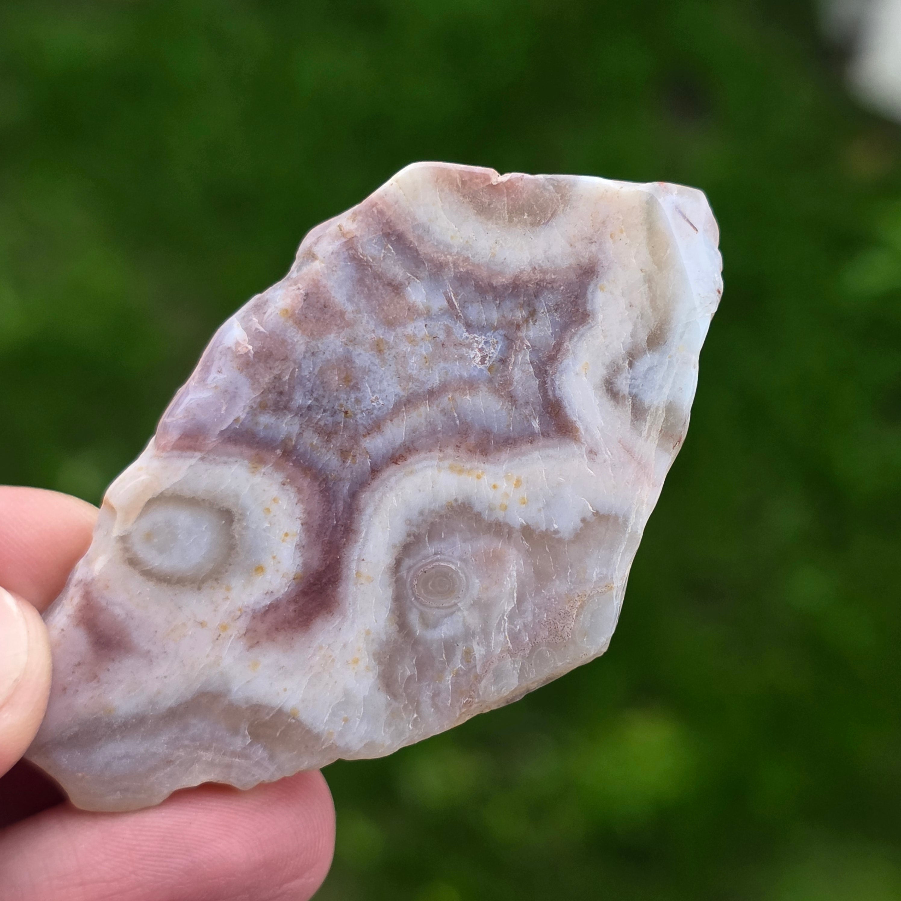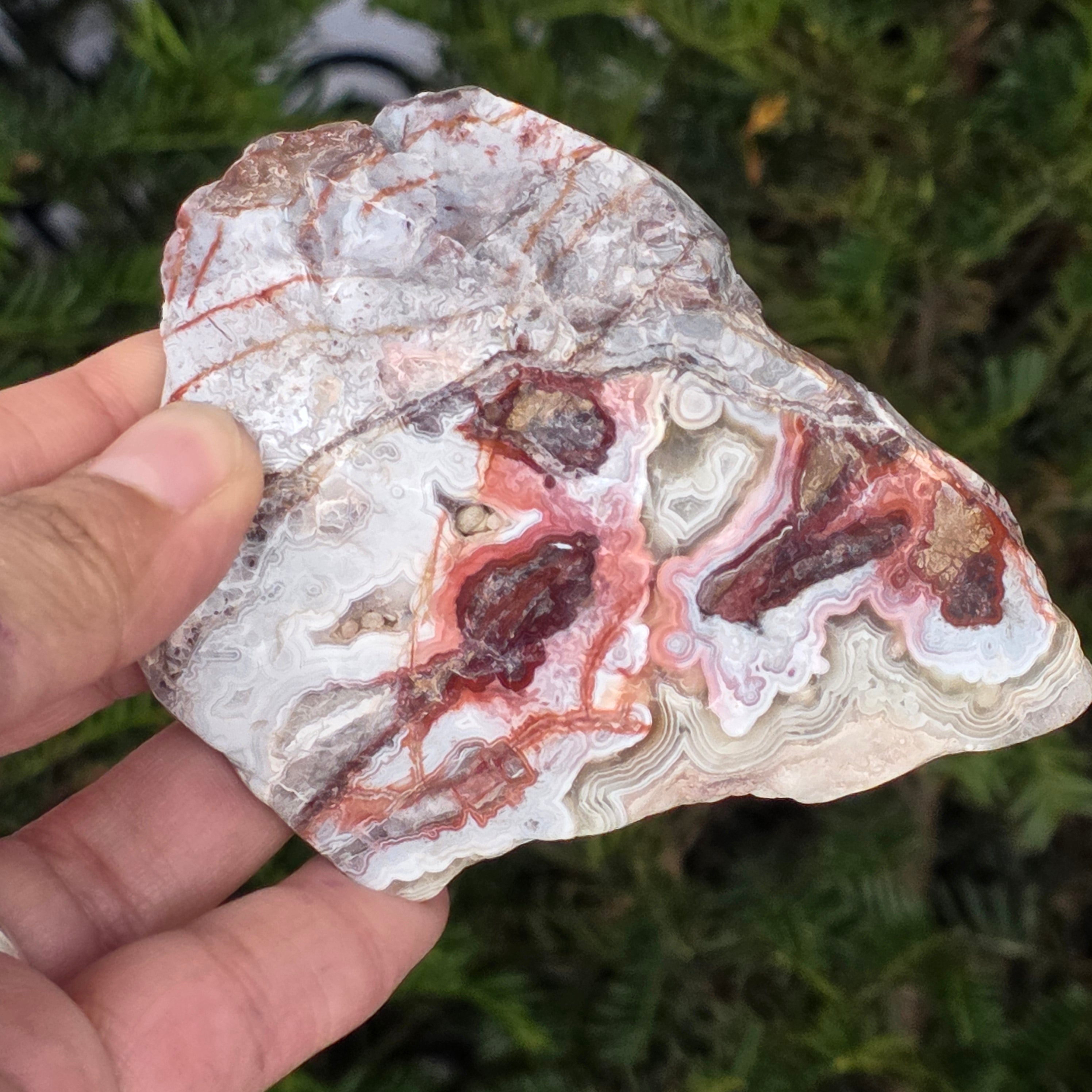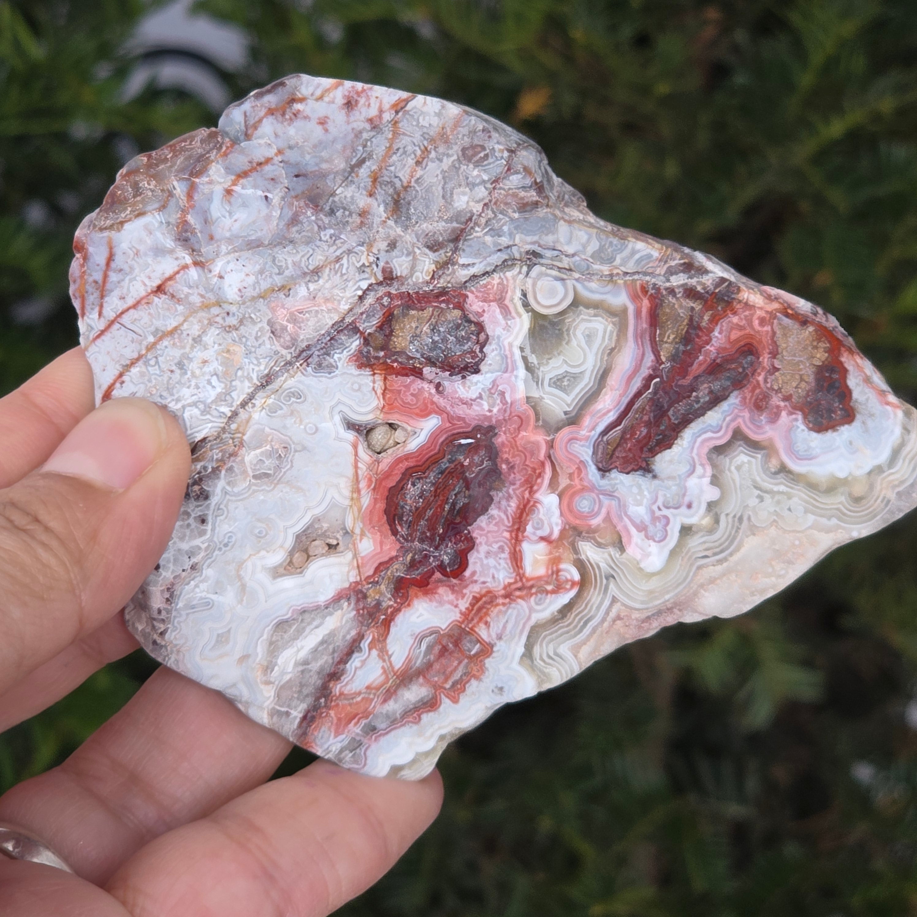 Agatul Crazy din Mexic este una dintre cele mai vibrante și spectaculoase varietăți de agat, celebru pentru liniile sale ondulate și jocurile nebunești de culori ce par desenate de o mână liberă, fără reguli. În această felie naturală, mică dar extrem de expresivă, se dezvăluie întreaga poveste a pietrei: straturi pământii, nuanțe calde de caramel, roșu aprins, portocaliu, gri și crem, amestecate în modele spiralate care par să pulseze cu viață.