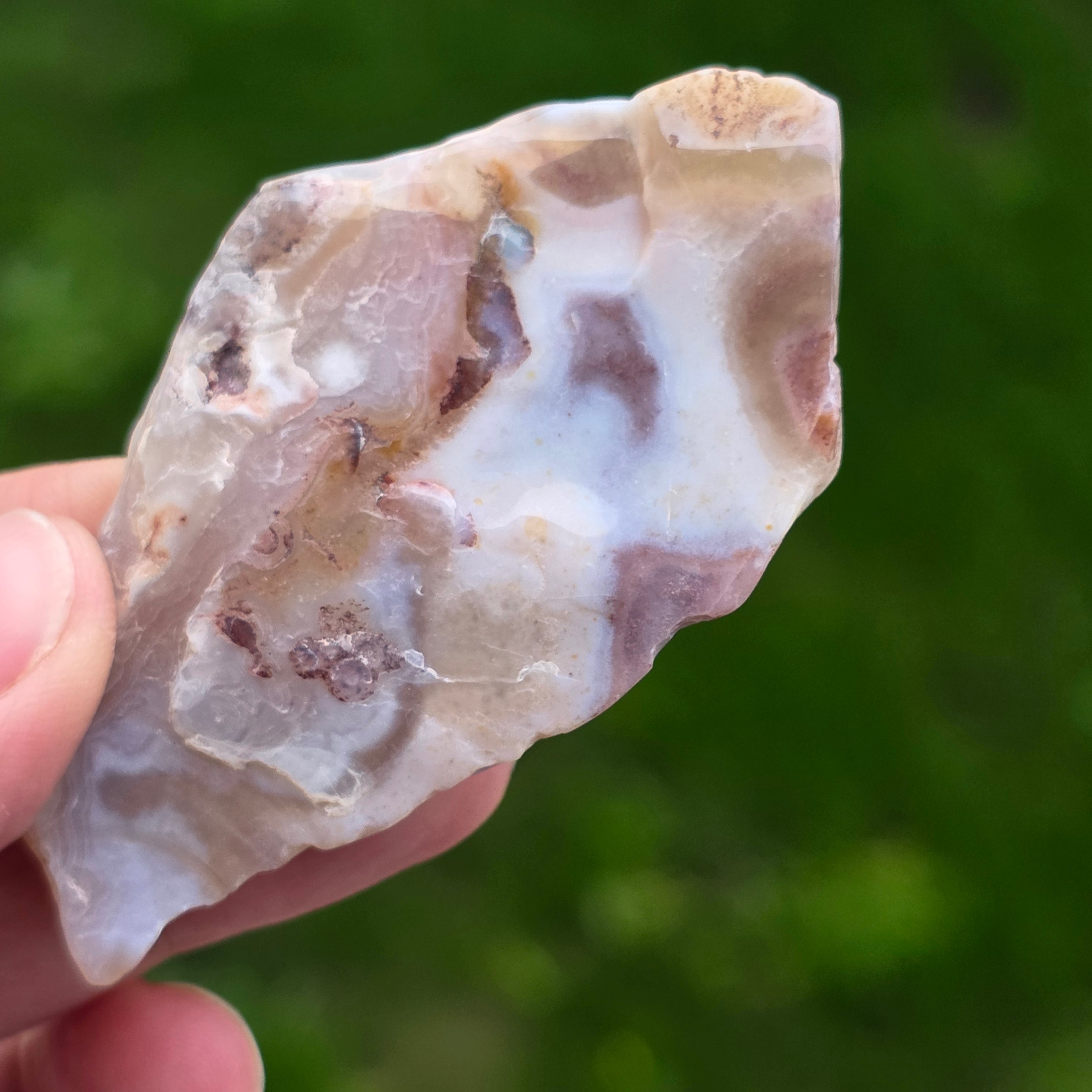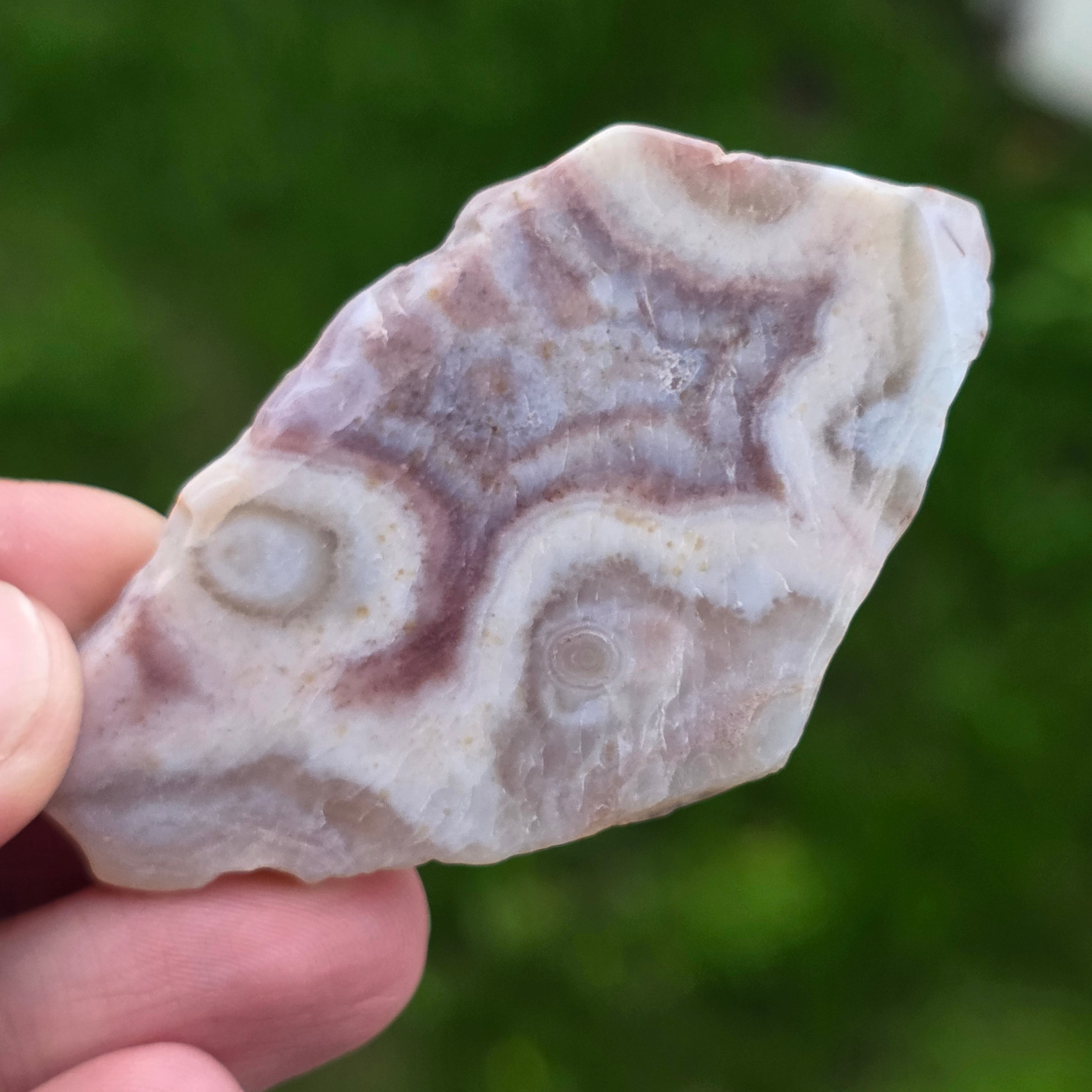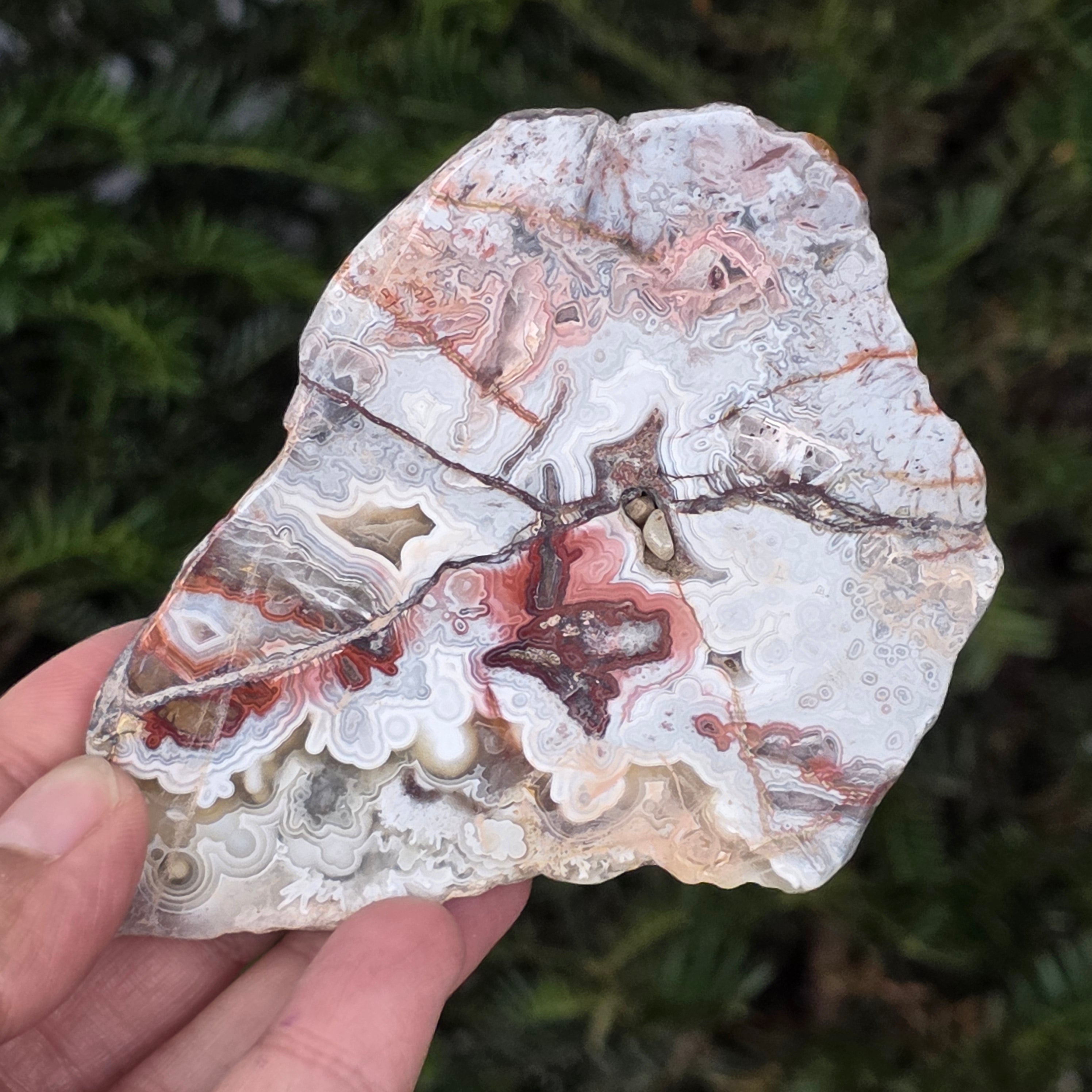 Agatul Crazy din Mexic este una dintre cele mai vibrante și spectaculoase varietăți de agat, celebru pentru liniile sale ondulate și jocurile nebunești de culori ce par desenate de o mână liberă, fără reguli. În această felie naturală, mică dar extrem de expresivă, se dezvăluie întreaga poveste a pietrei: straturi pământii, nuanțe calde de caramel, roșu aprins, portocaliu, gri și crem, amestecate în modele spiralate care par să pulseze cu viață.