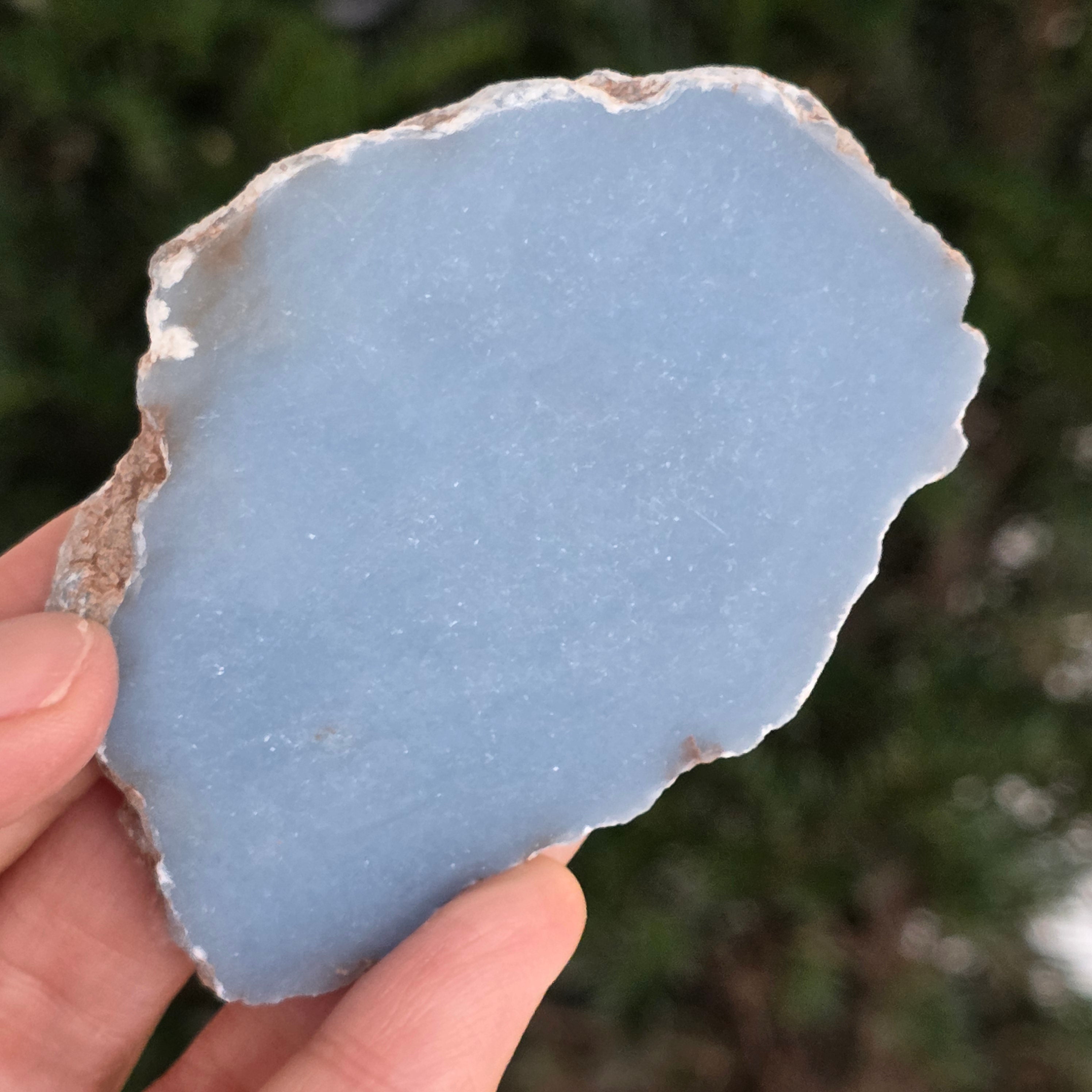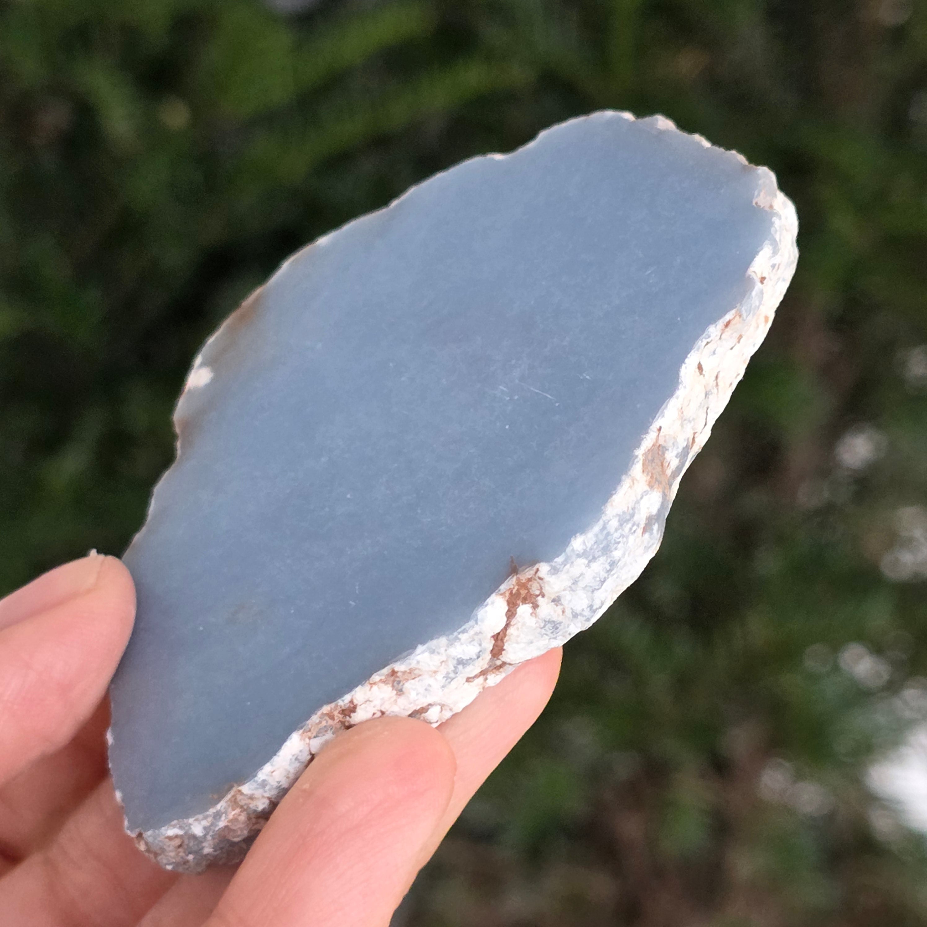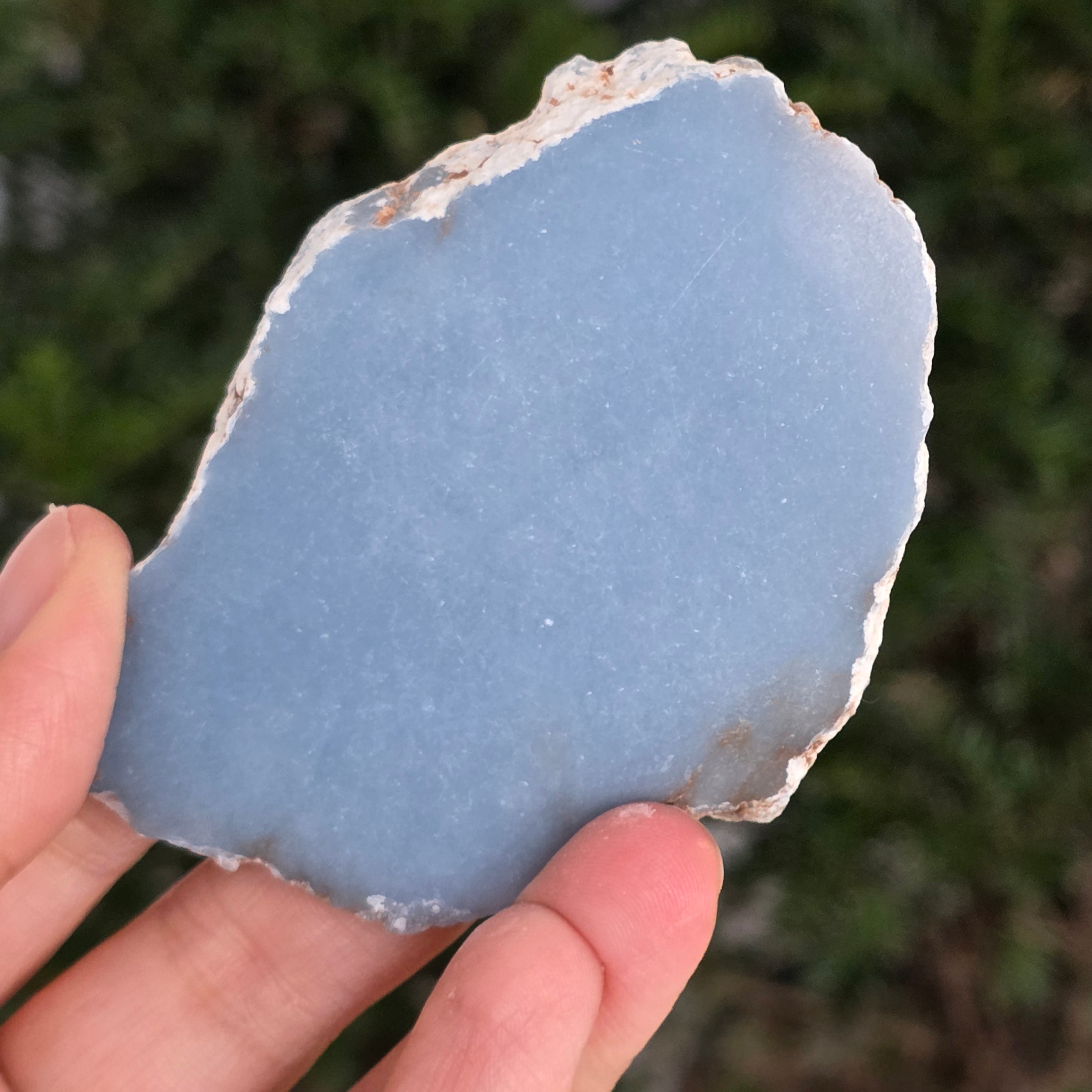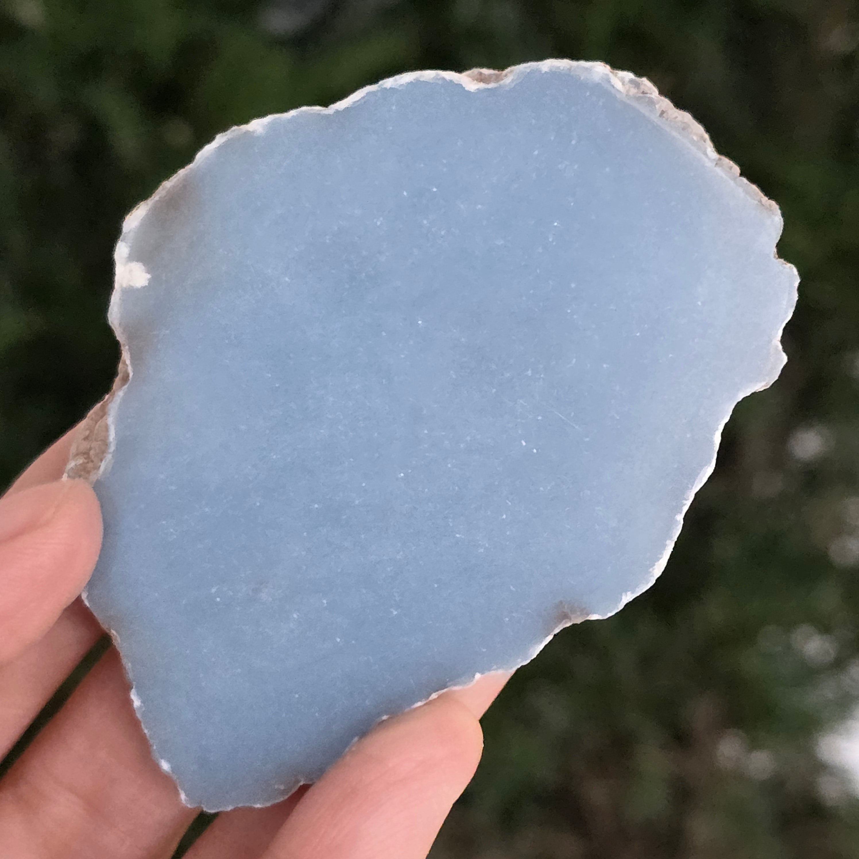 O piesă rară, ce pare desprinsă din seninul cerului. Această felie de angelit natural, dezvăluie un albastru delicat, lăptos, străbătut de nuanțe fine de gri și alb sidefat. Suprafața netedă și textura sa mată emană liniște și puritate – o bijuterie minerală a calmului și a echilibrului interior.