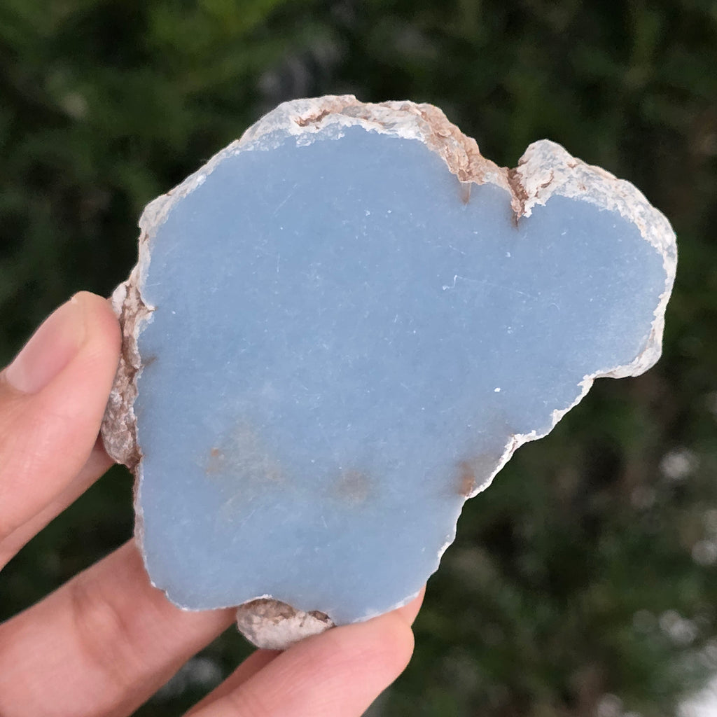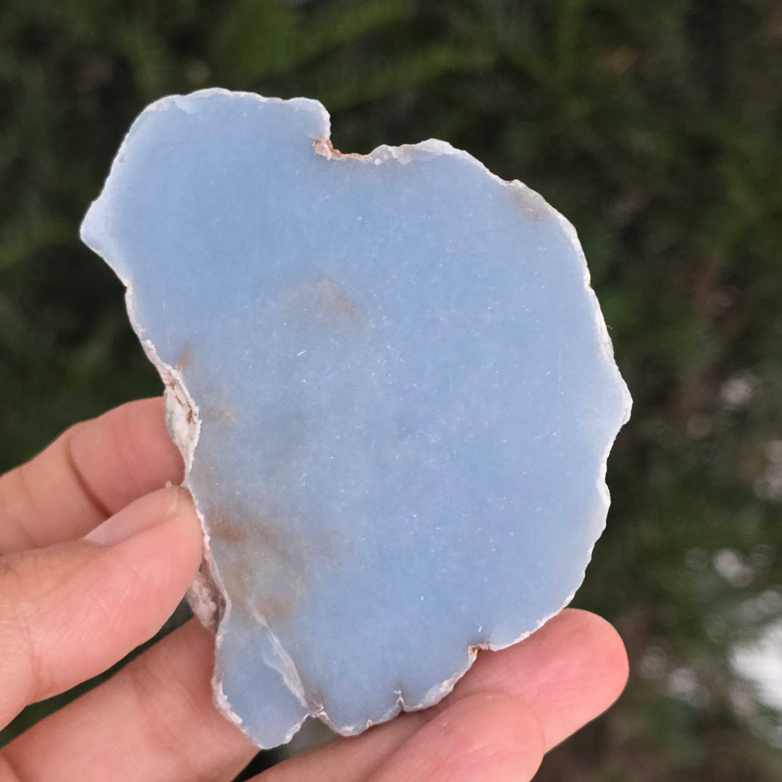 O piesă rară, ce pare desprinsă din seninul cerului. Această felie de angelit natural, dezvăluie un albastru delicat, lăptos, străbătut de nuanțe fine de gri și alb sidefat. Suprafața netedă și textura sa mată emană liniște și puritate – o bijuterie minerală a calmului și a echilibrului interior.