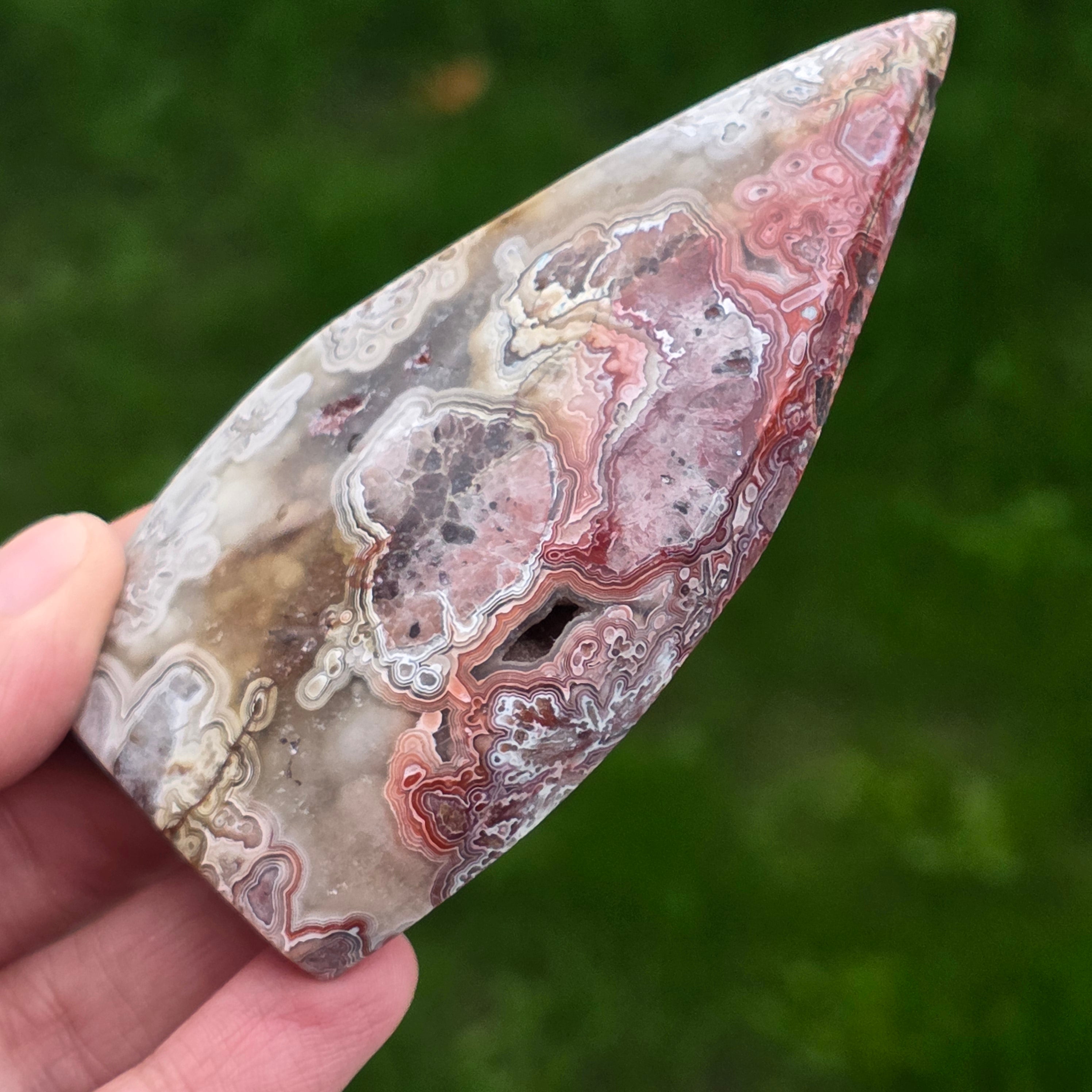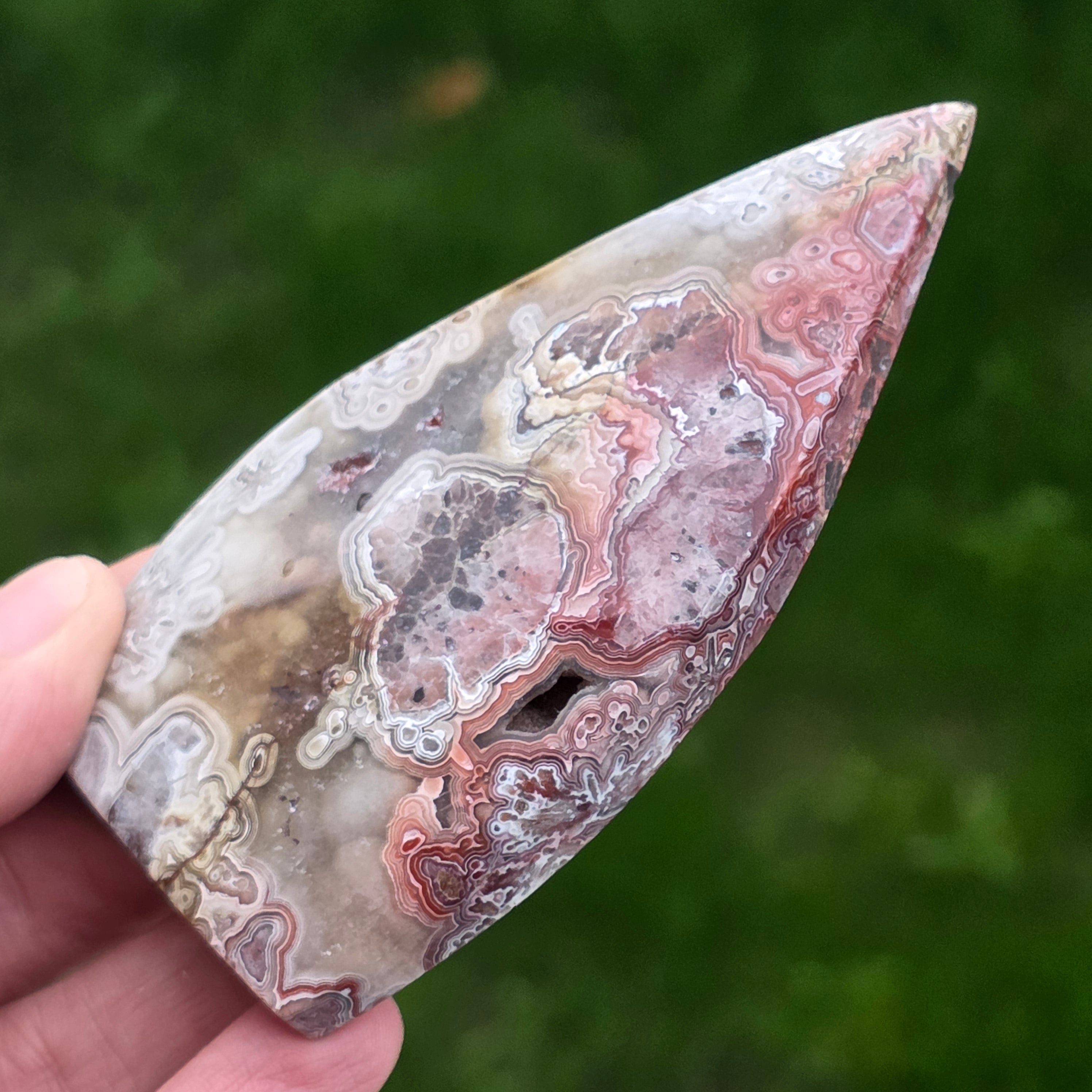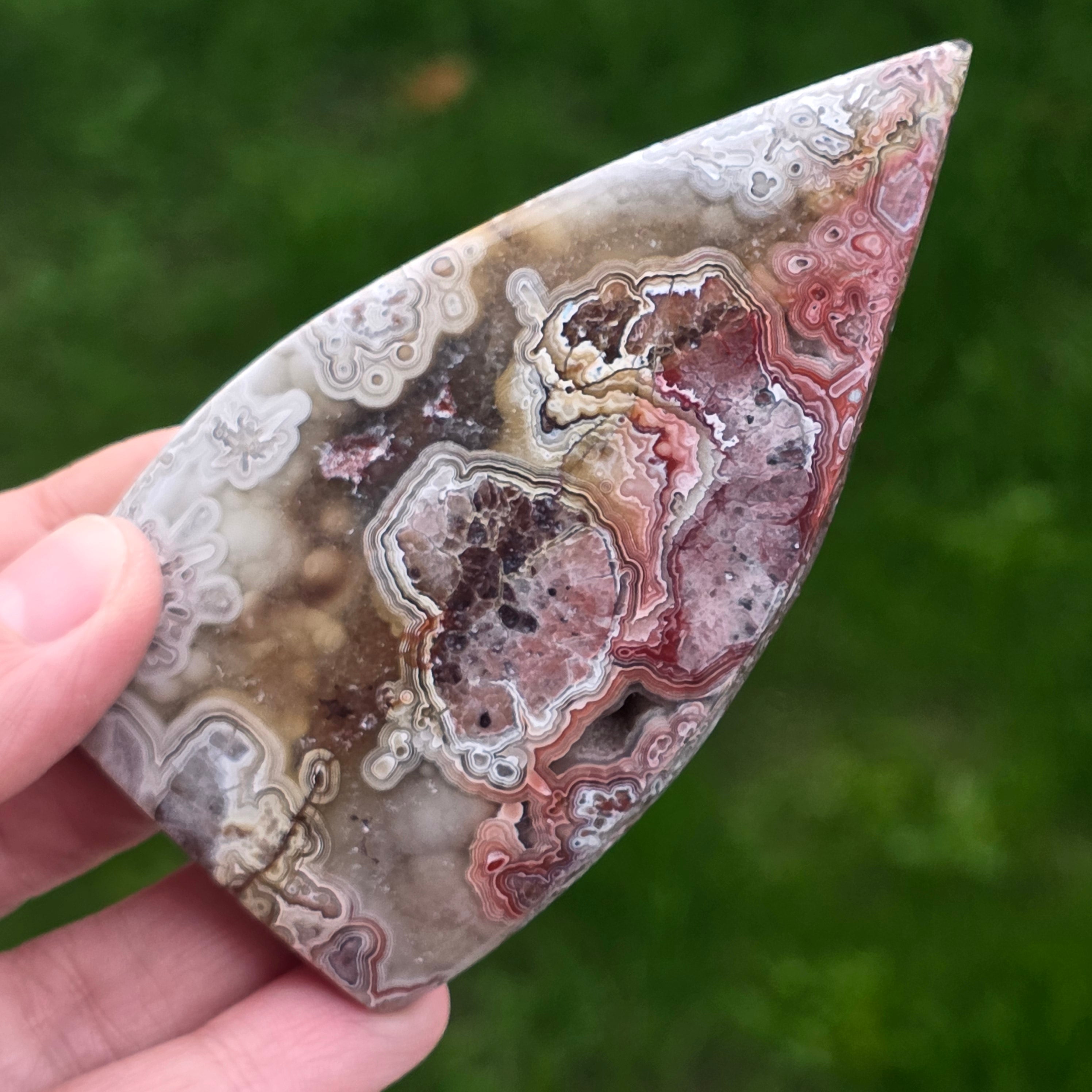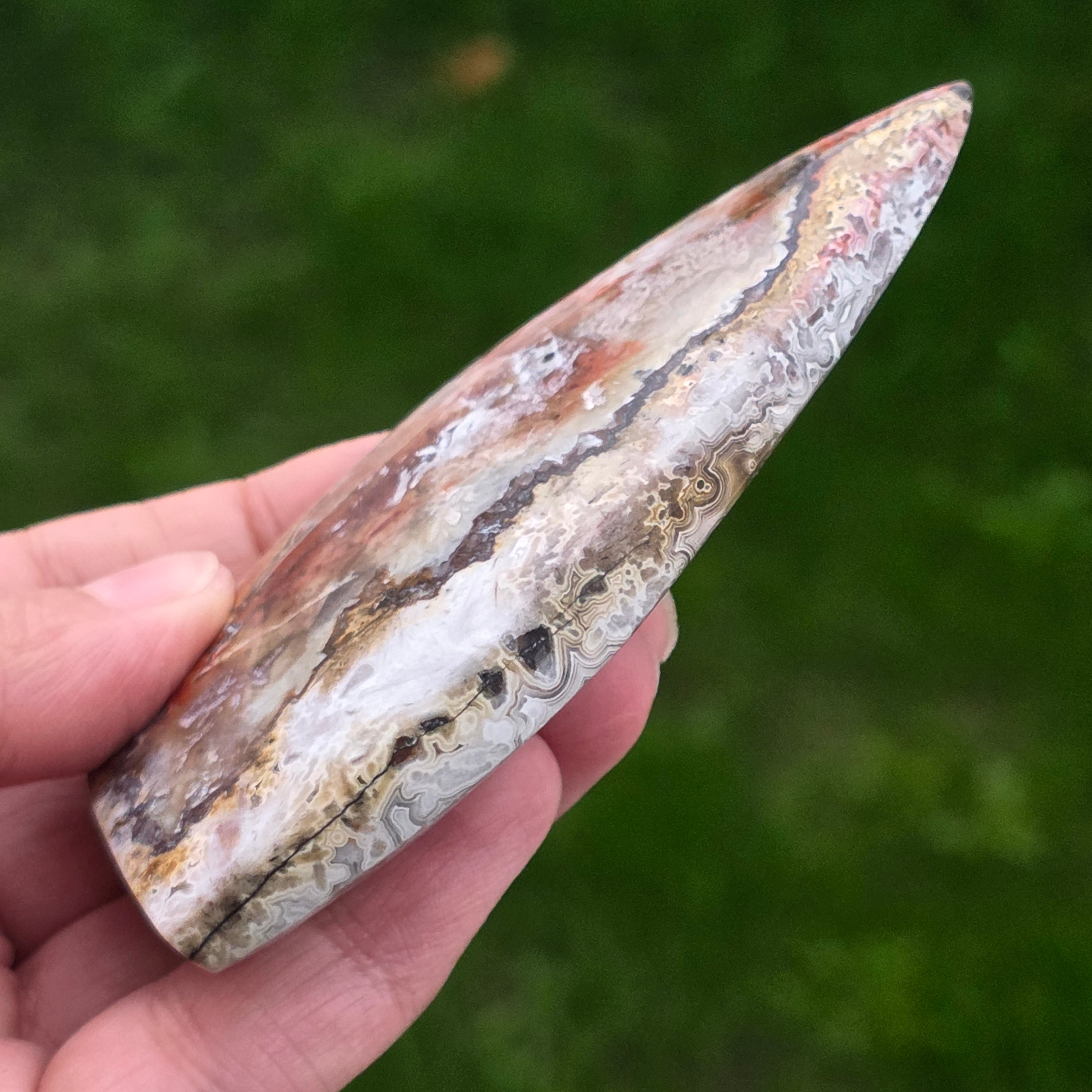 Agatul Crazy din Mexic este una dintre cele mai vibrante și spectaculoase varietăți de agat, celebru pentru liniile sale ondulate și jocurile nebunești de culori ce par desenate de o mână liberă, fără reguli. În această felie naturală, mică dar extrem de expresivă, se dezvăluie întreaga poveste a pietrei: straturi pământii, nuanțe calde de caramel, roșu aprins, portocaliu, gri și crem, amestecate în modele spiralate care par să pulseze cu viață.