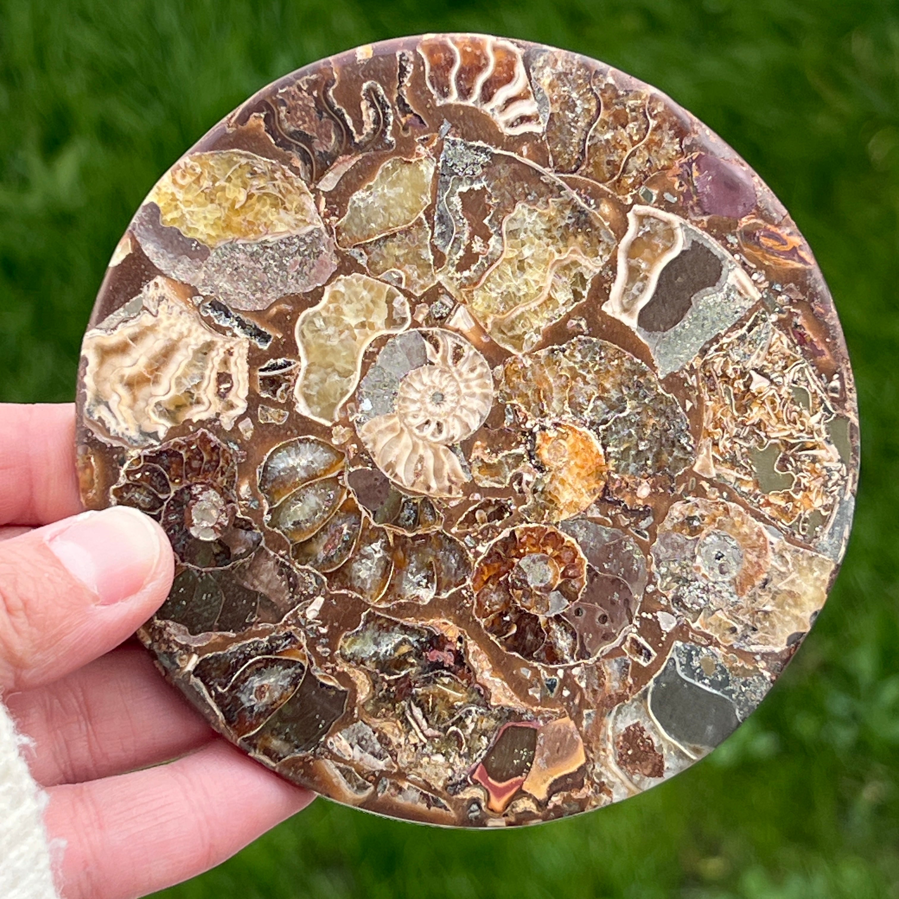 Cristalele fosile de amonit sunt confecționate din fosile autentice de amonit. Aceste fosile pot avea diferite dimensiuni și ornamente, în funcție de specie și perioada geologică în care au trăit.