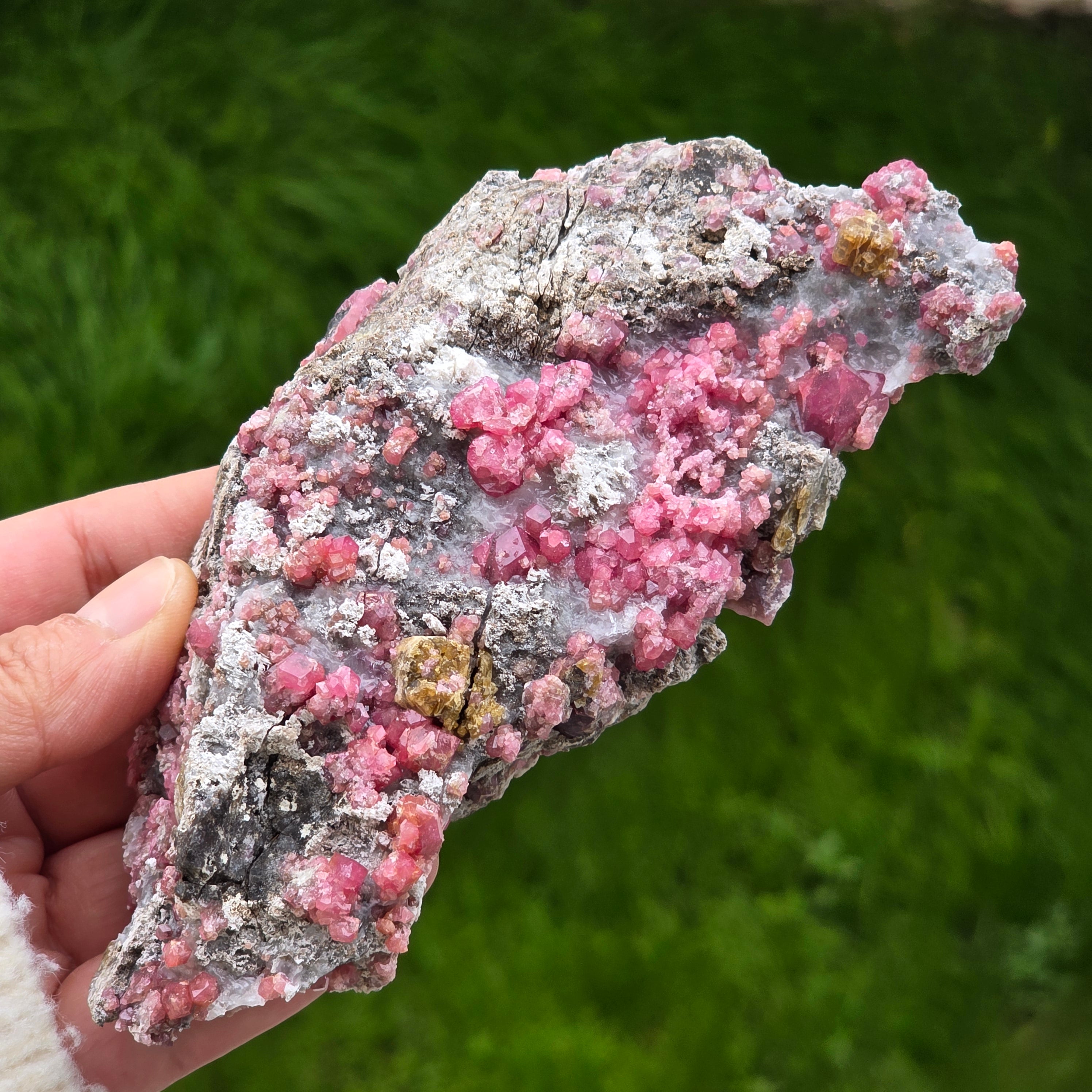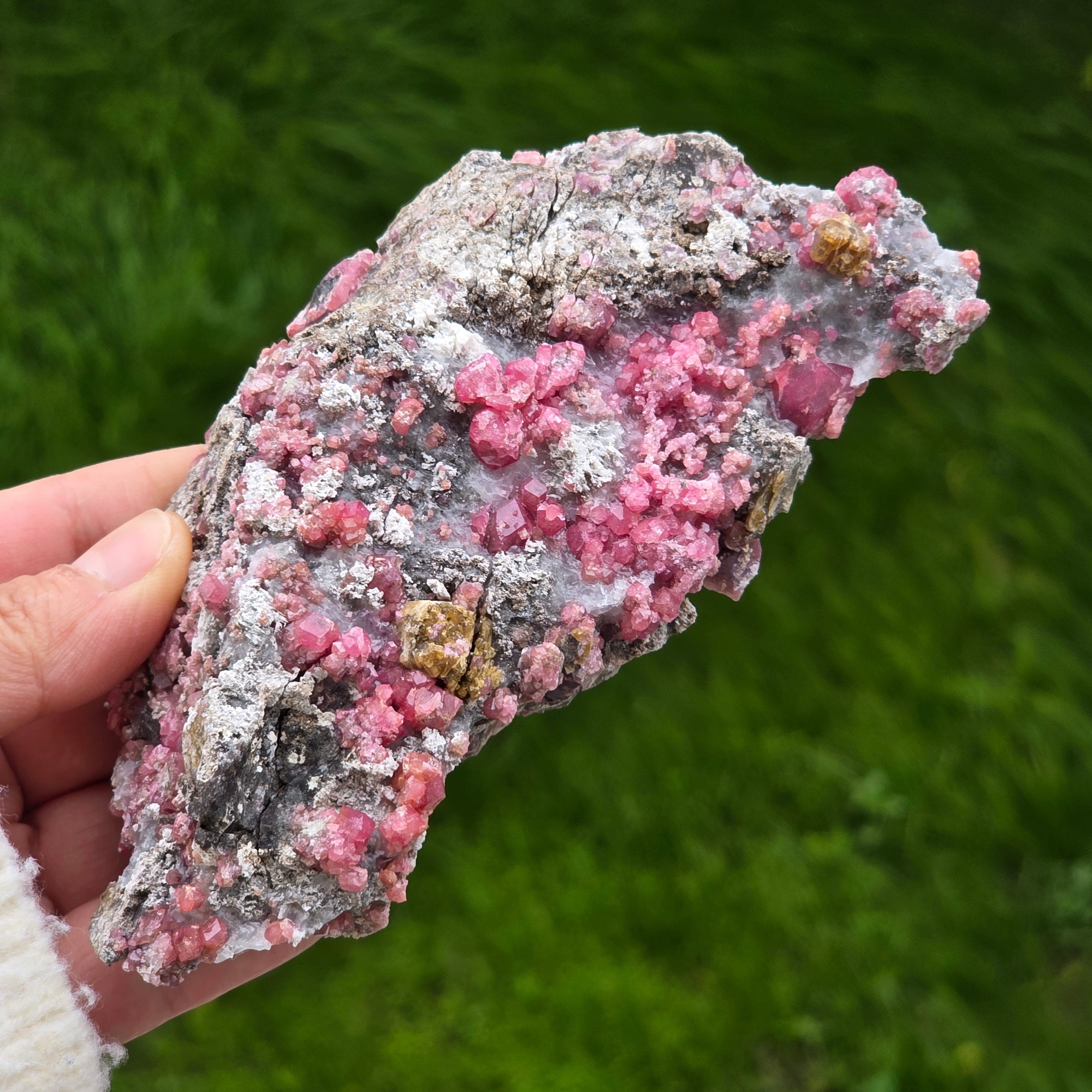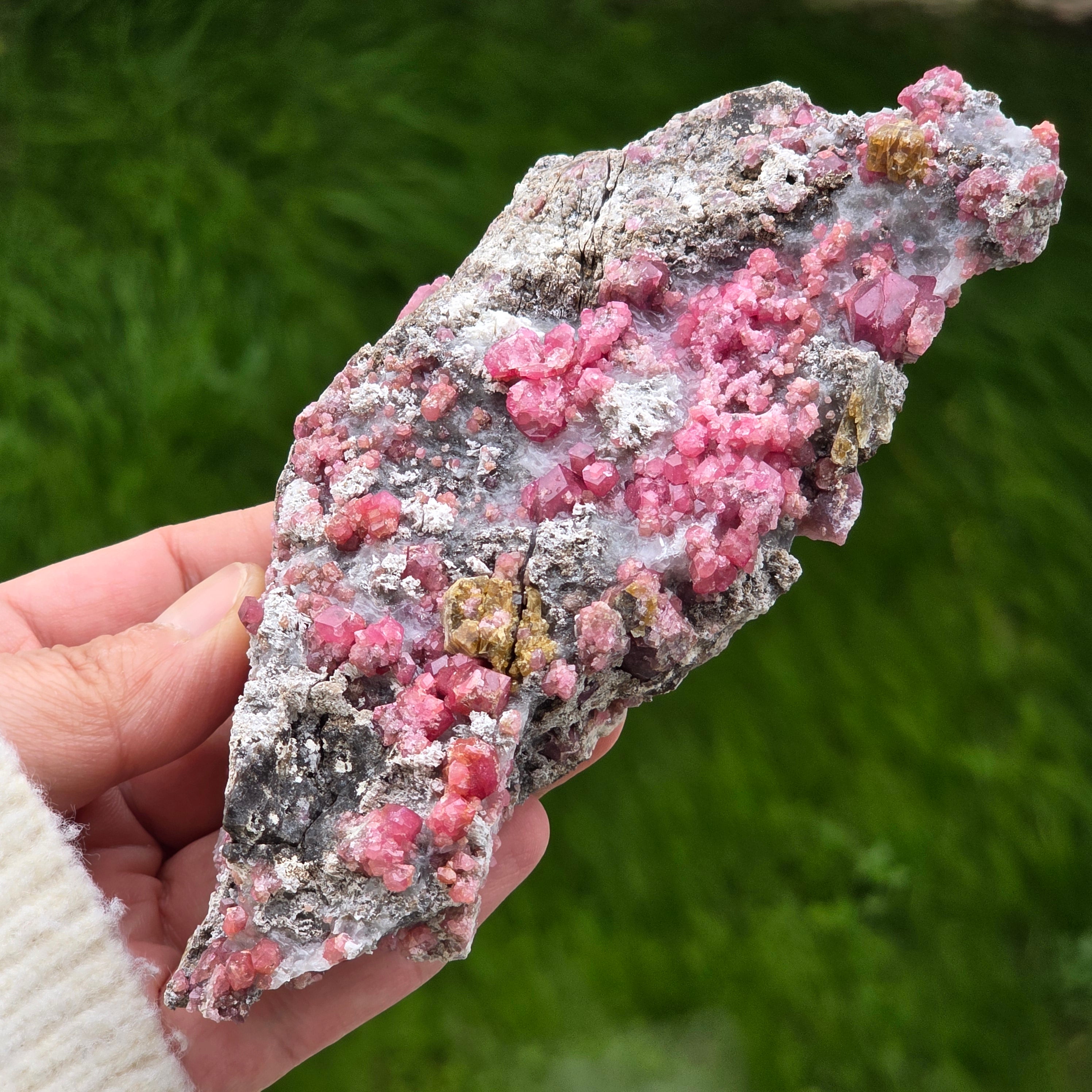 Cristalele de granat roz sunt vizibile direct în matrice, cu forme naturale bine definite, crescute organic în structura rocii. Contrastul dintre nuanțele calde ale granatului și textura brută a matricei oferă specimenului un aspect echilibrat și autentic, specific pieselor destinate colecției. Prezența matricei păstrează contextul de formare al mineralului, sporind atât valoarea estetică, cât și cea mineralogică.