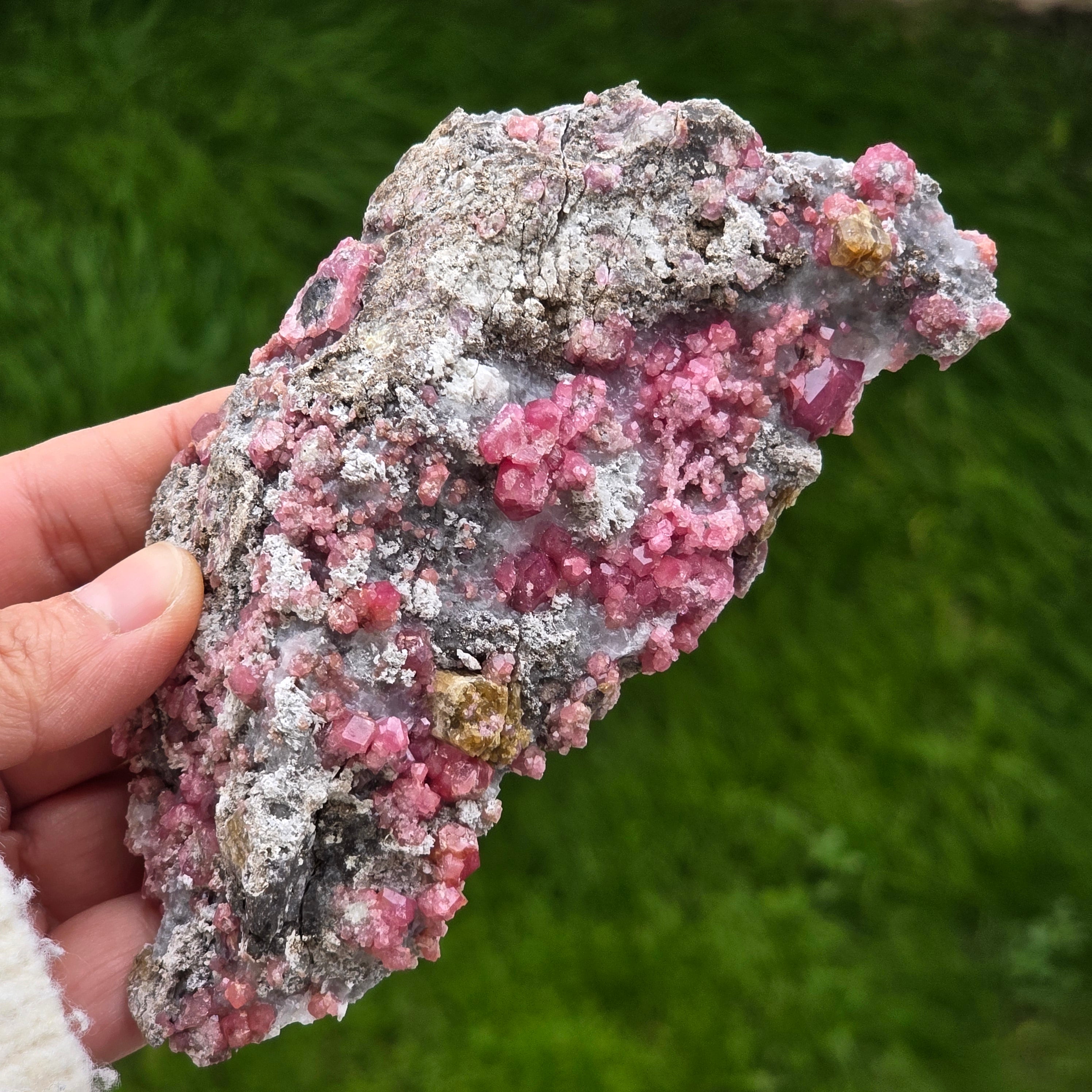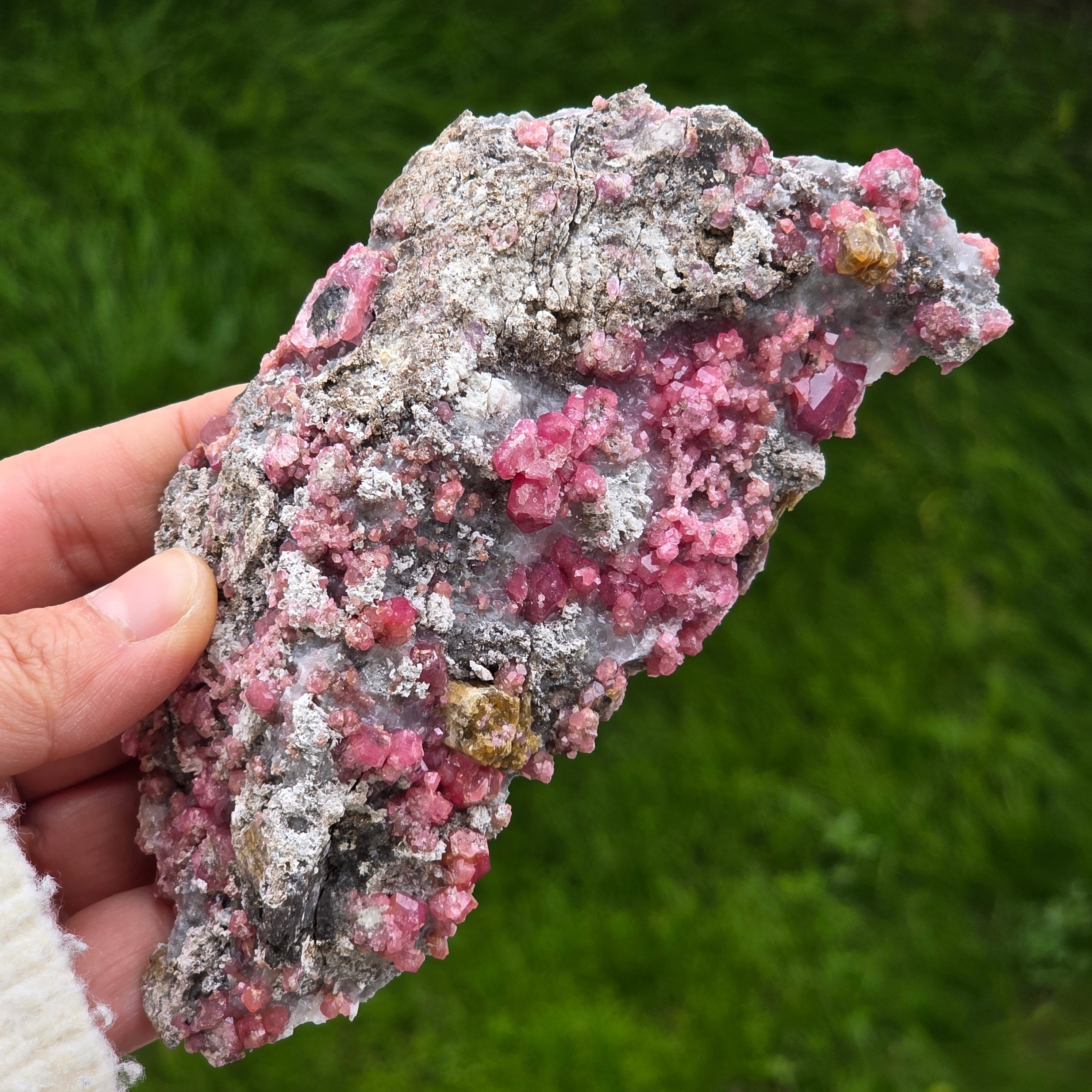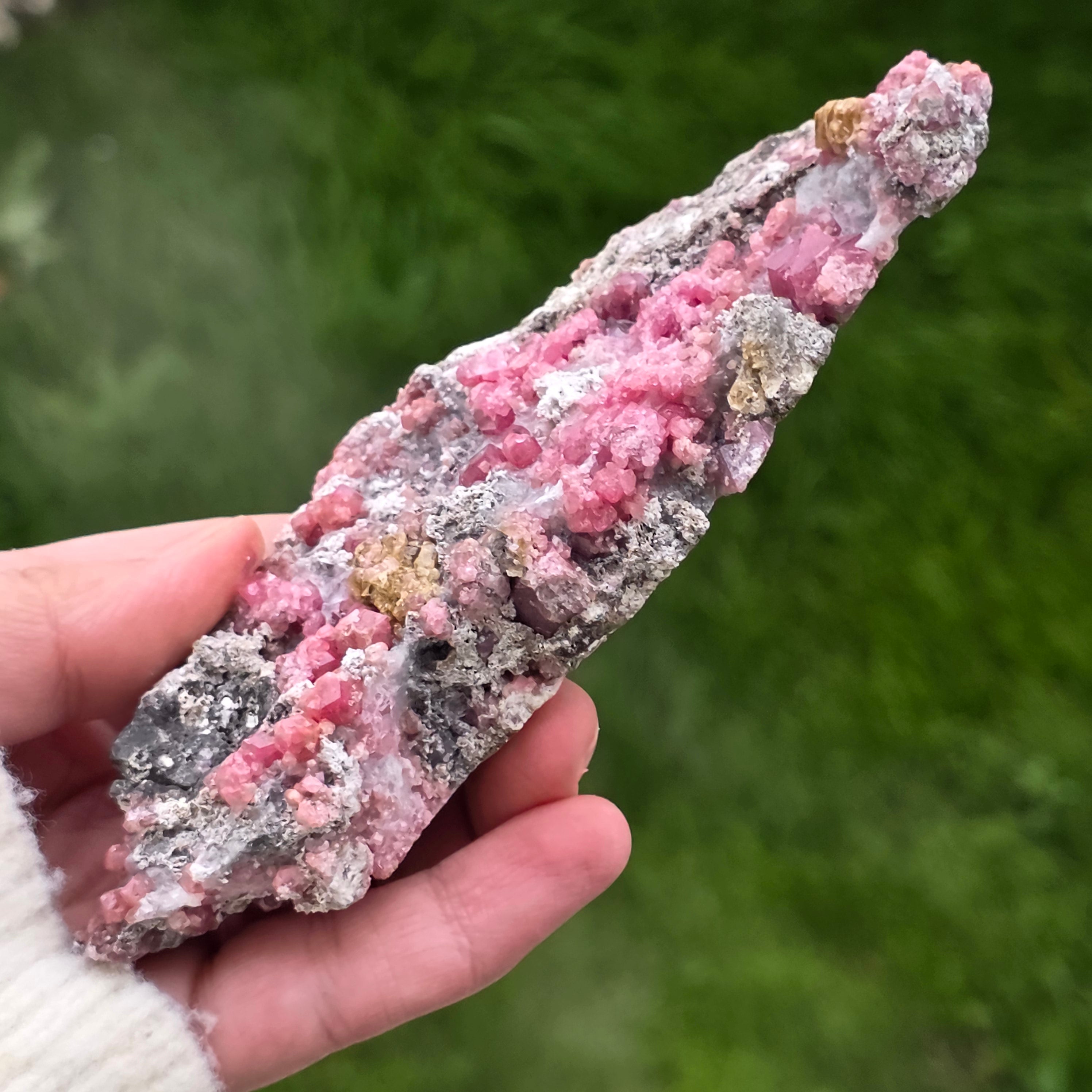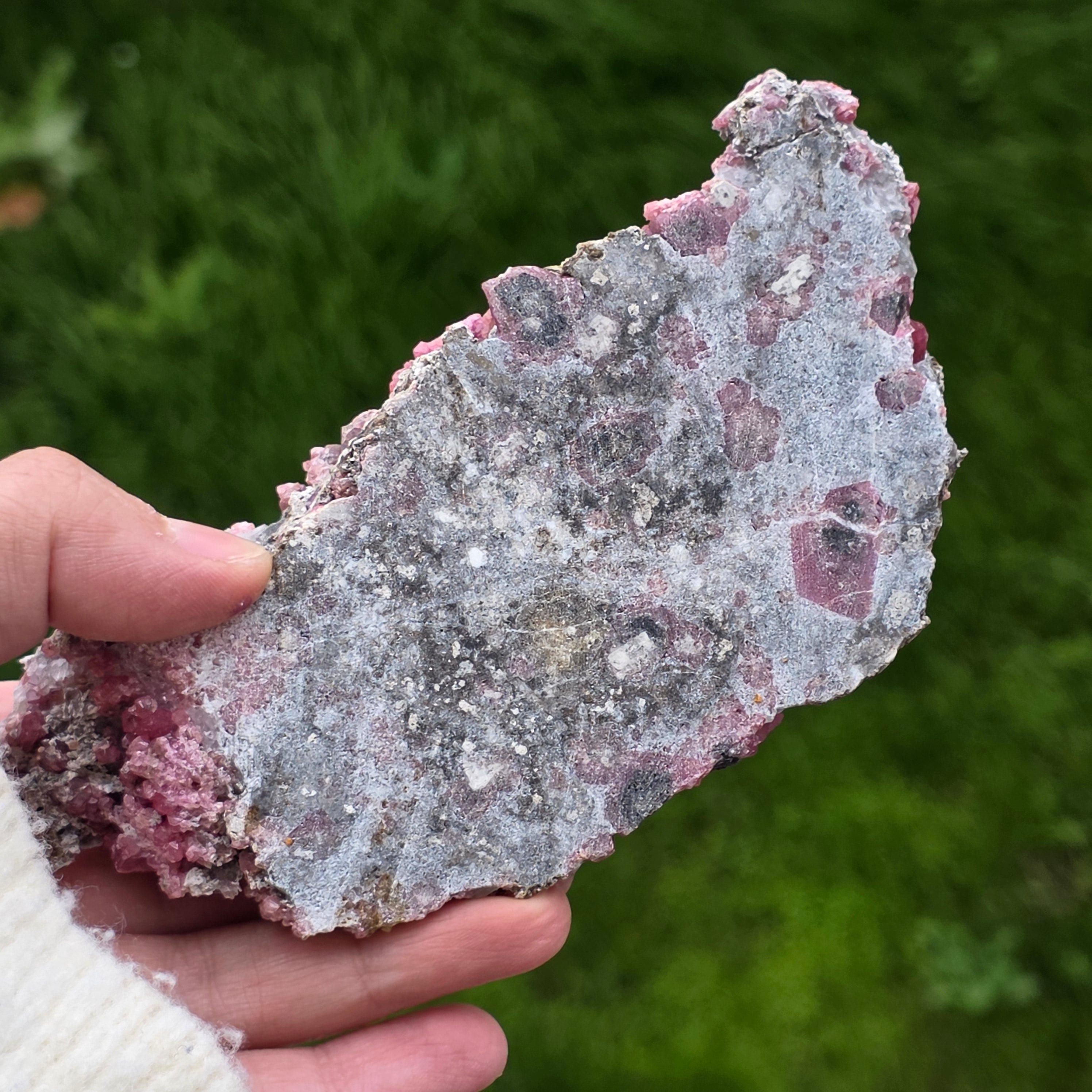 Cristalele de granat roz sunt vizibile direct în matrice, cu forme naturale bine definite, crescute organic în structura rocii. Contrastul dintre nuanțele calde ale granatului și textura brută a matricei oferă specimenului un aspect echilibrat și autentic, specific pieselor destinate colecției. Prezența matricei păstrează contextul de formare al mineralului, sporind atât valoarea estetică, cât și cea mineralogică.