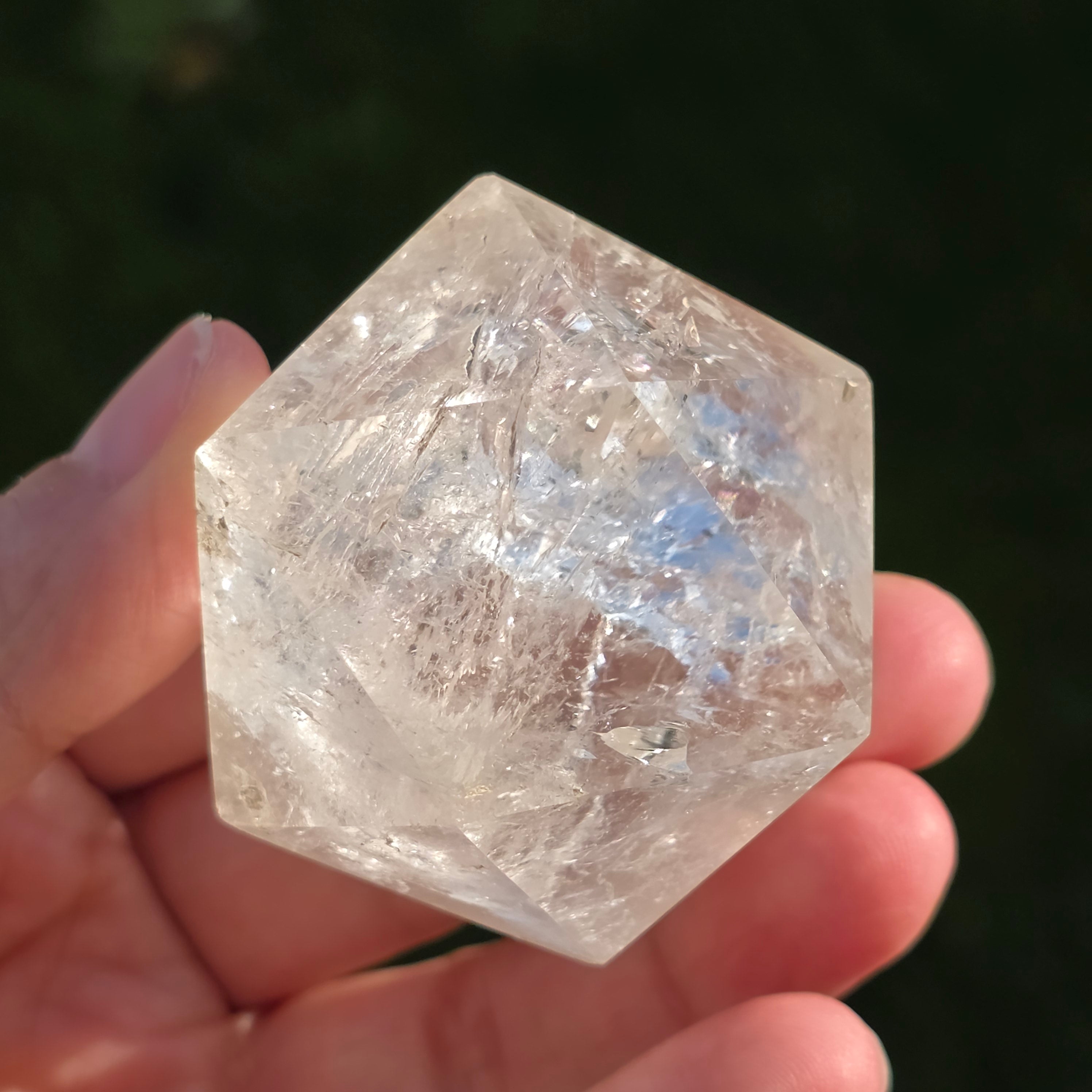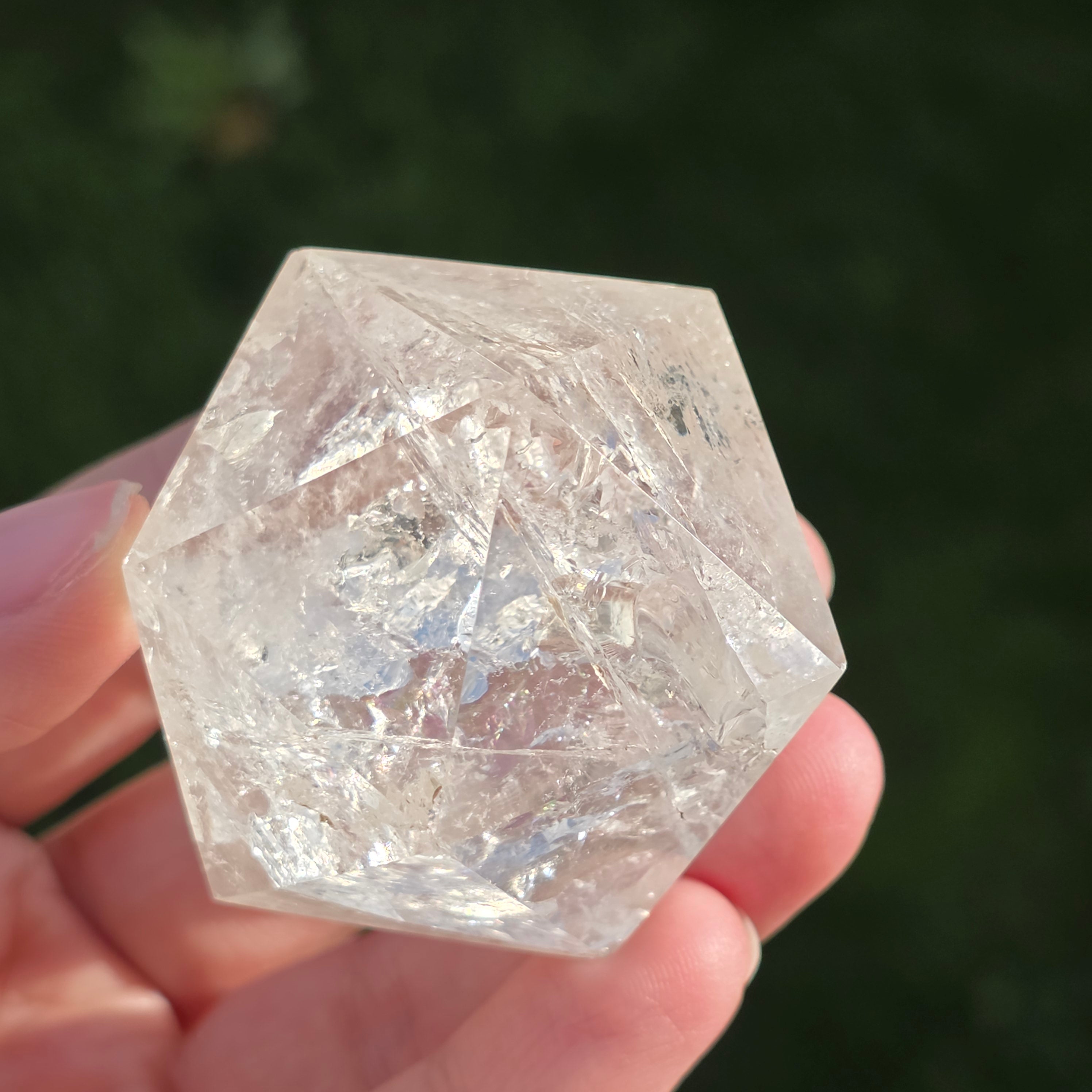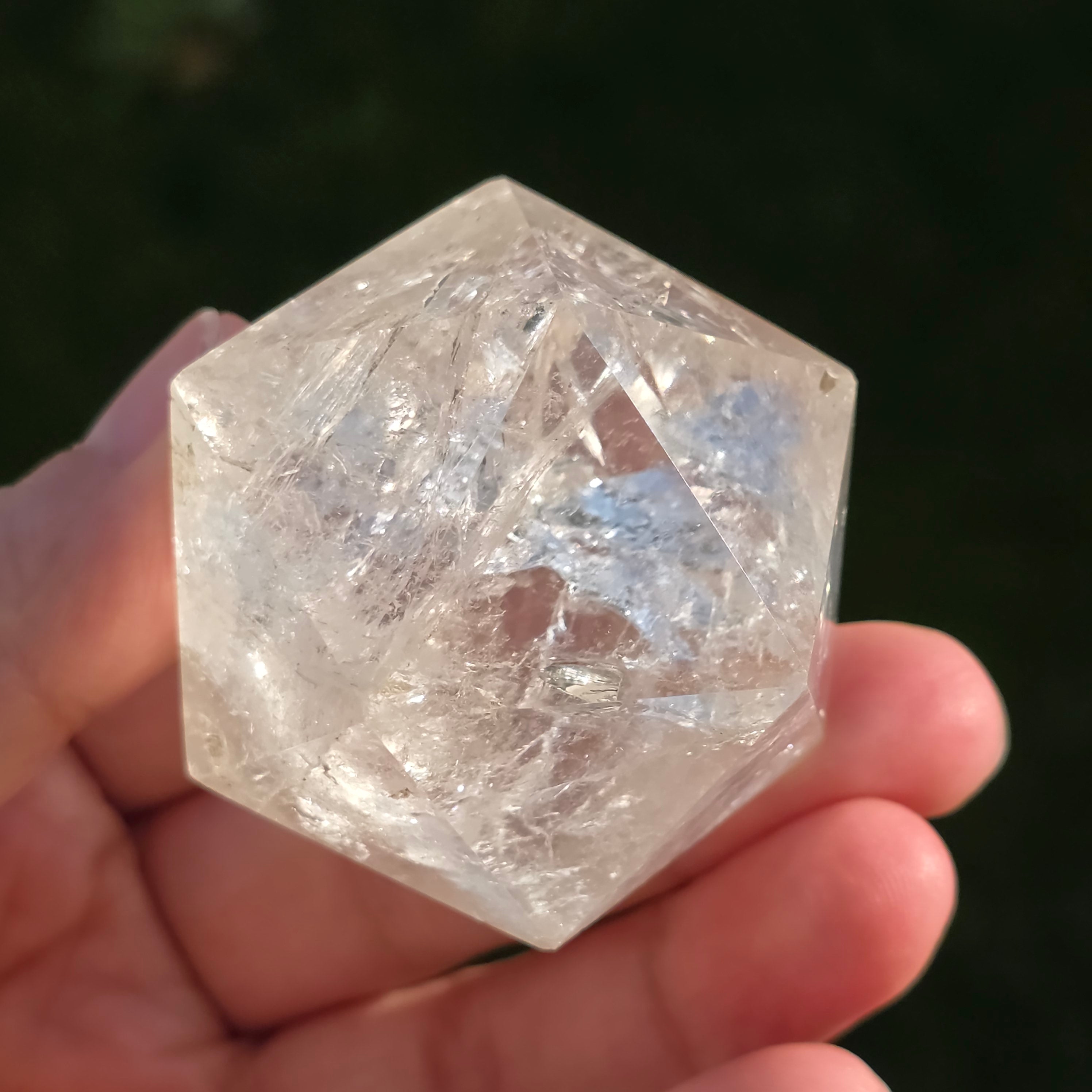 Icosaedru din cuarț incolor (cristal de stâncă), șlefuit manual cu precizie în formă de corp platonician cu 20 de fețe triunghiulare echilaterale.