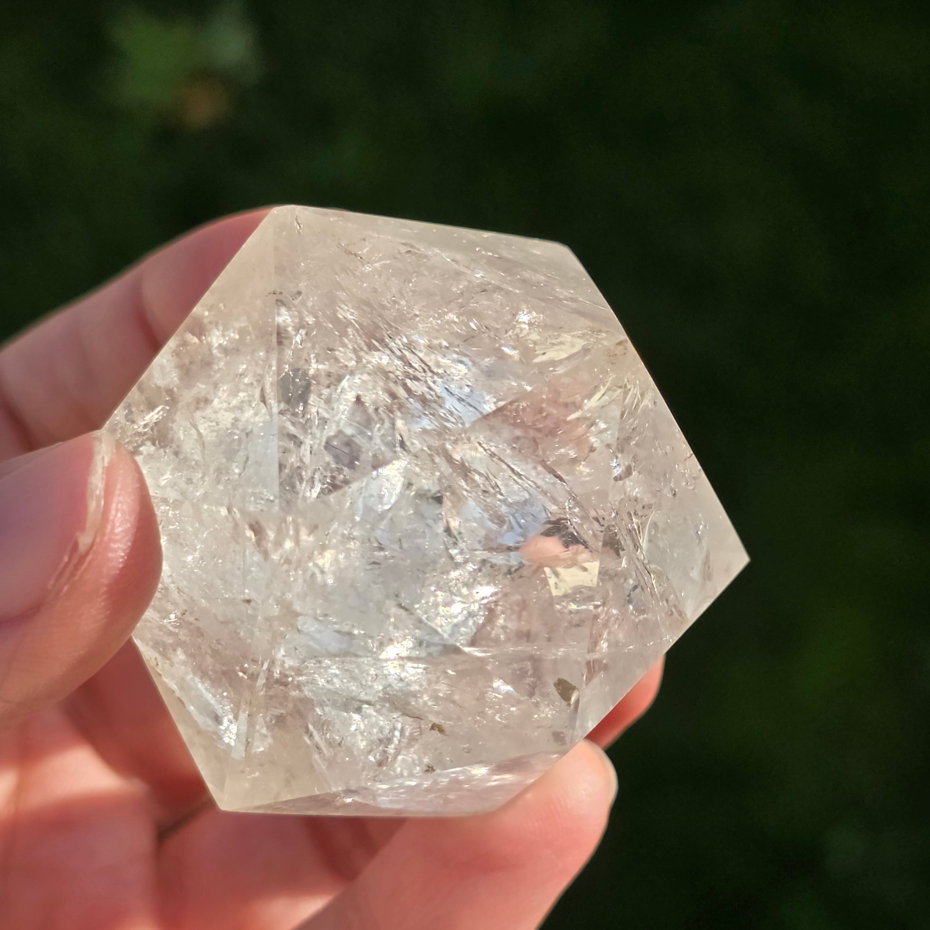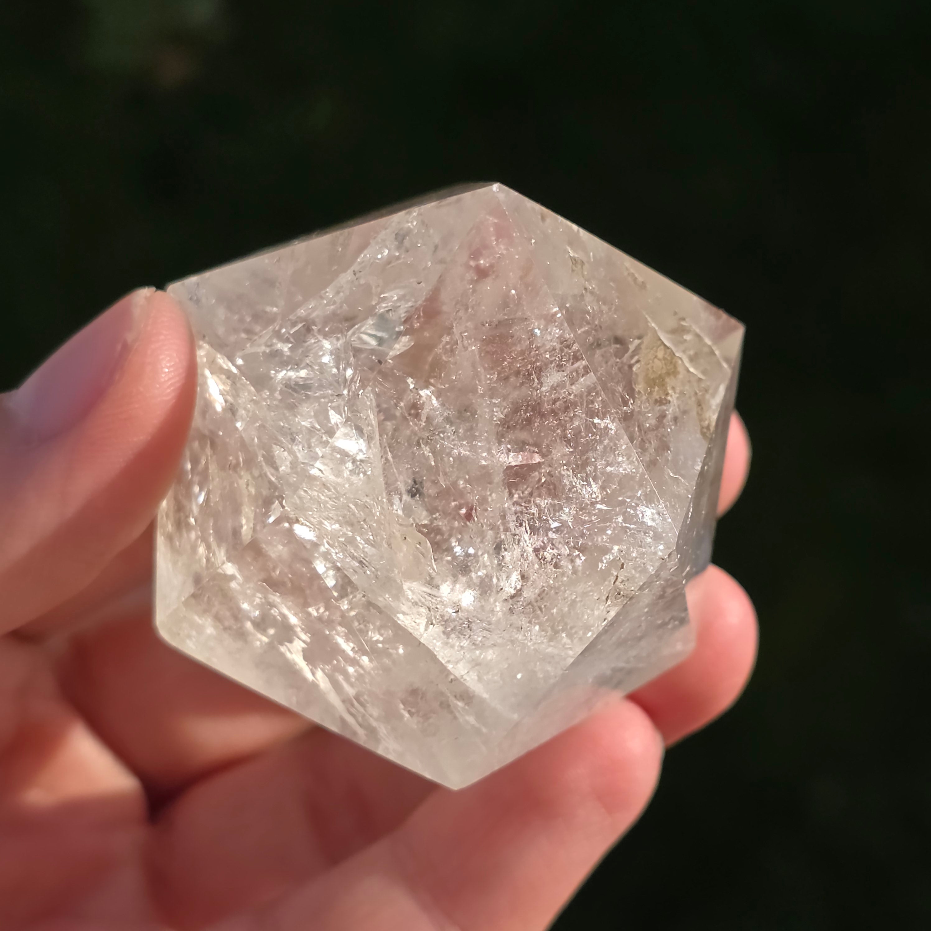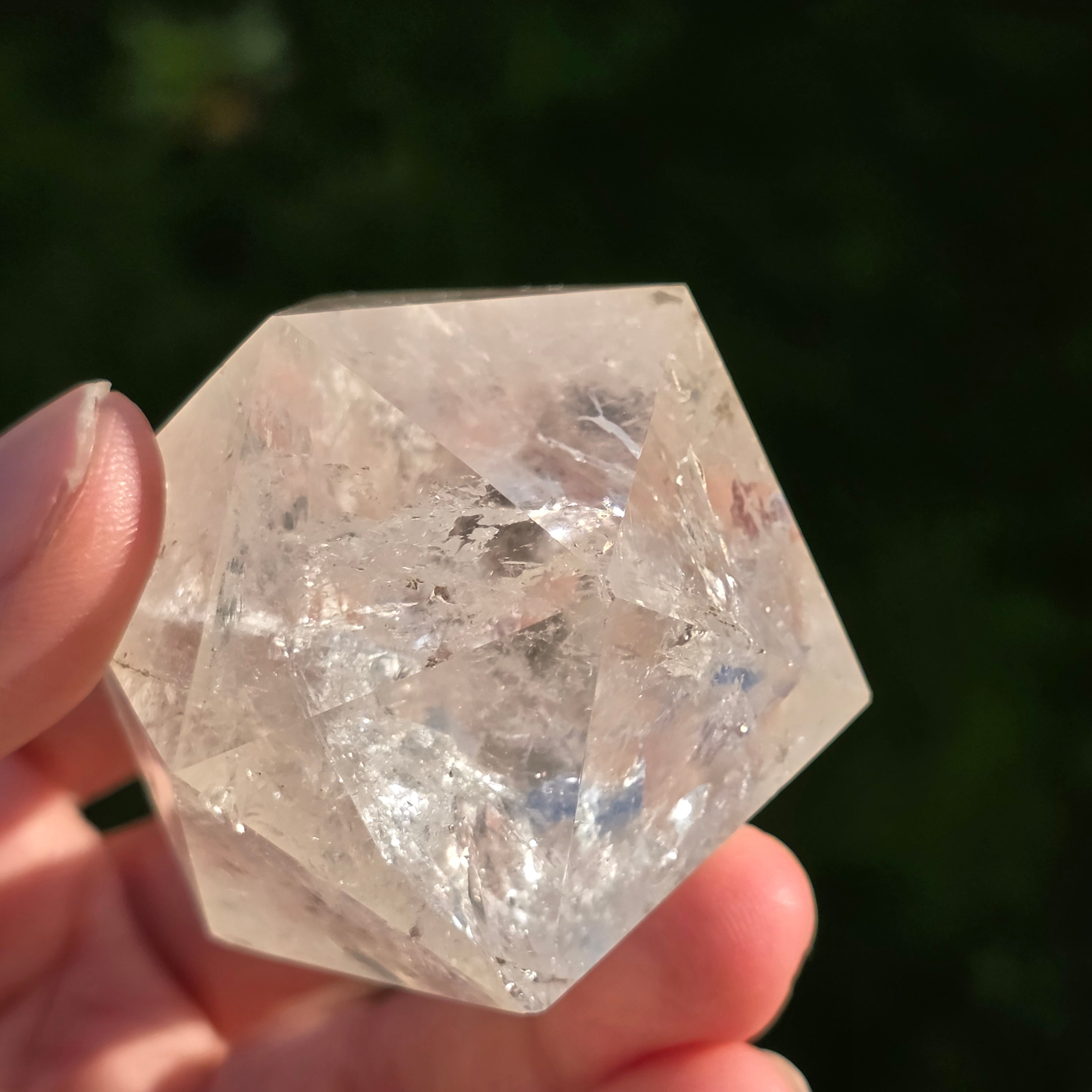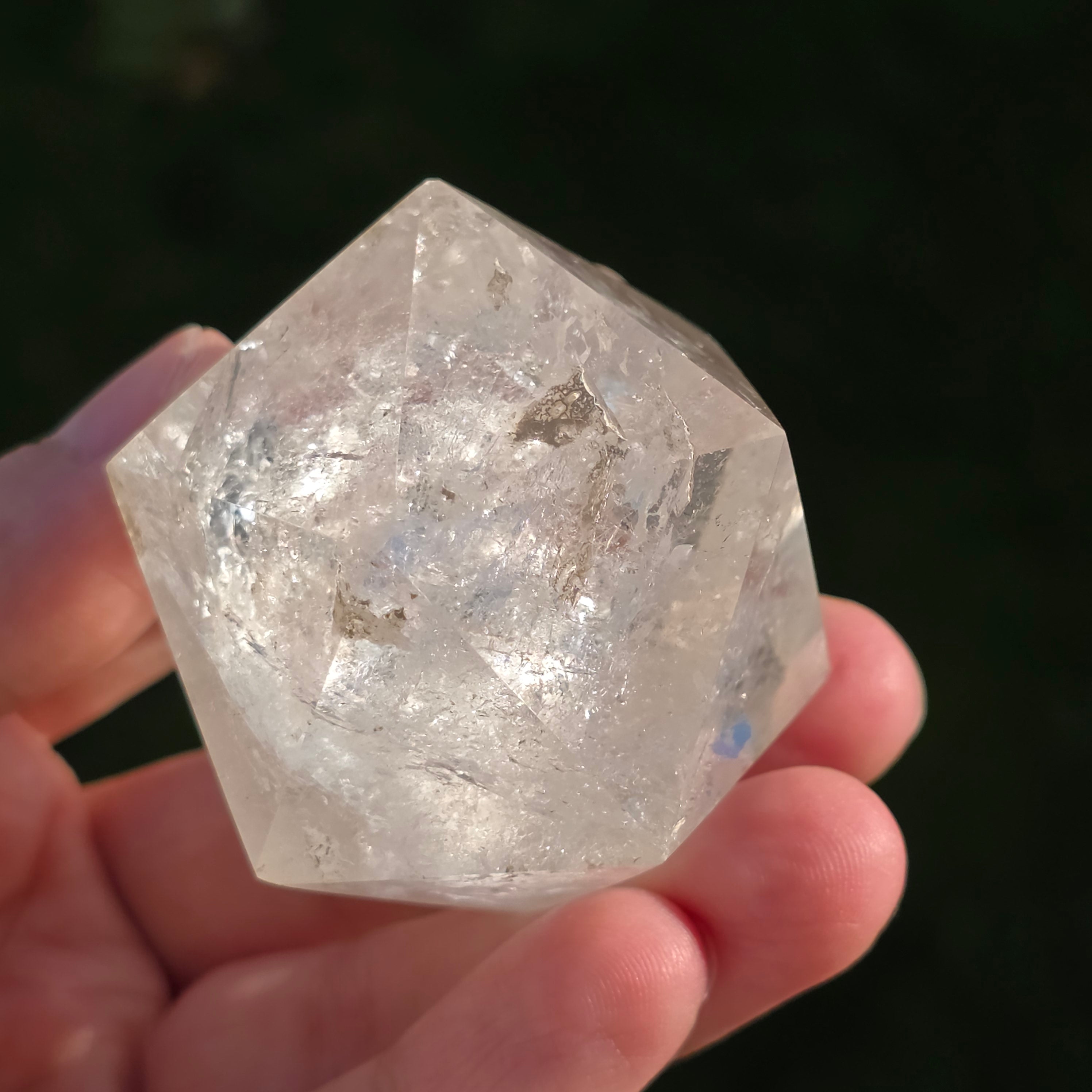 Icosaedru din cuarț incolor (cristal de stâncă), șlefuit manual cu precizie în formă de corp platonician cu 20 de fețe triunghiulare echilaterale.