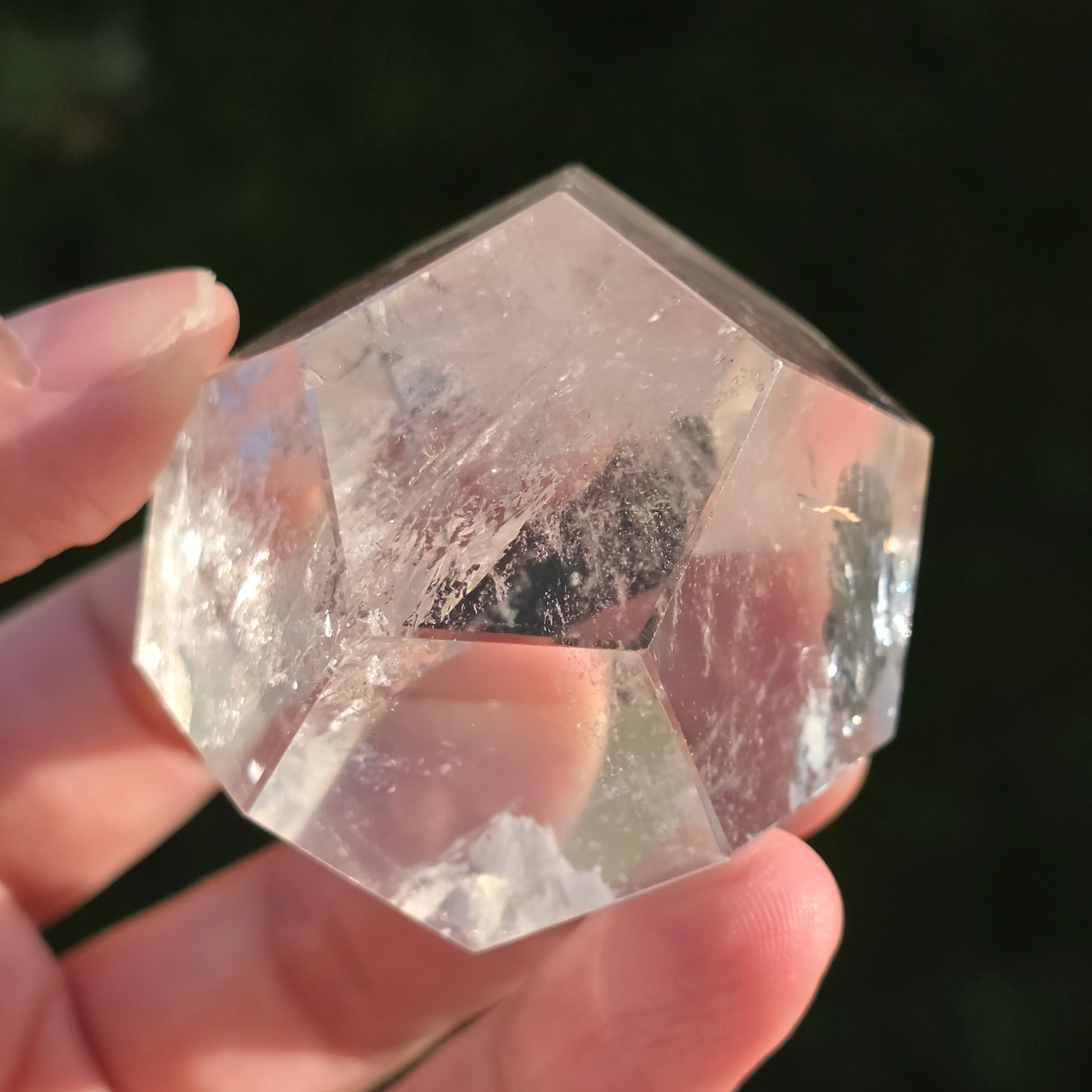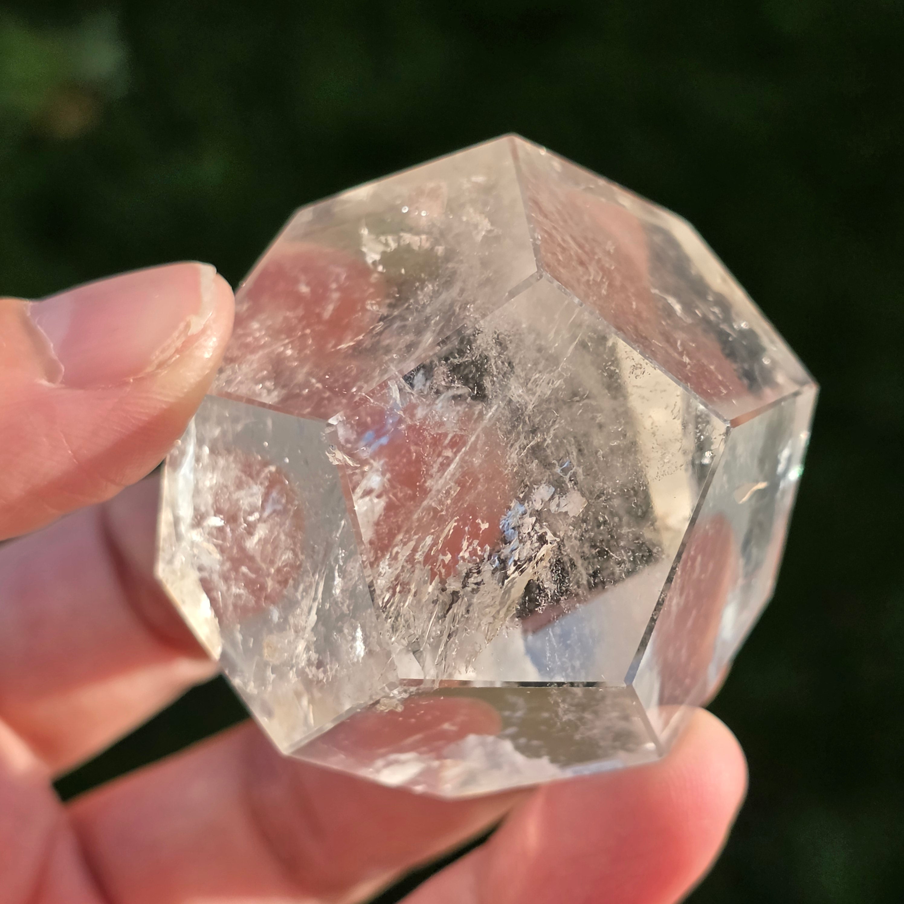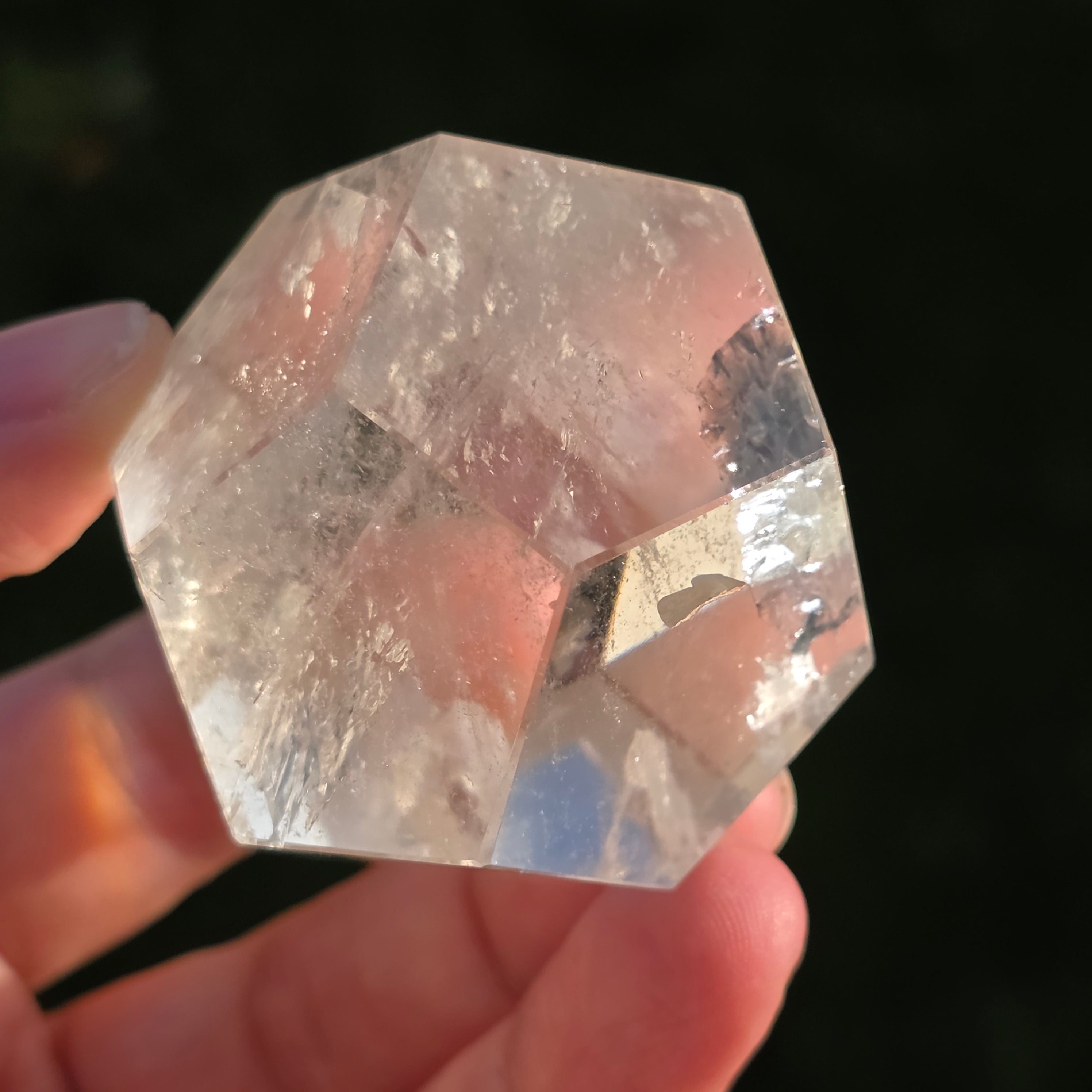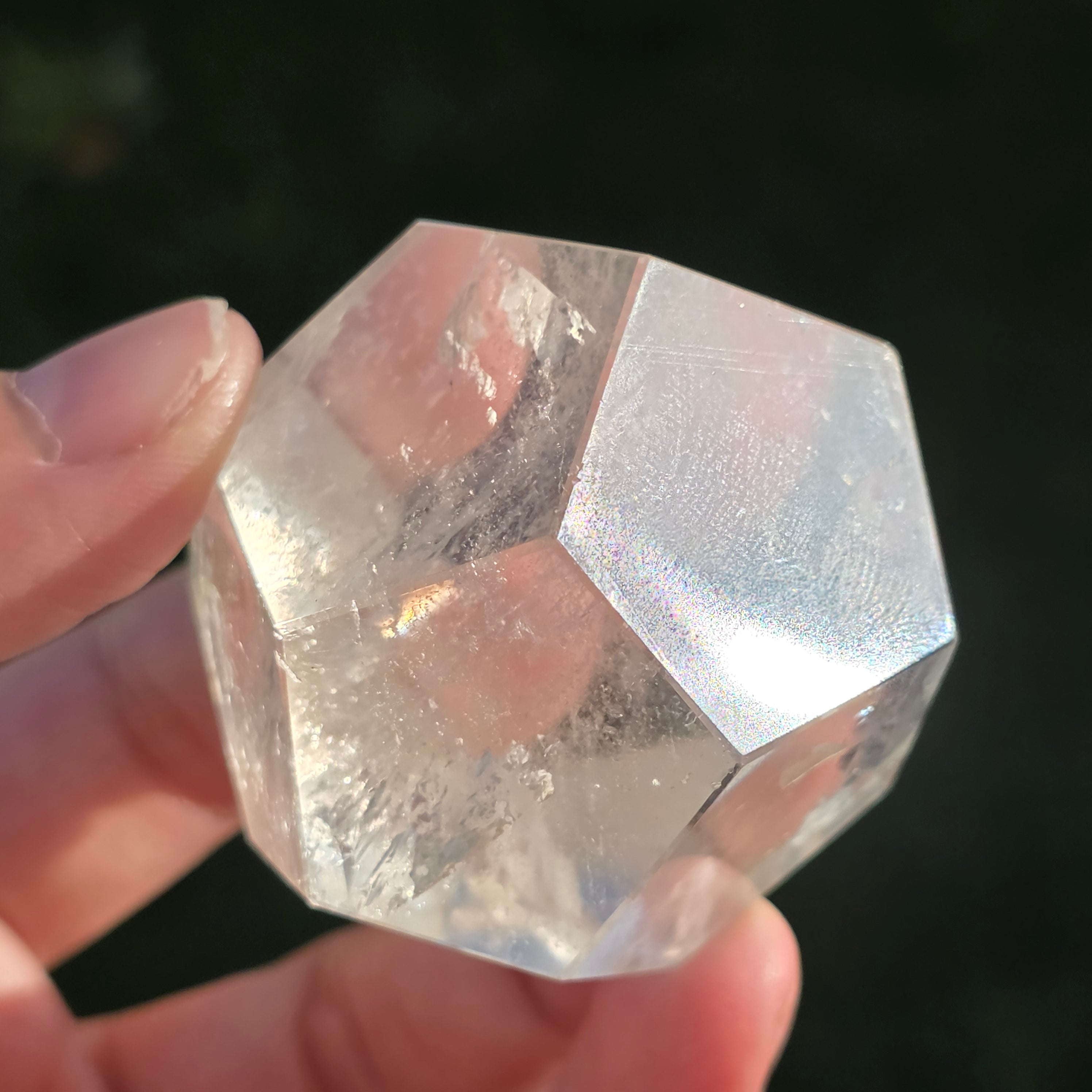 Icosaedru din cuarț incolor (cristal de stâncă), șlefuit manual cu precizie în formă de corp platonician cu 20 de fețe triunghiulare echilaterale.