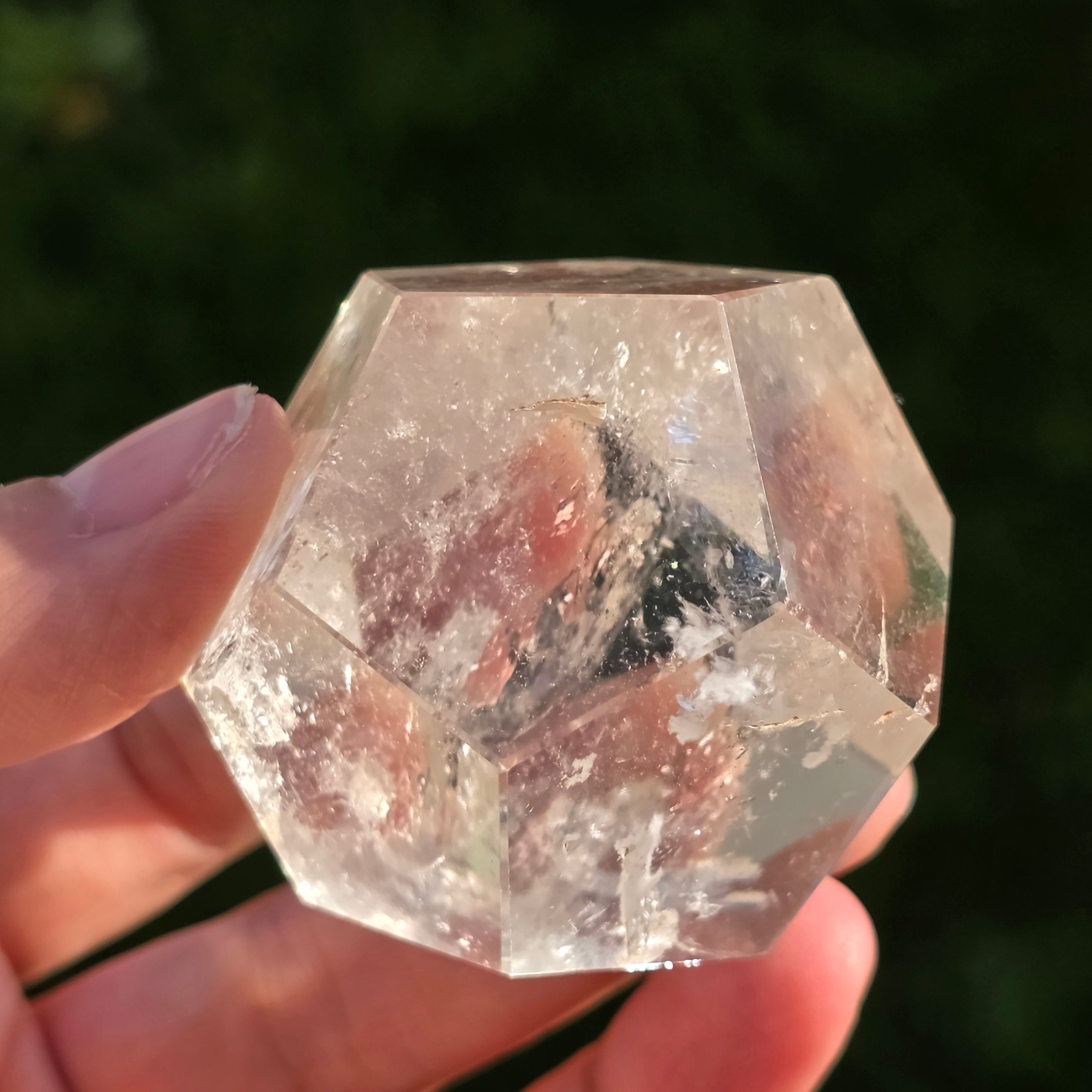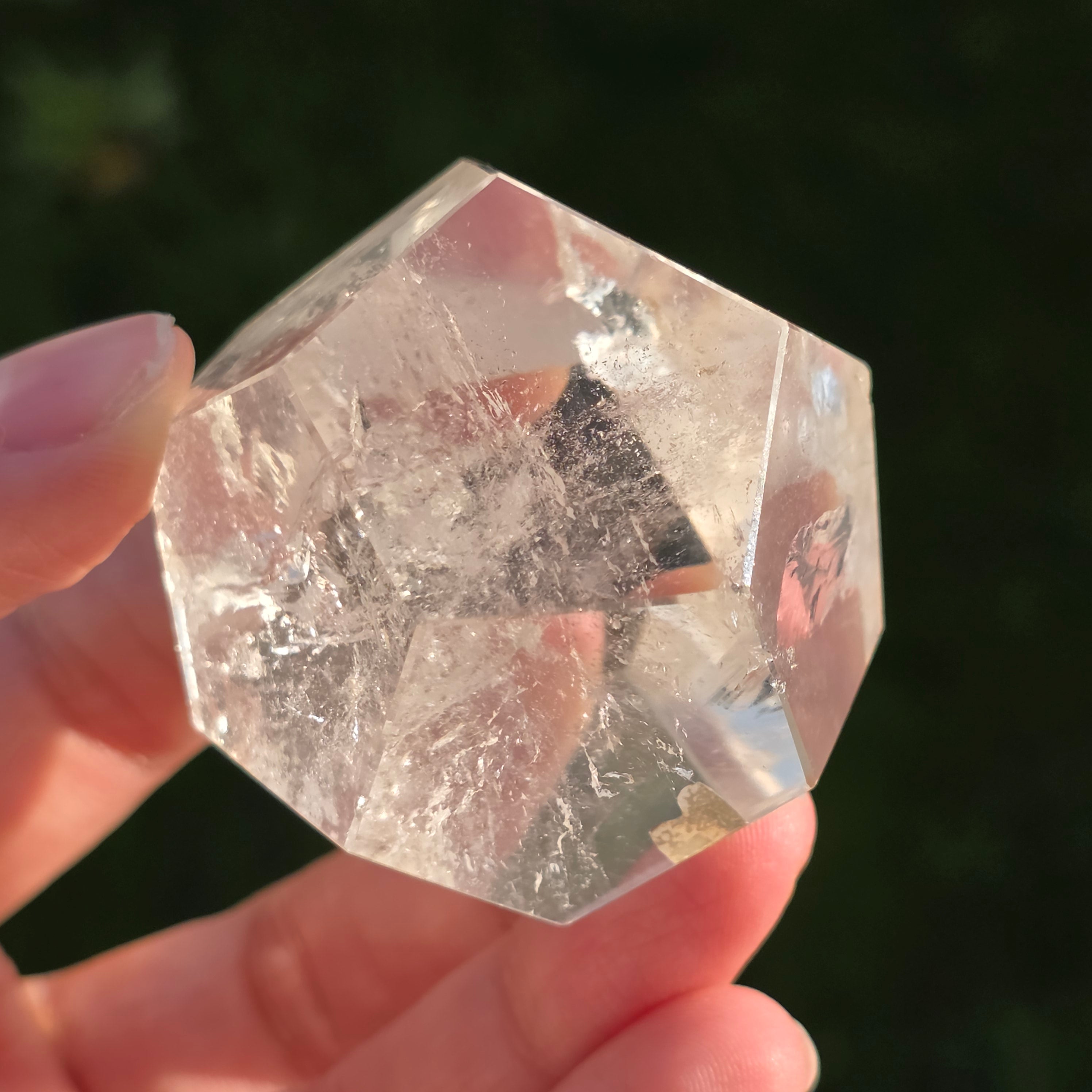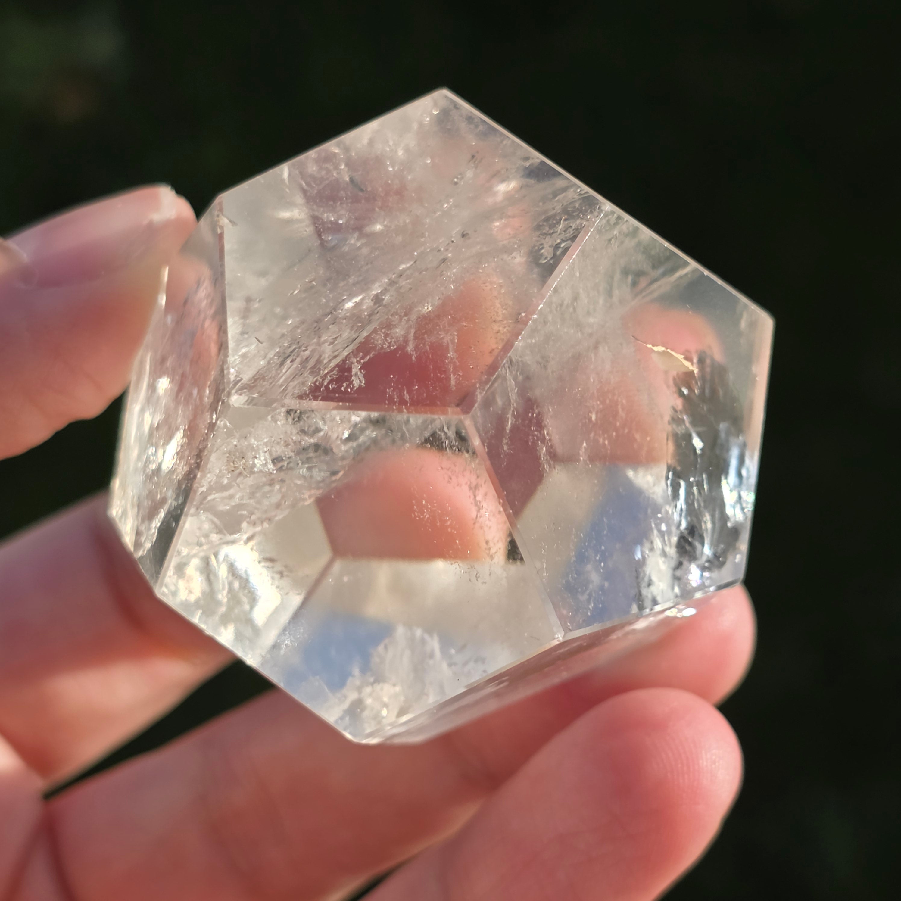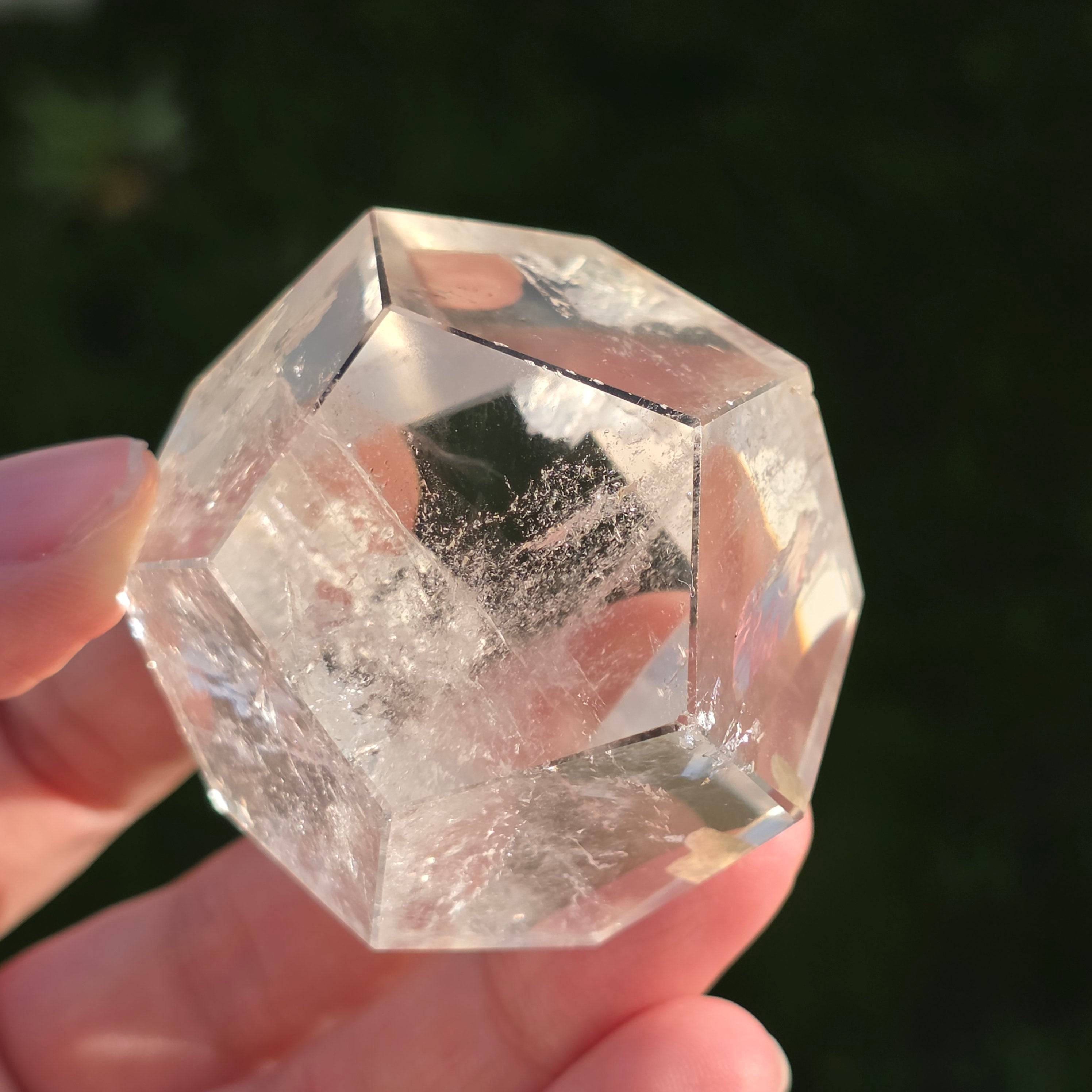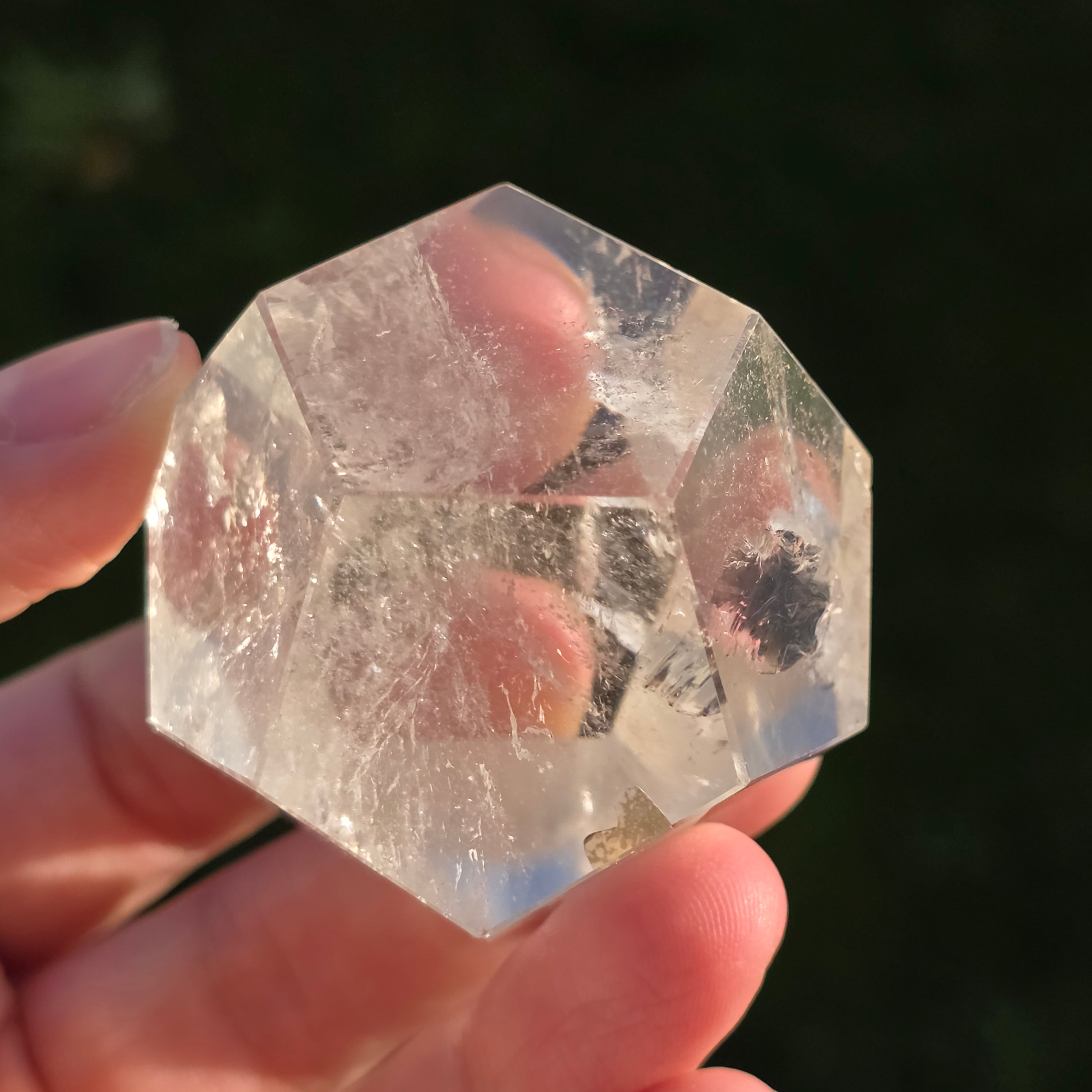 Icosaedru din cuarț incolor (cristal de stâncă), șlefuit manual cu precizie în formă de corp platonician cu 20 de fețe triunghiulare echilaterale.