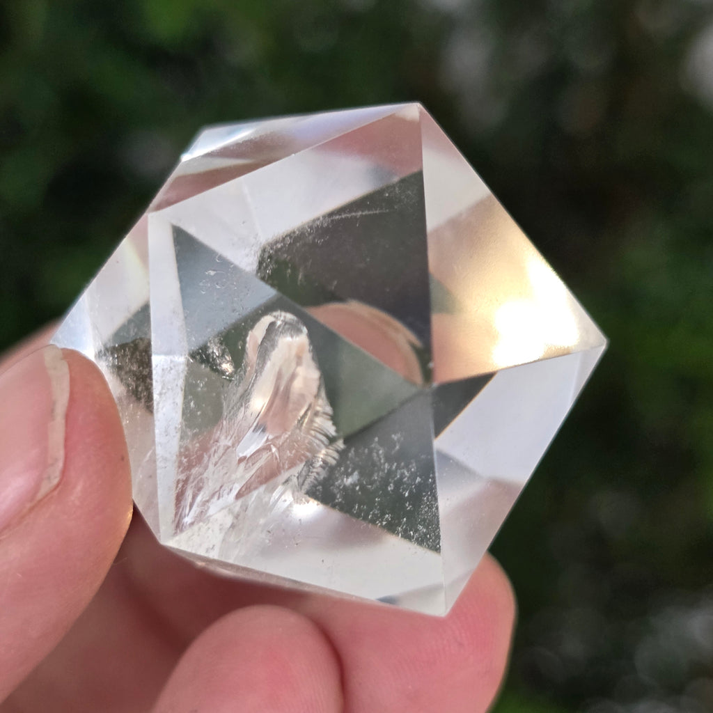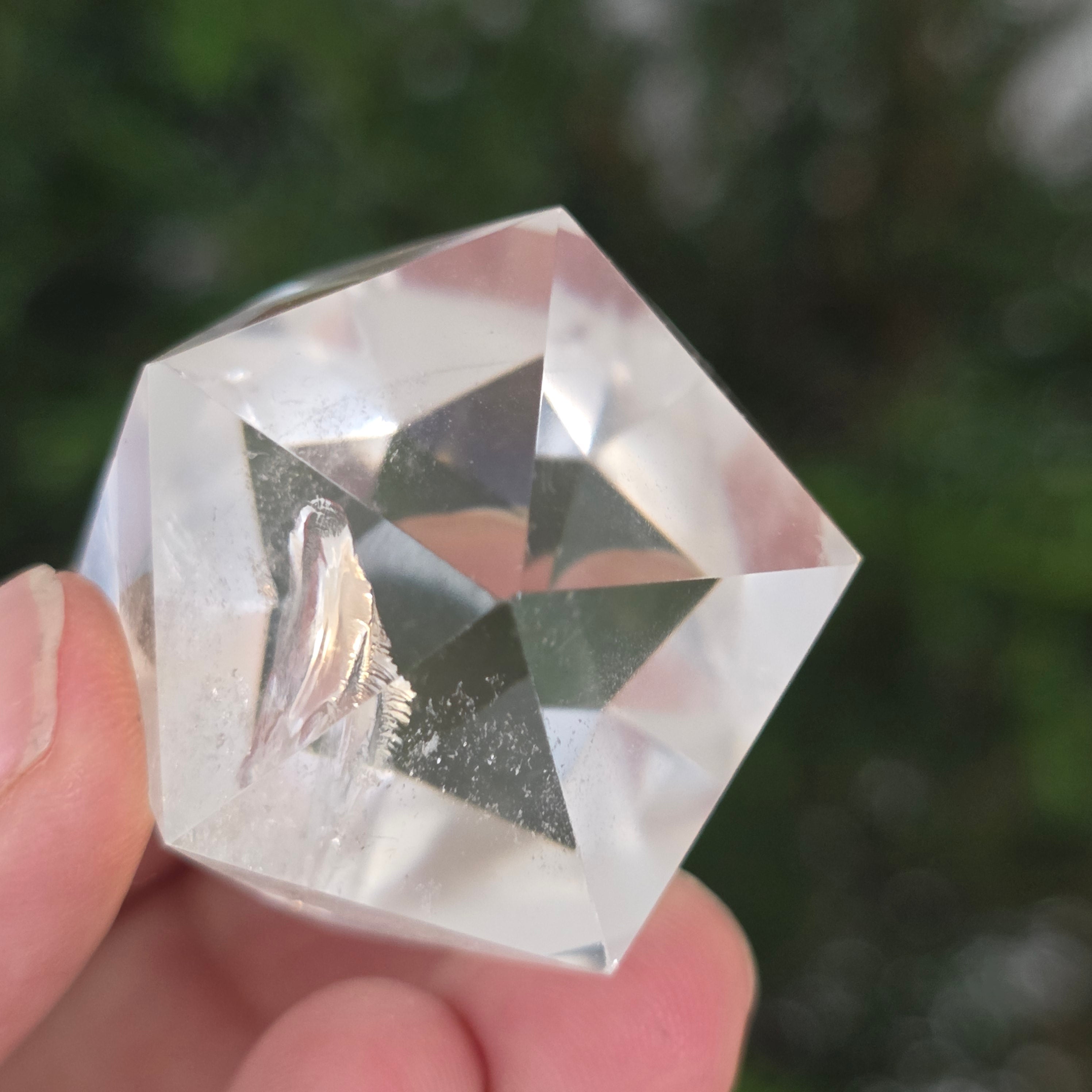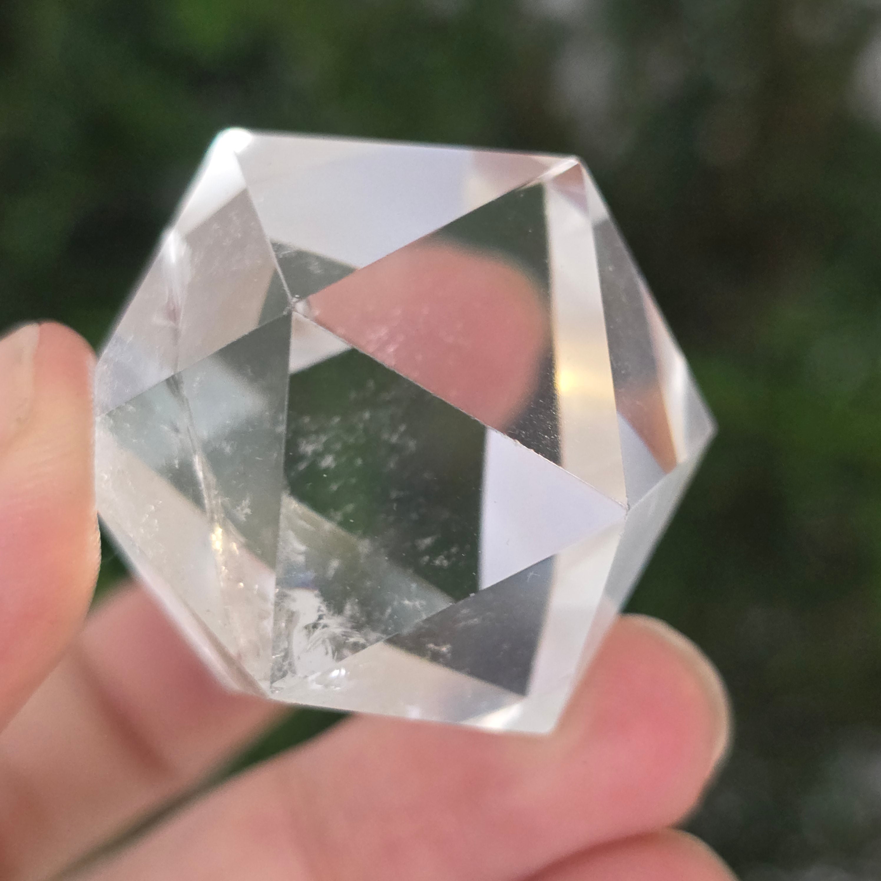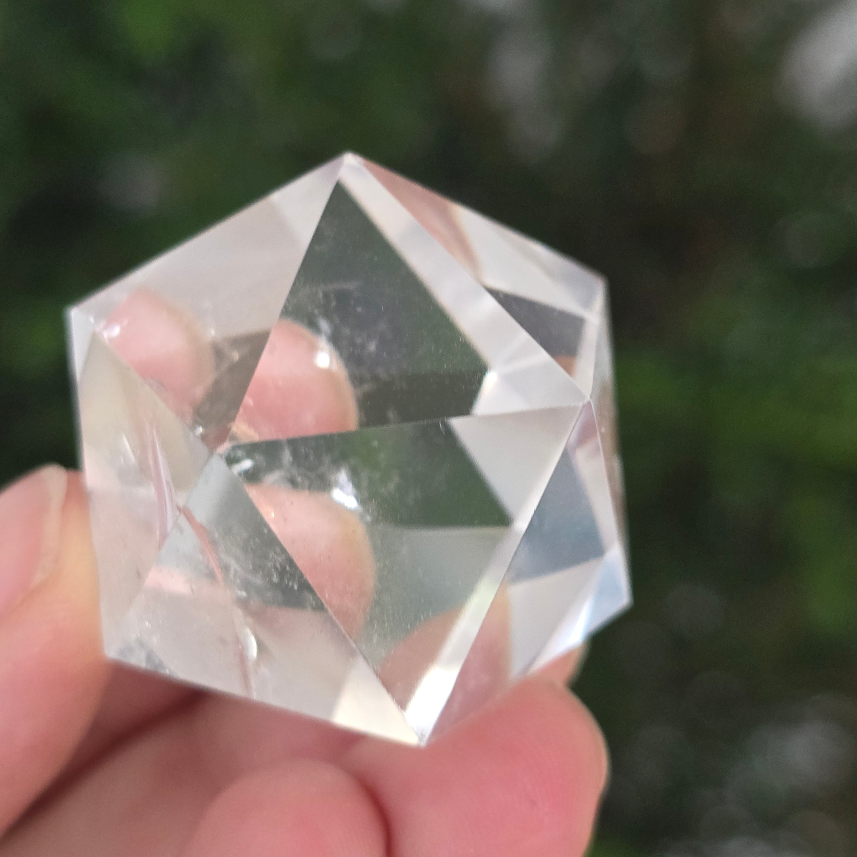 Icosaedru din cuarț incolor (cristal de stâncă), șlefuit manual cu precizie în formă de corp platonician cu 20 de fețe triunghiulare echilaterale.